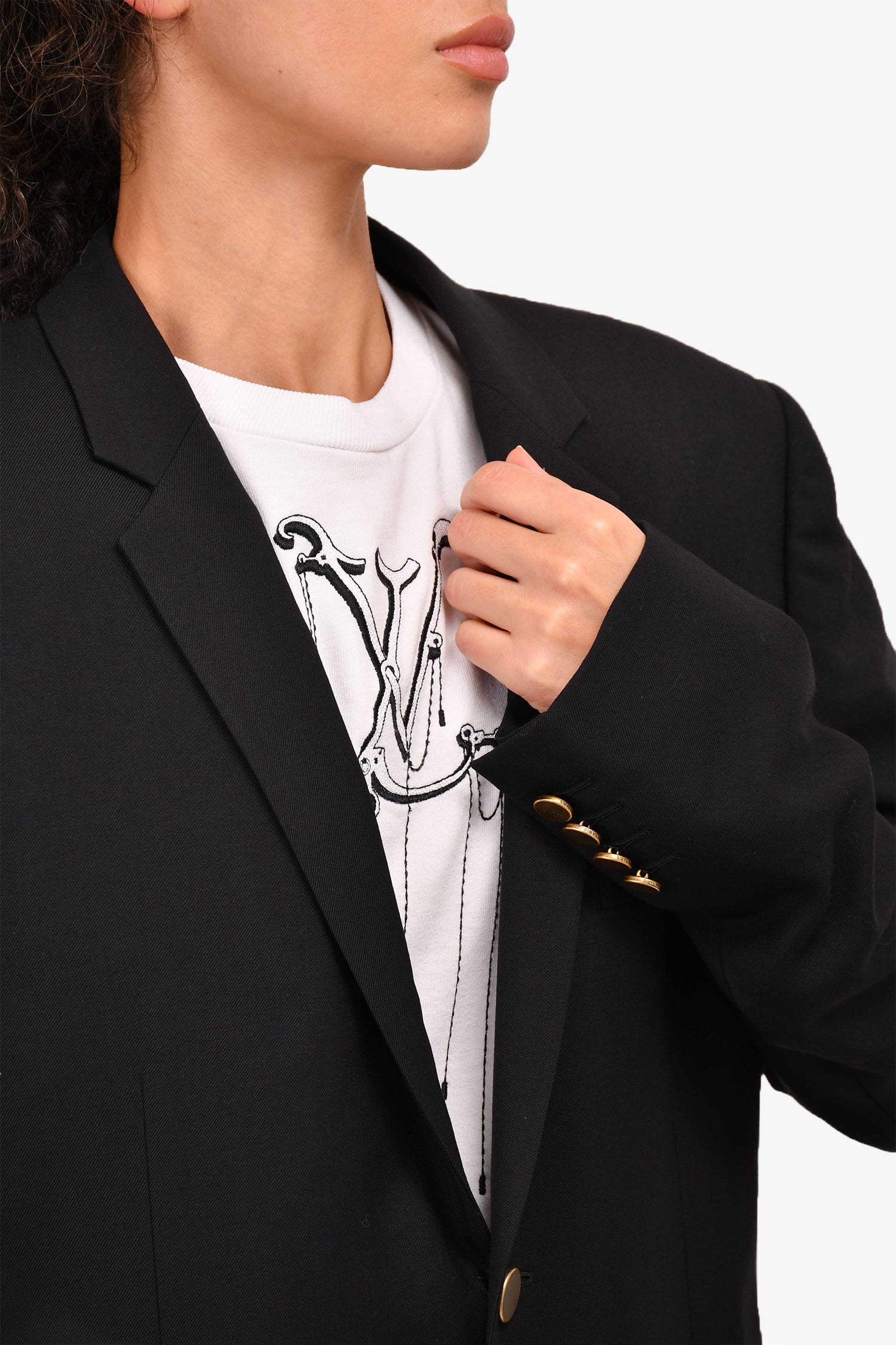 Refresh availabilitySaint Laurent Black Single Breasted Blazer. Single breasted. 2 hardware buttons. Tonal stitching. Silk lined interior.