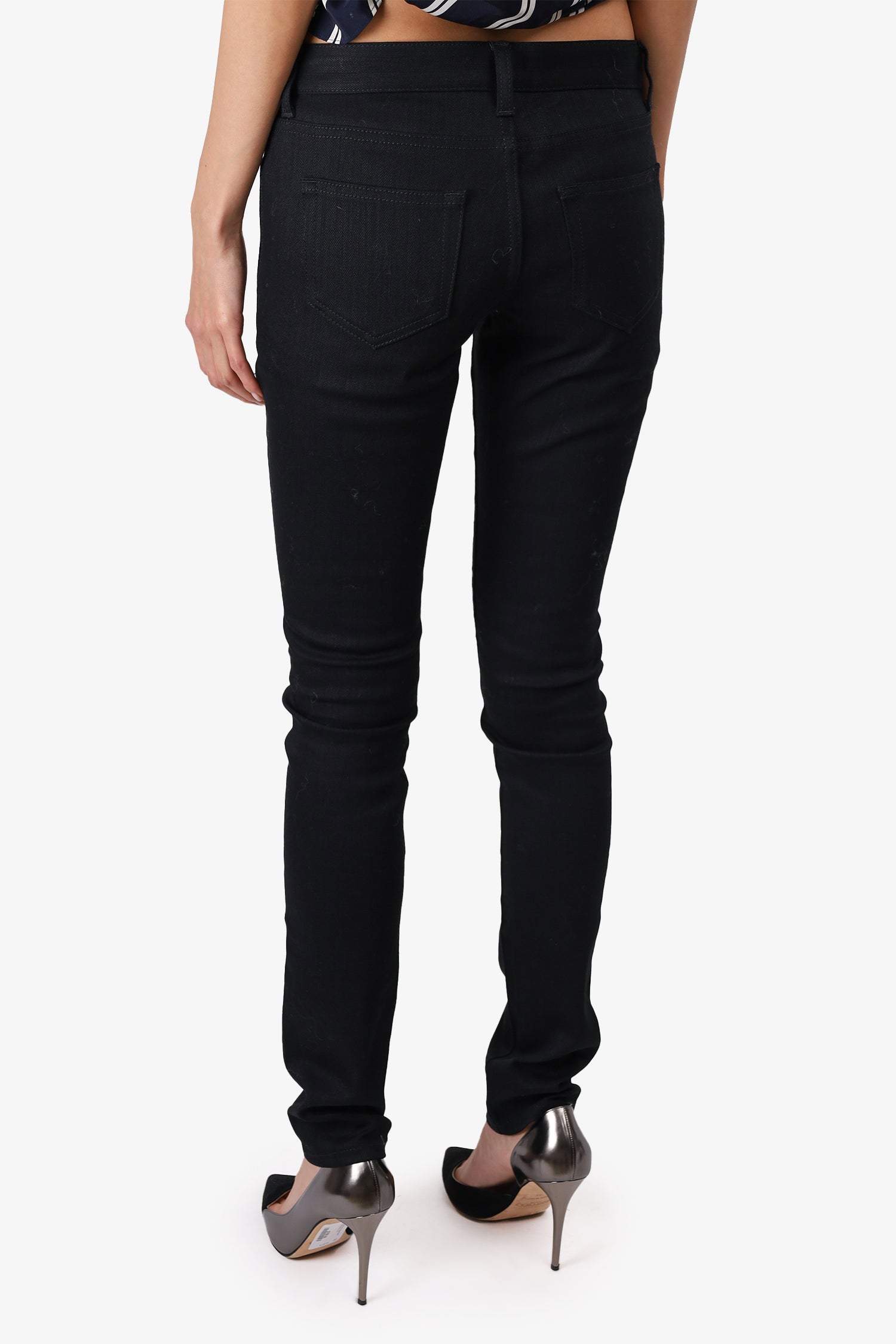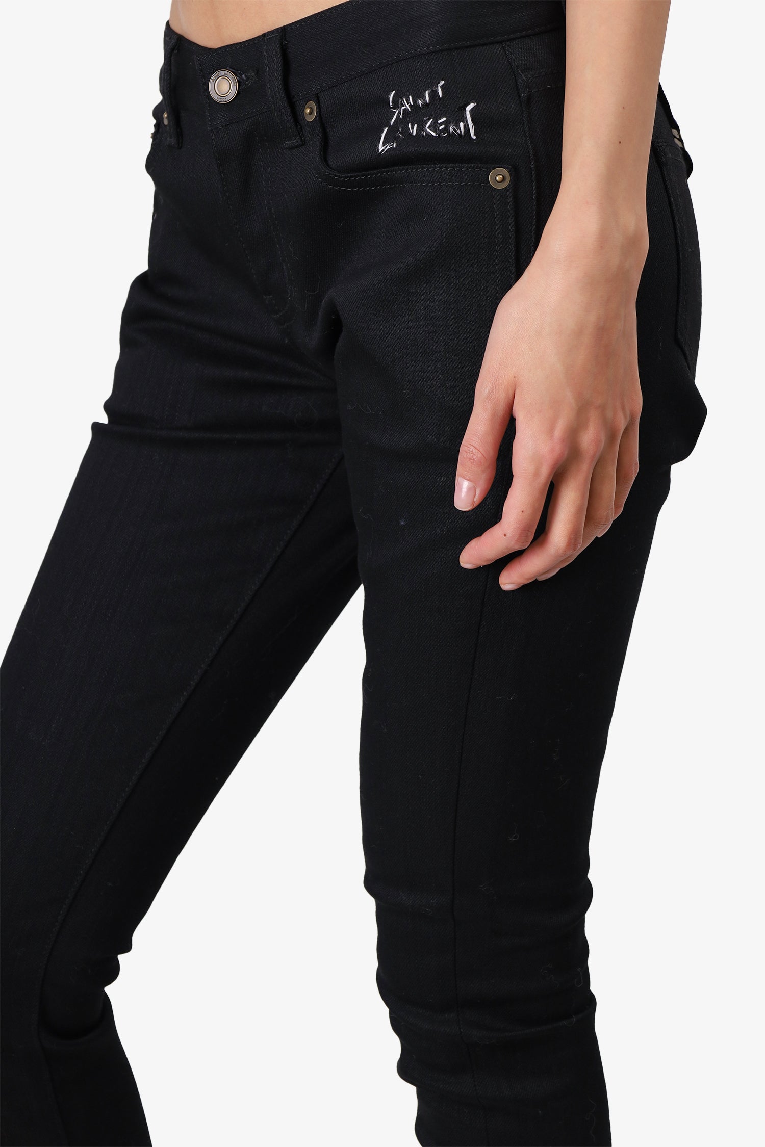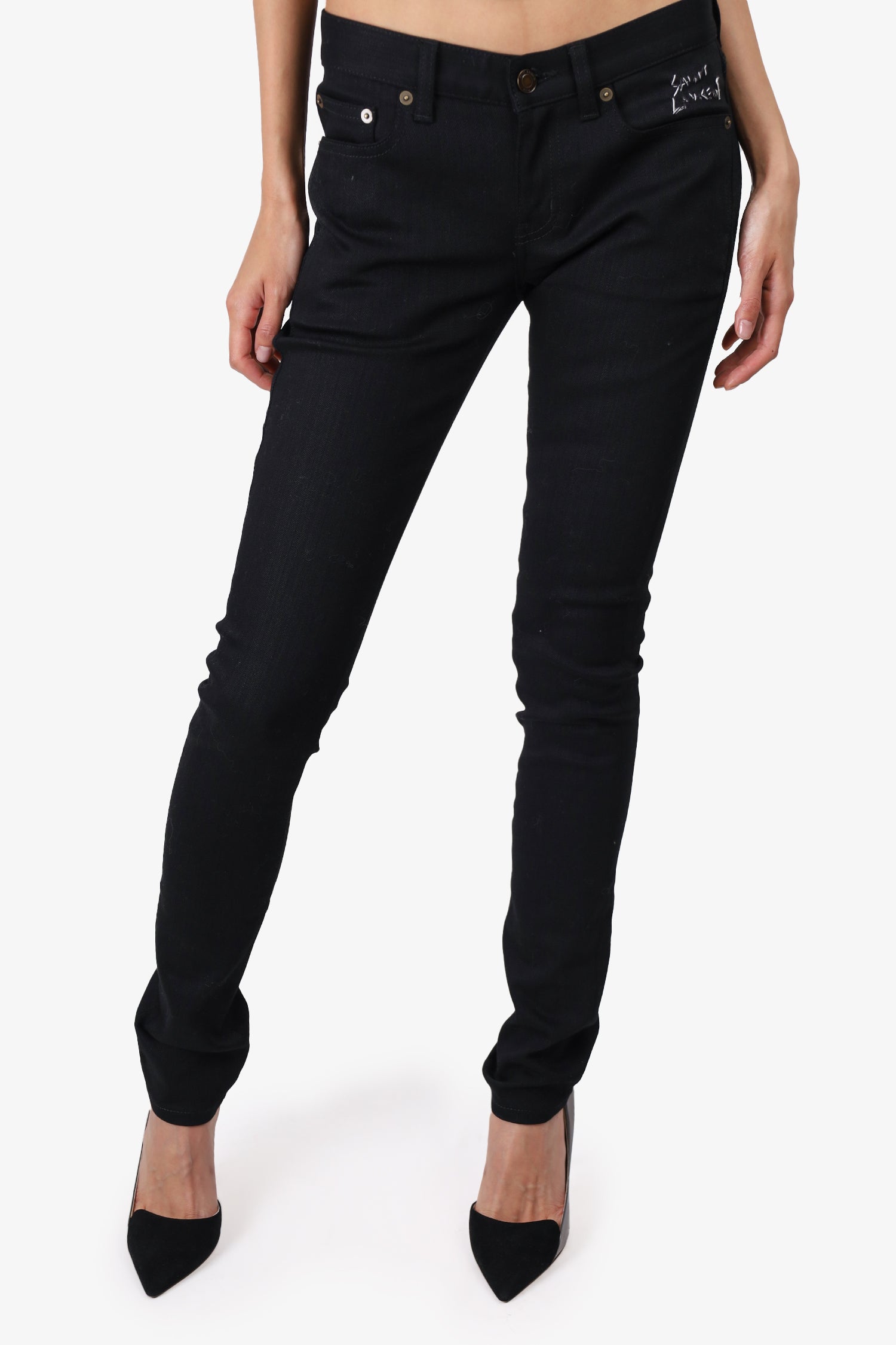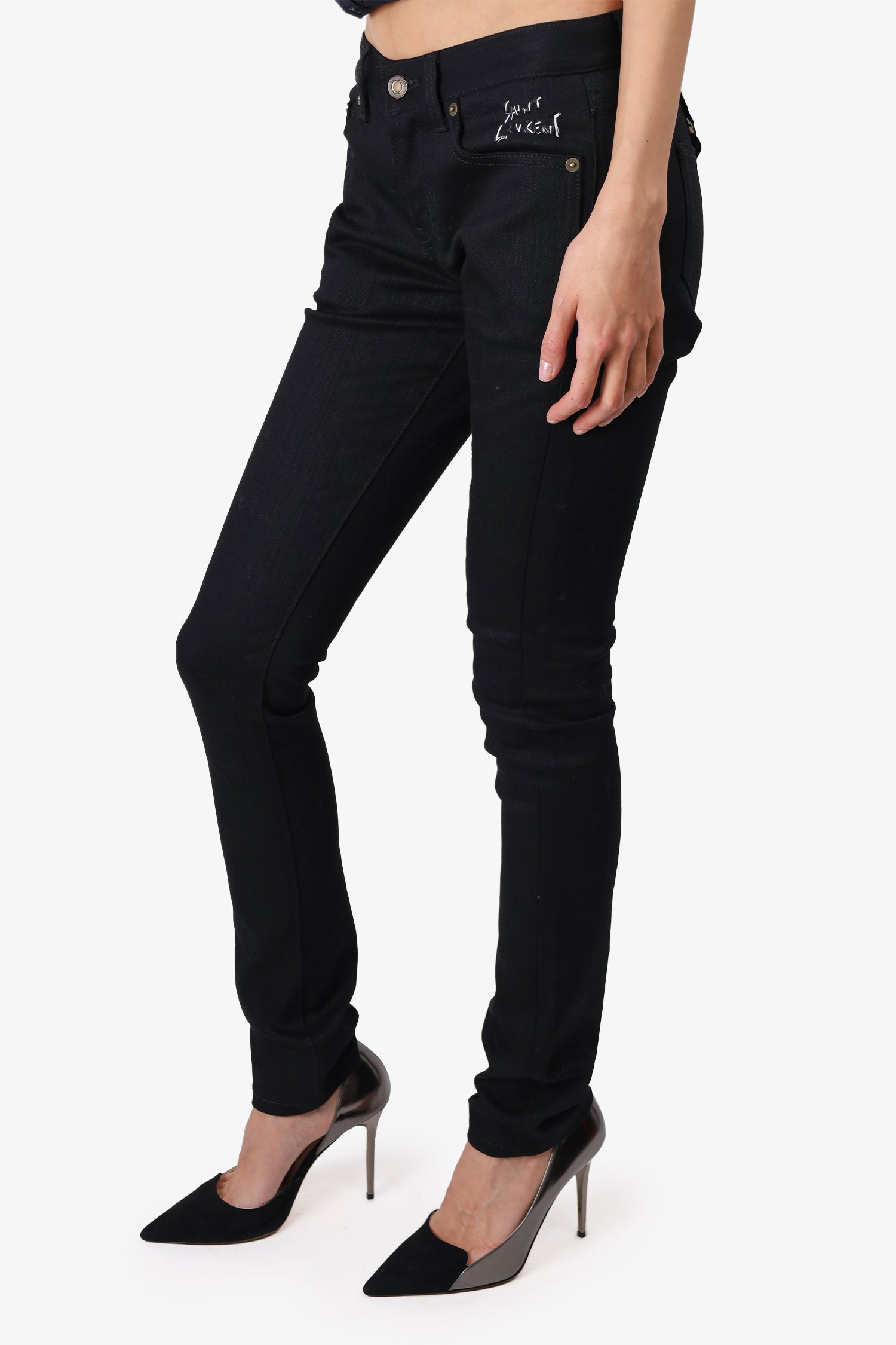 Refresh availabilitySaint Laurent Black Skinny Jeans. Front button and zip closure. Front and rear slip pockets. Waist belt loops. Tonal stitching.