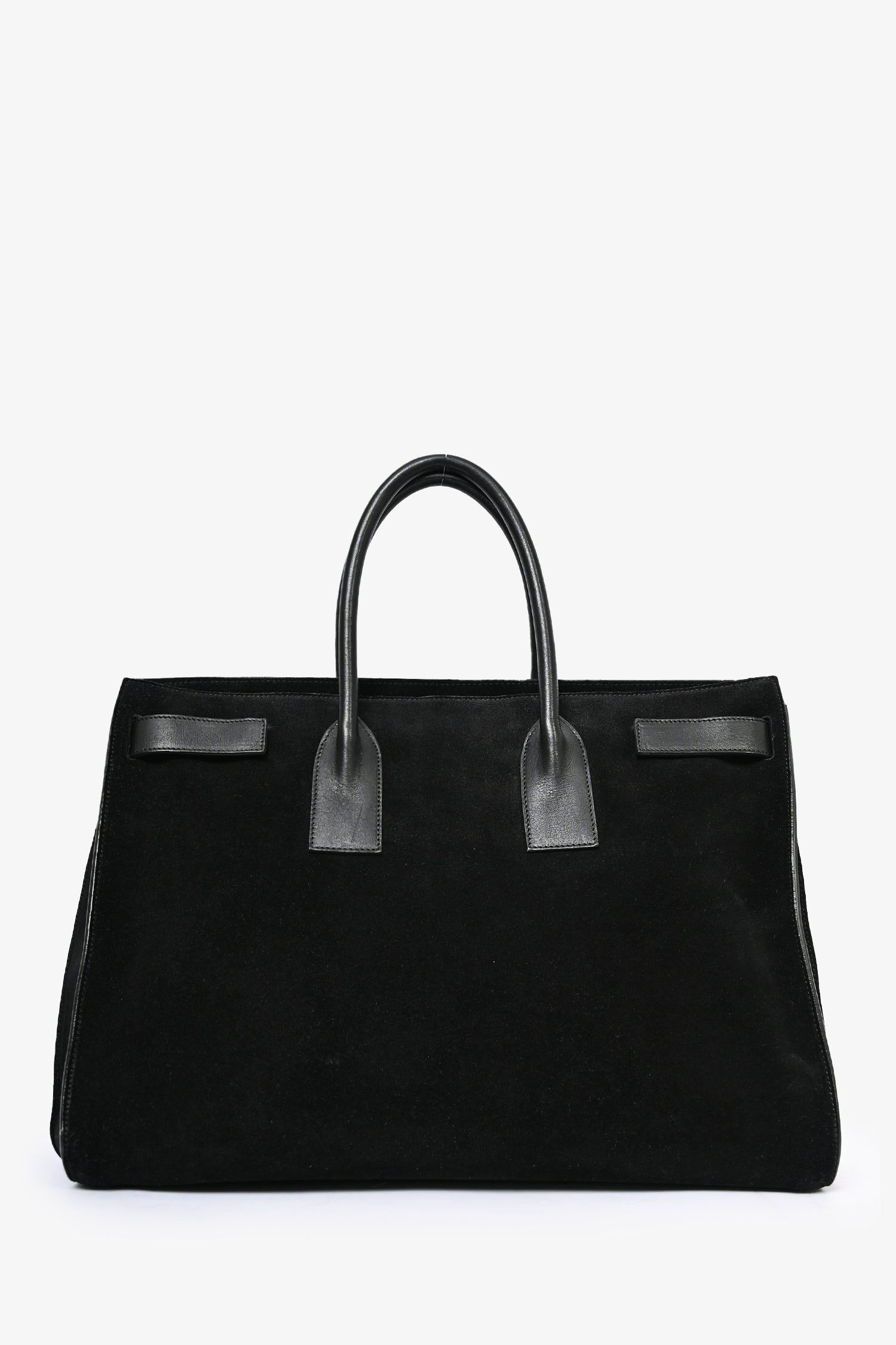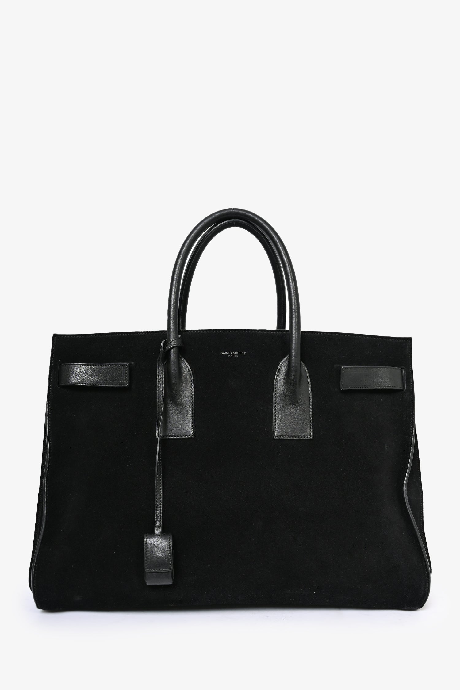 Refresh availabilitySaint Laurent Black Suede/Leather Large Sac De Jour Tote. Tonal stitching. Rolled handles. Leather trimming. 2 zipped interior compartments. Dual interior pockets. Accordion sides.