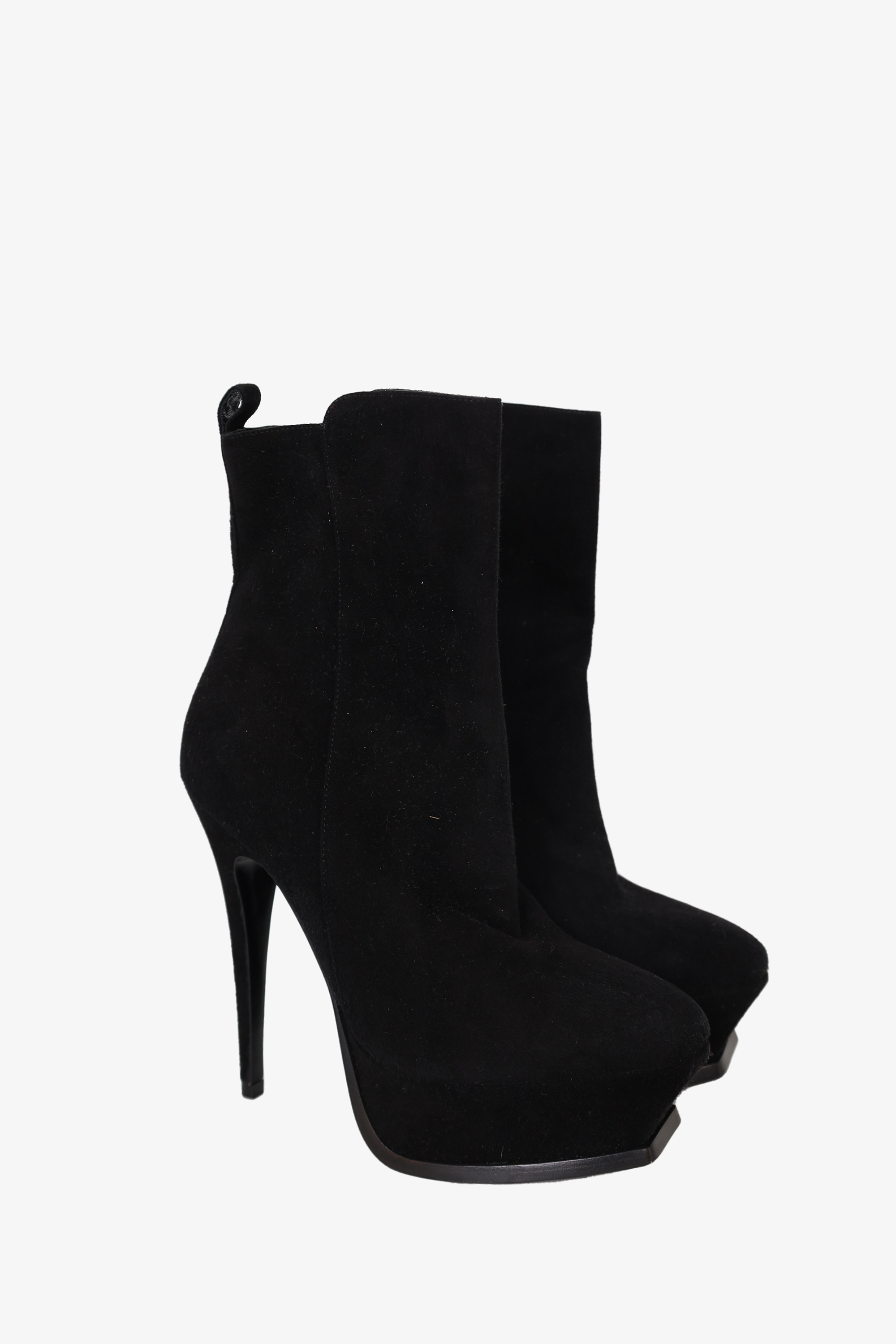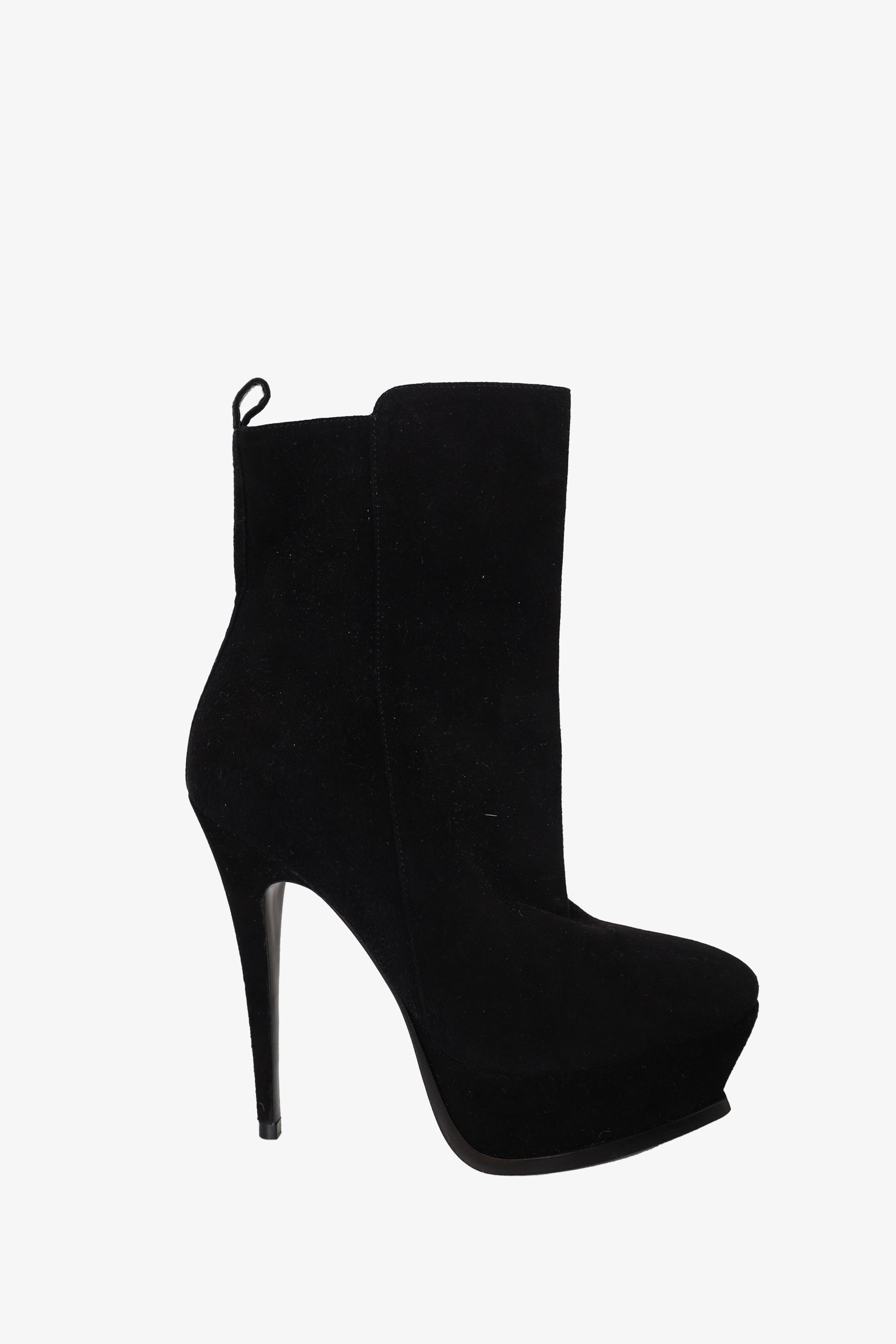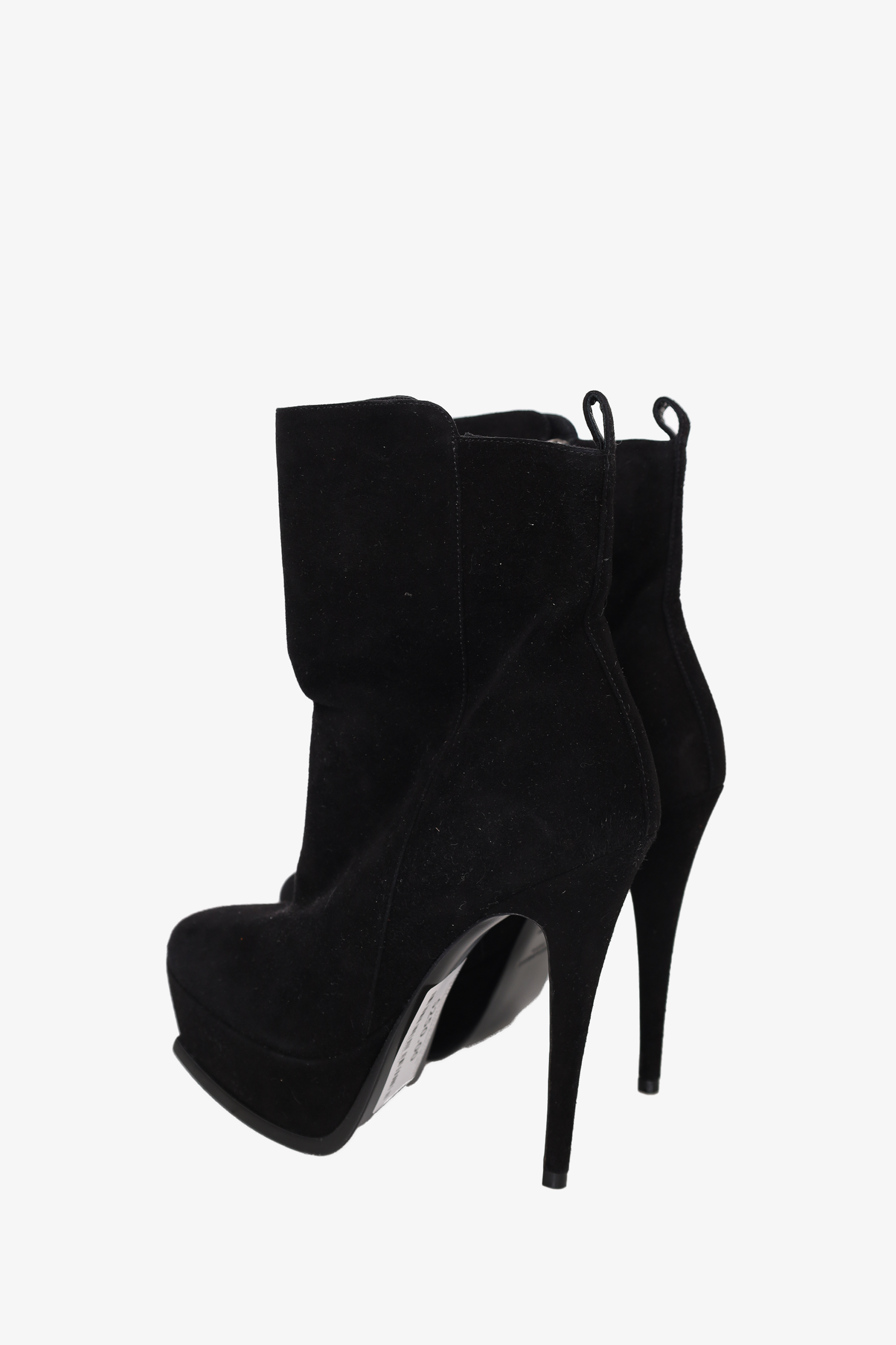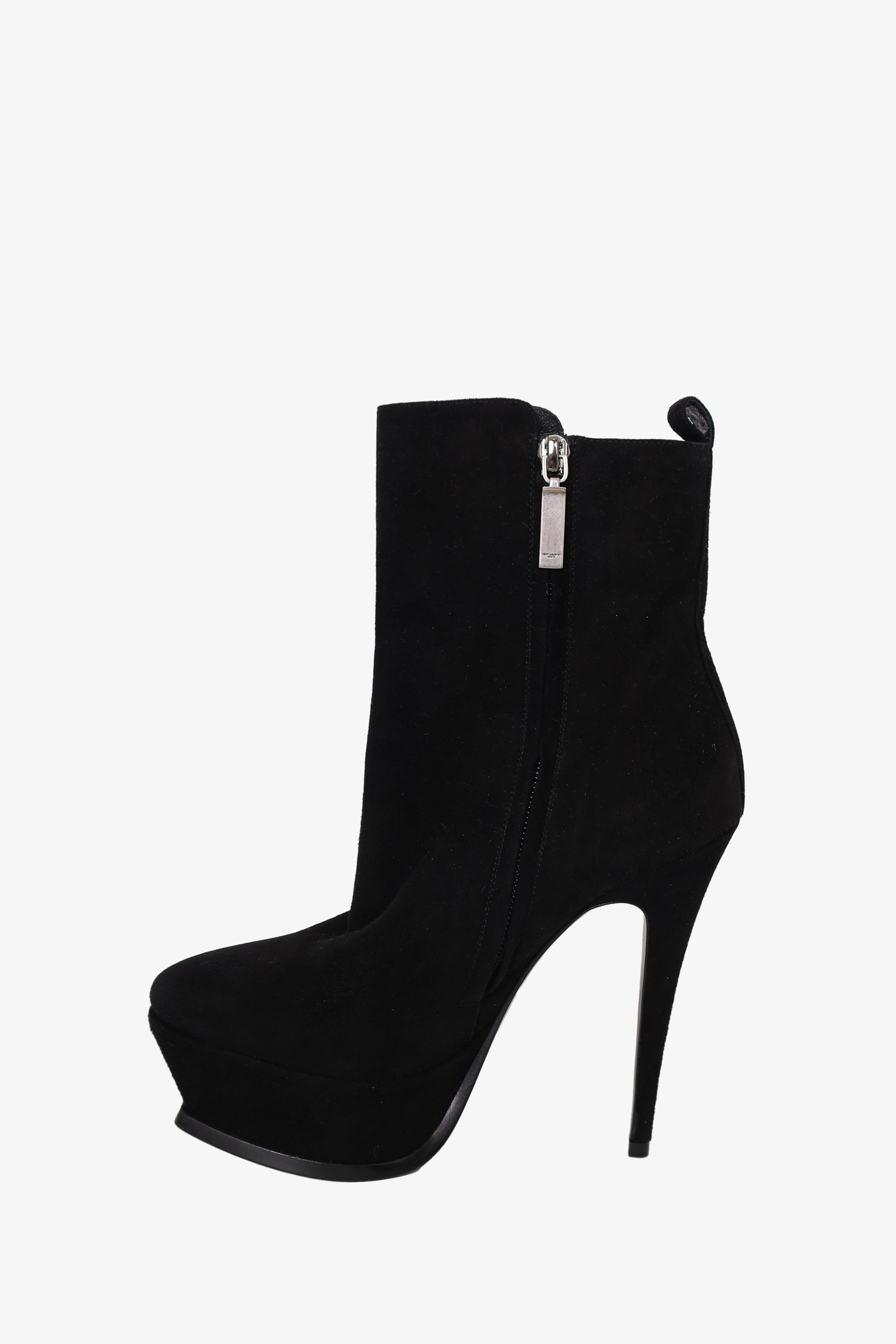 Refresh availabilitySaint Laurent Black Suede Platform Ankle Boots. Platform round-toe. Silver-toned hardware. Stiletto heel. Zip closure. Tonal stitching.