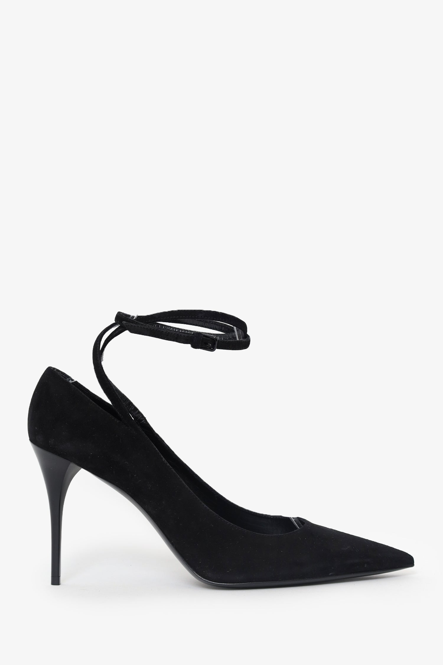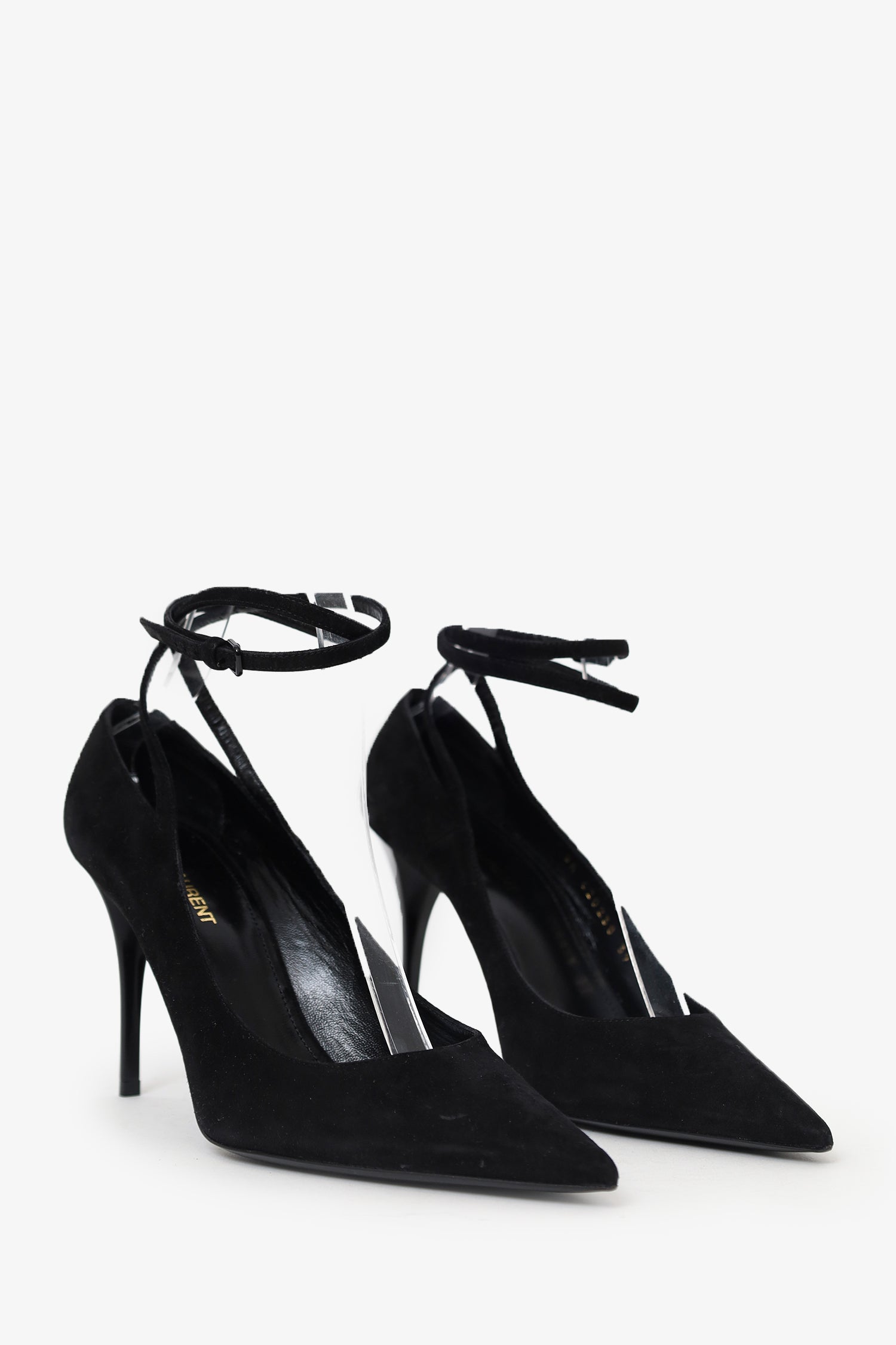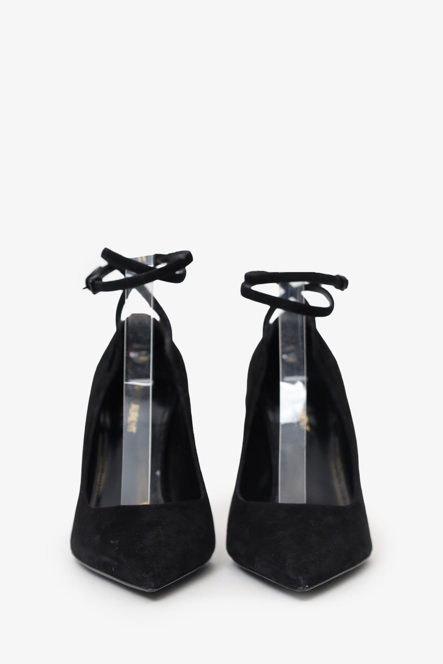 Refresh availabilitySaint Laurent Black Suede Strap Pumps. Slip-on. Pointed toe. Front tie-up strap with adjustable pull-through buckle closure. Lined interior. Tonal stitching.