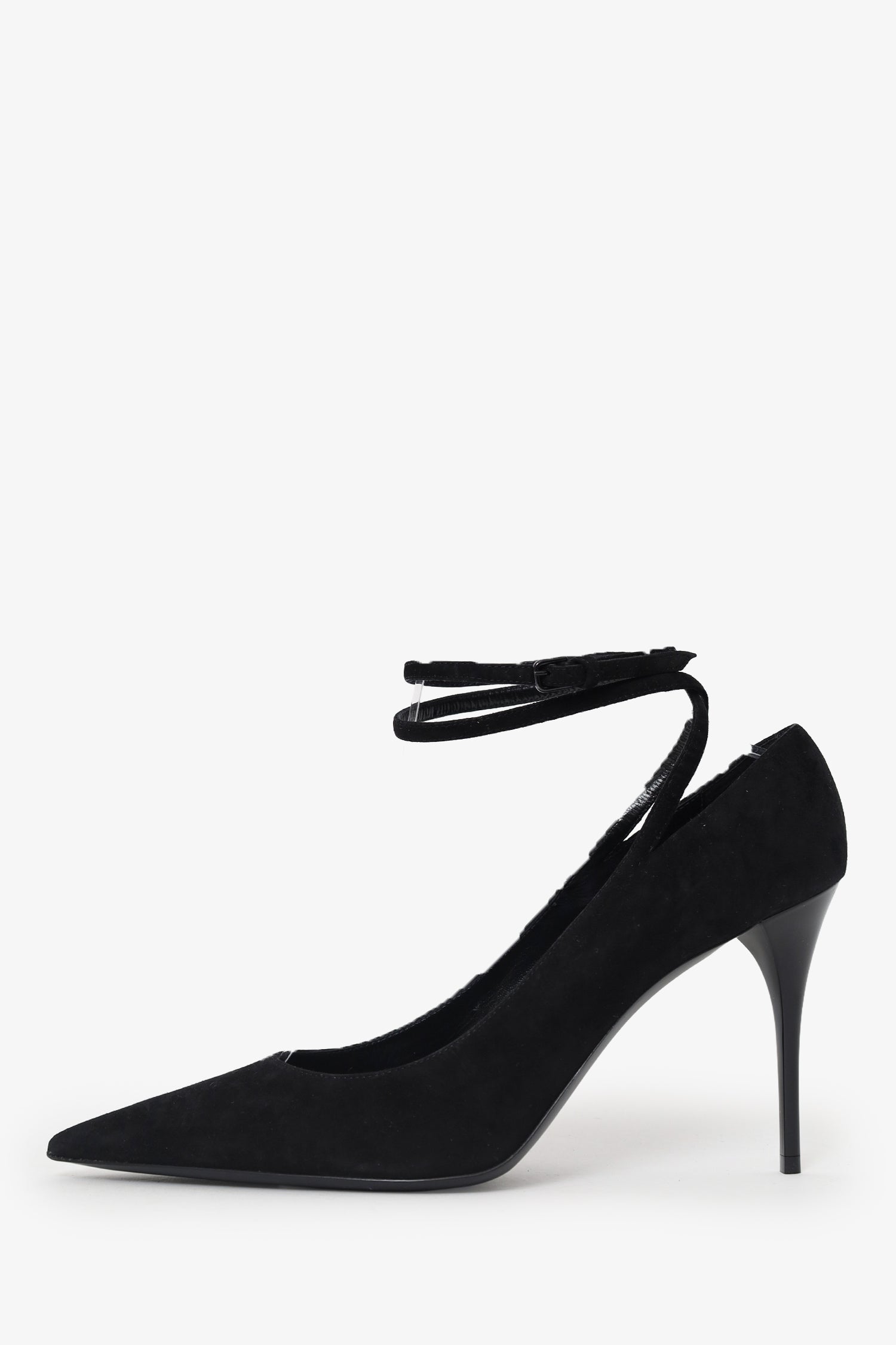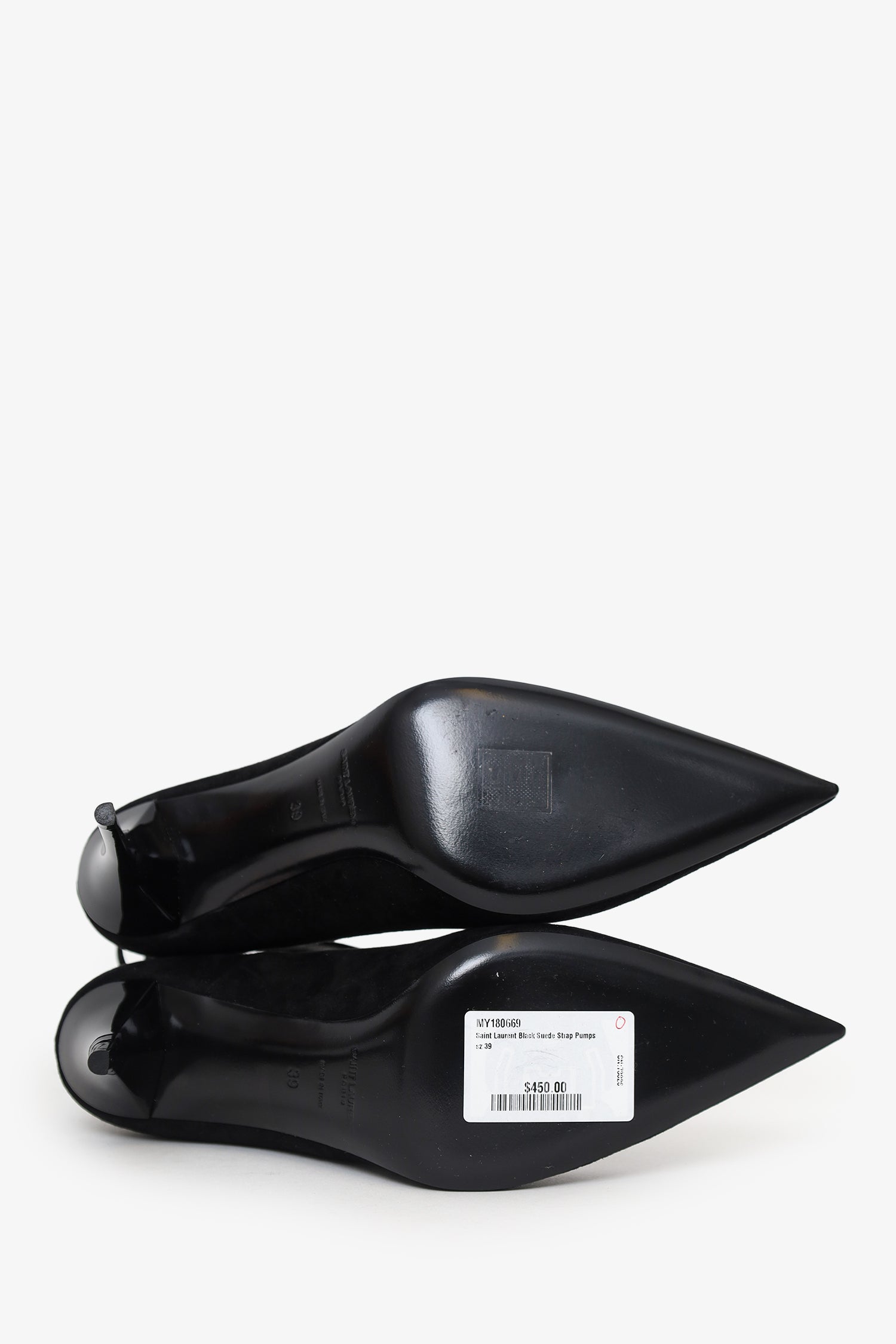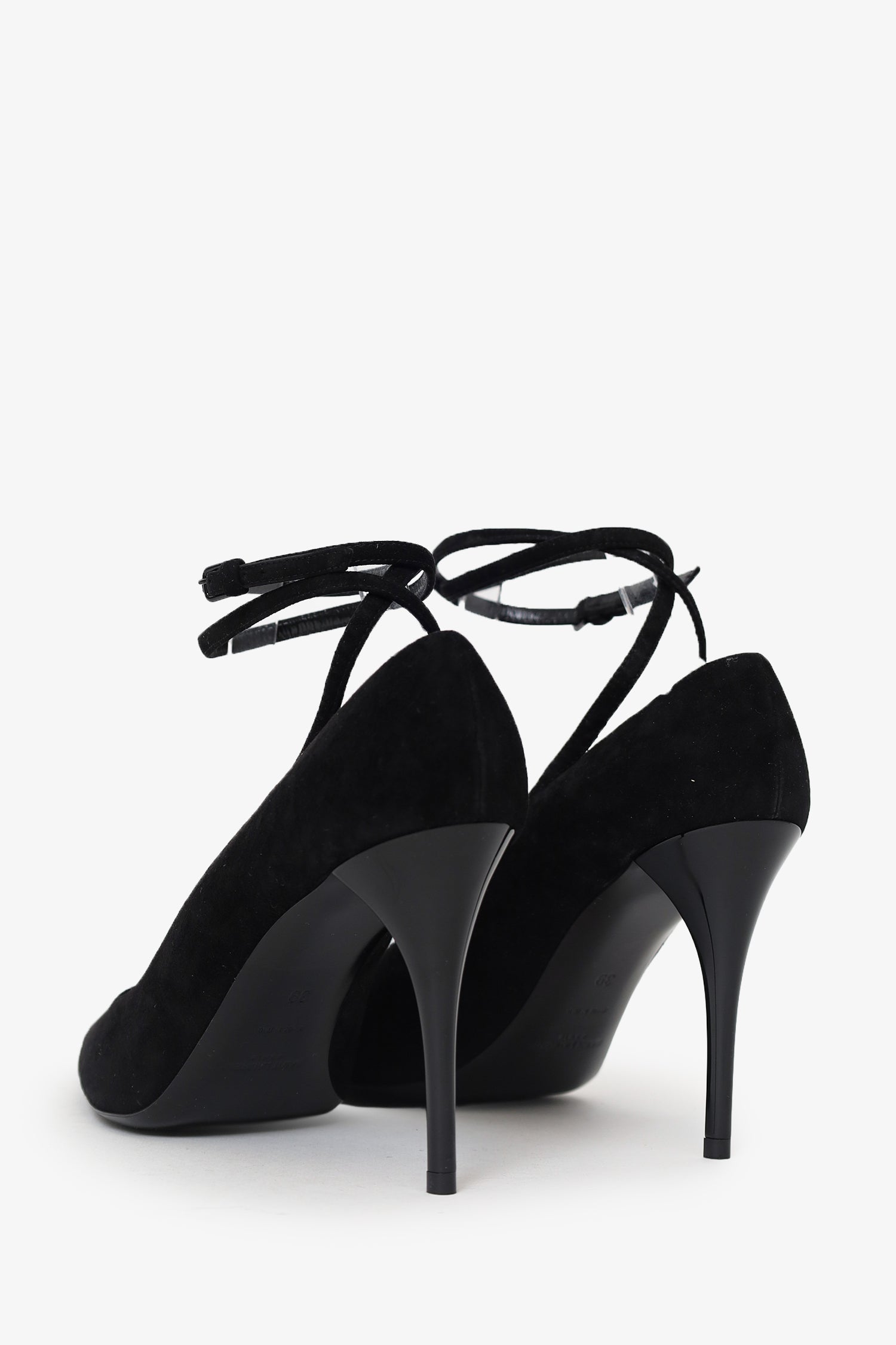 Refresh availabilitySaint Laurent Black Suede Strap Pumps. Slip-on. Pointed toe. Front tie-up strap with adjustable pull-through buckle closure. Lined interior. Tonal stitching.