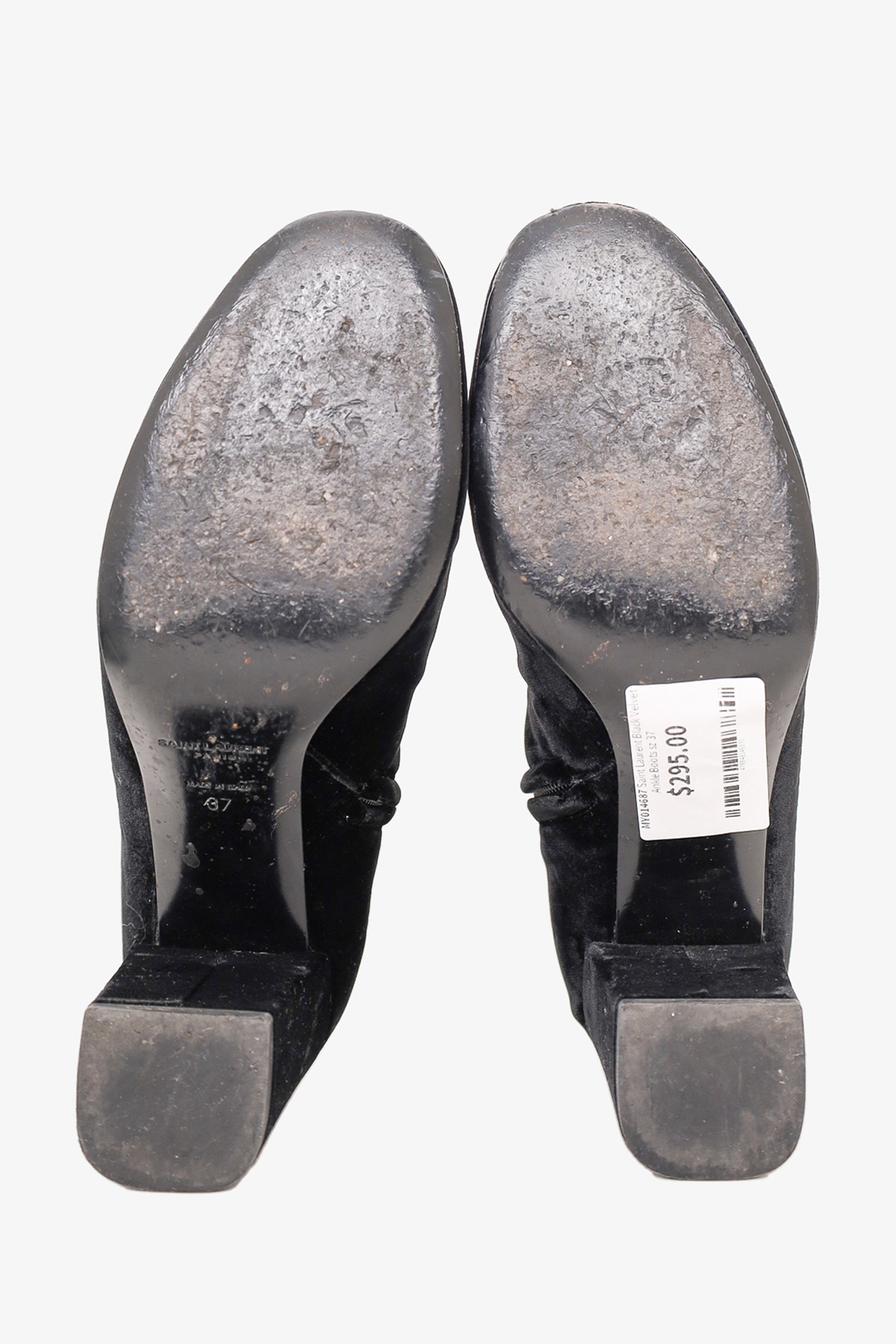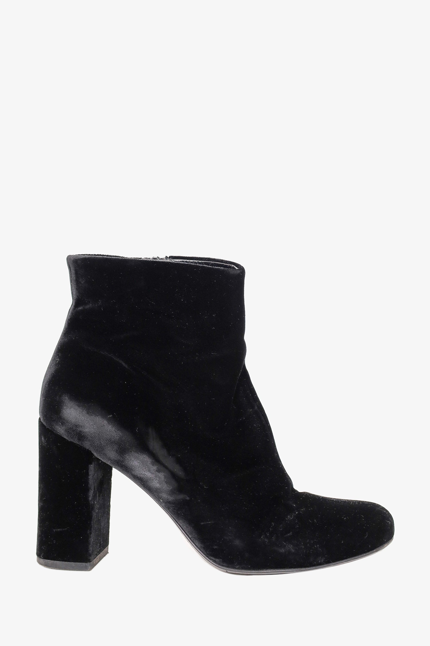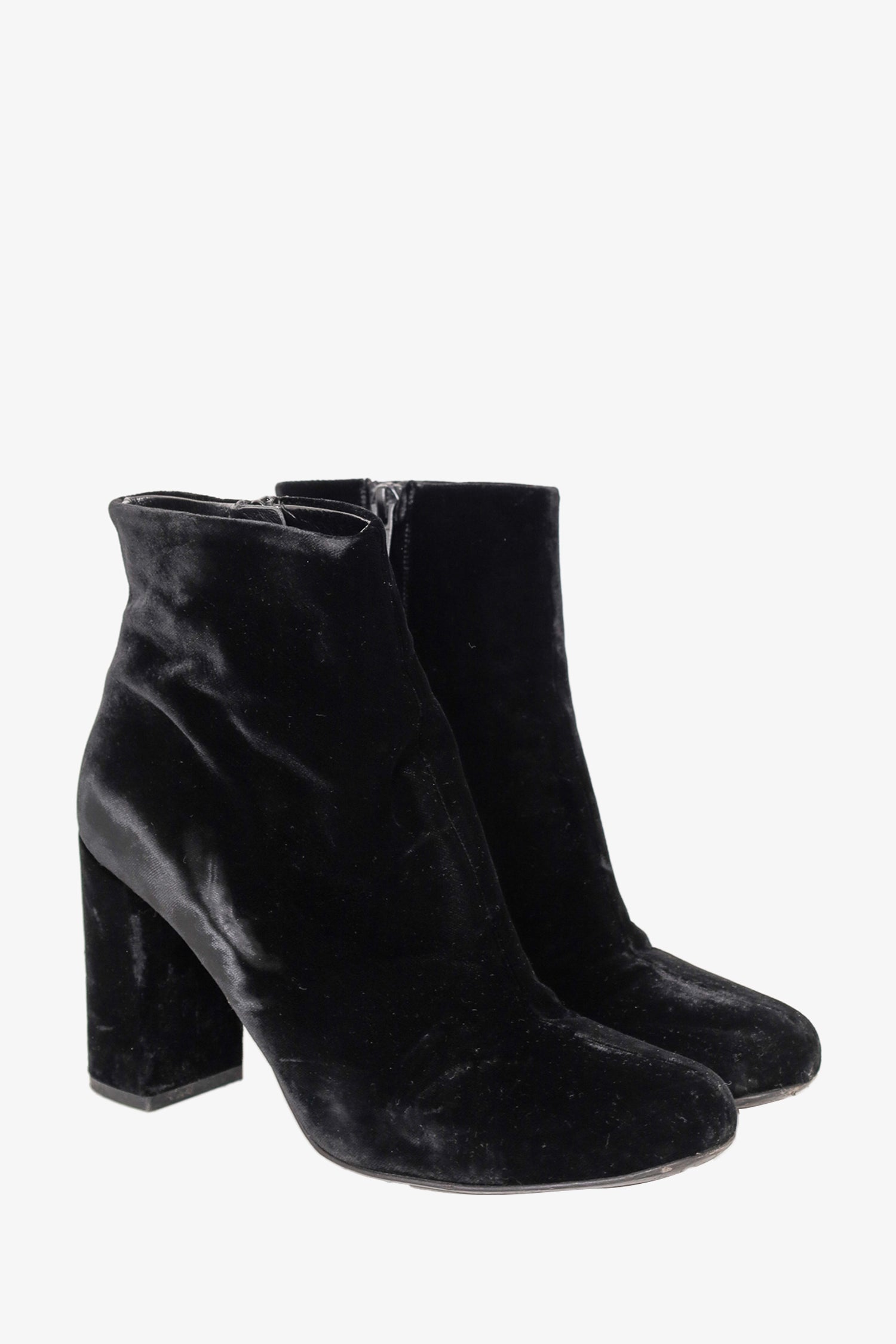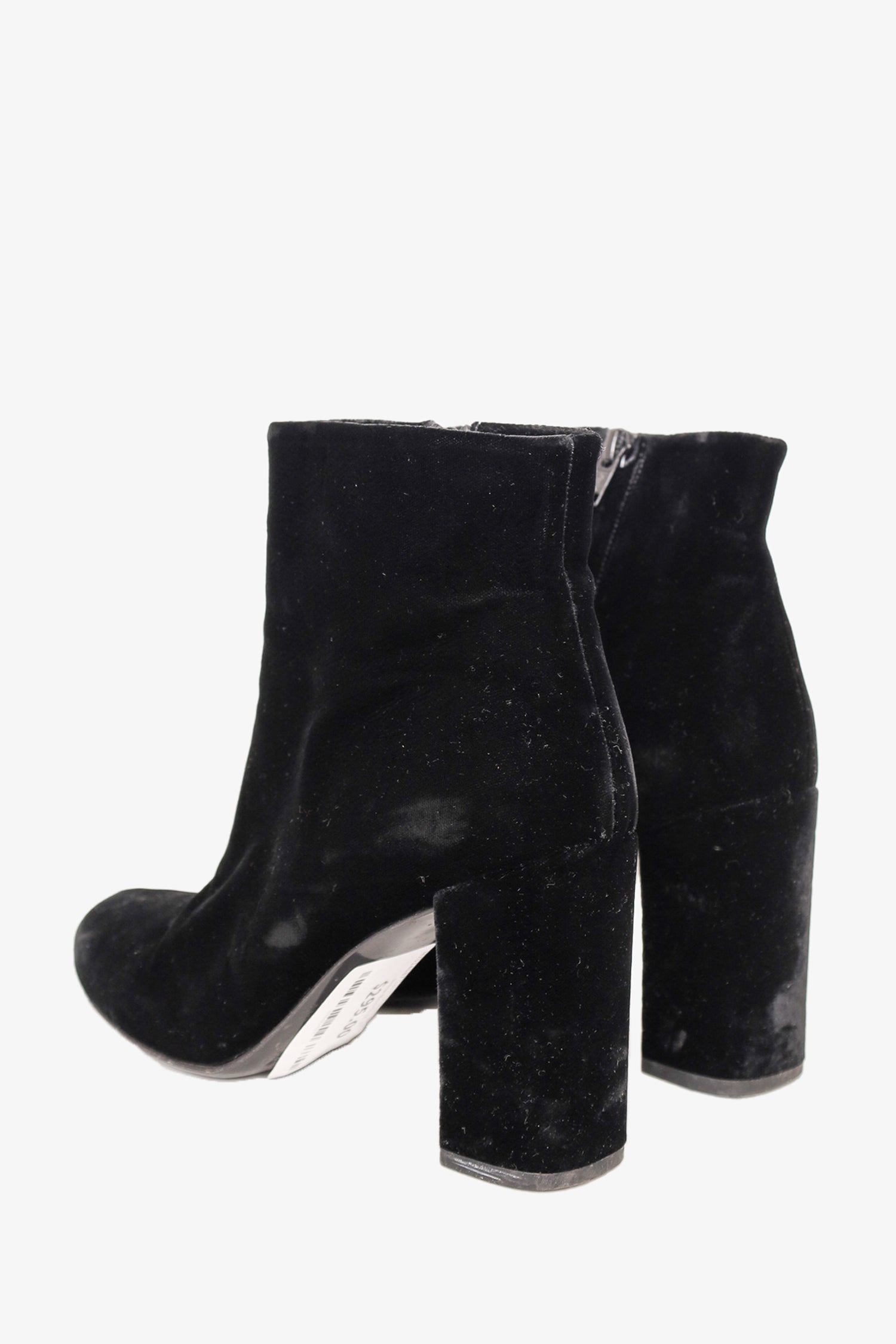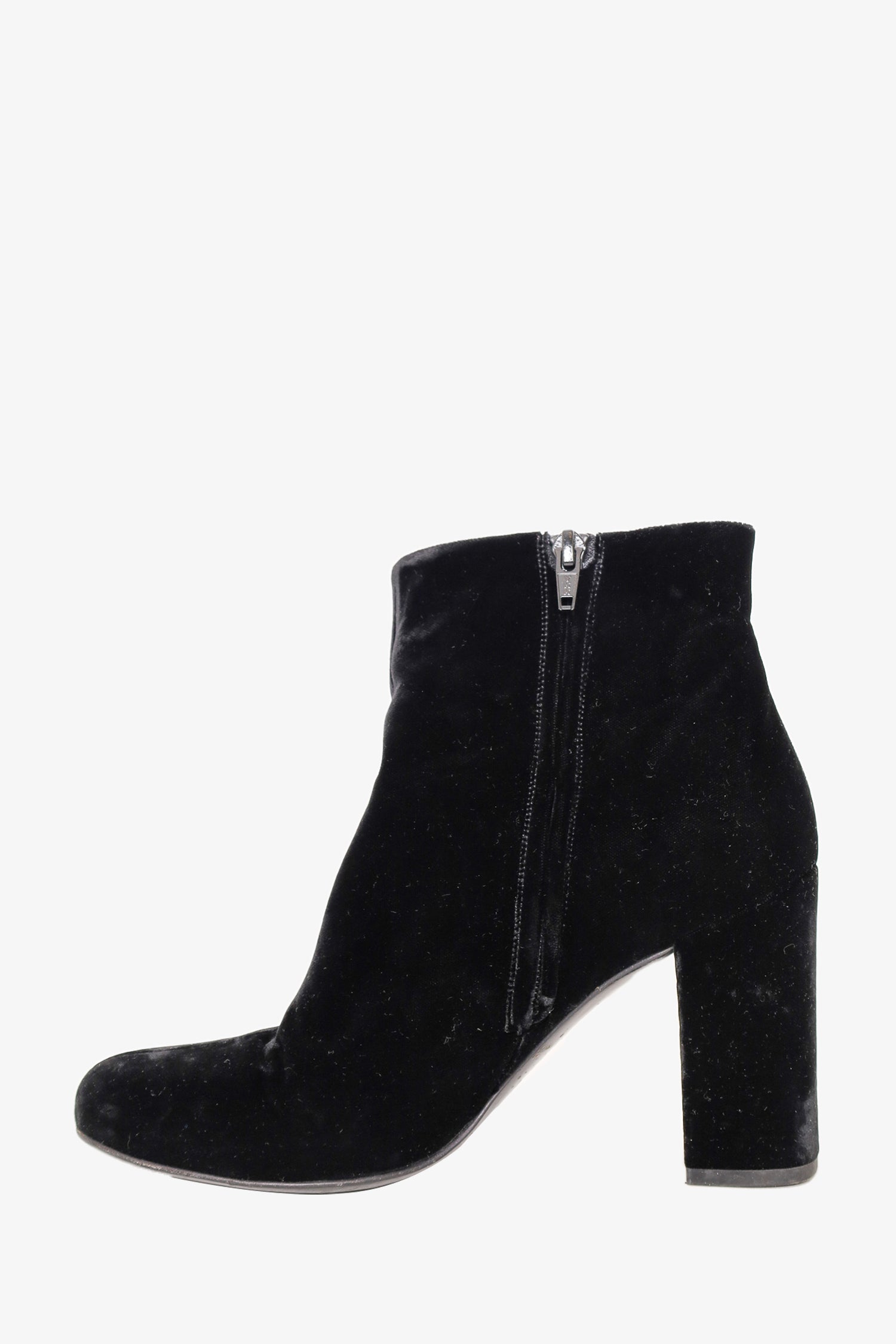 Refresh availabilitySaint Laurent Black Velvet Ankle Boots. Round toebox. Side zipper closure. Block heel. Tonal stitching.