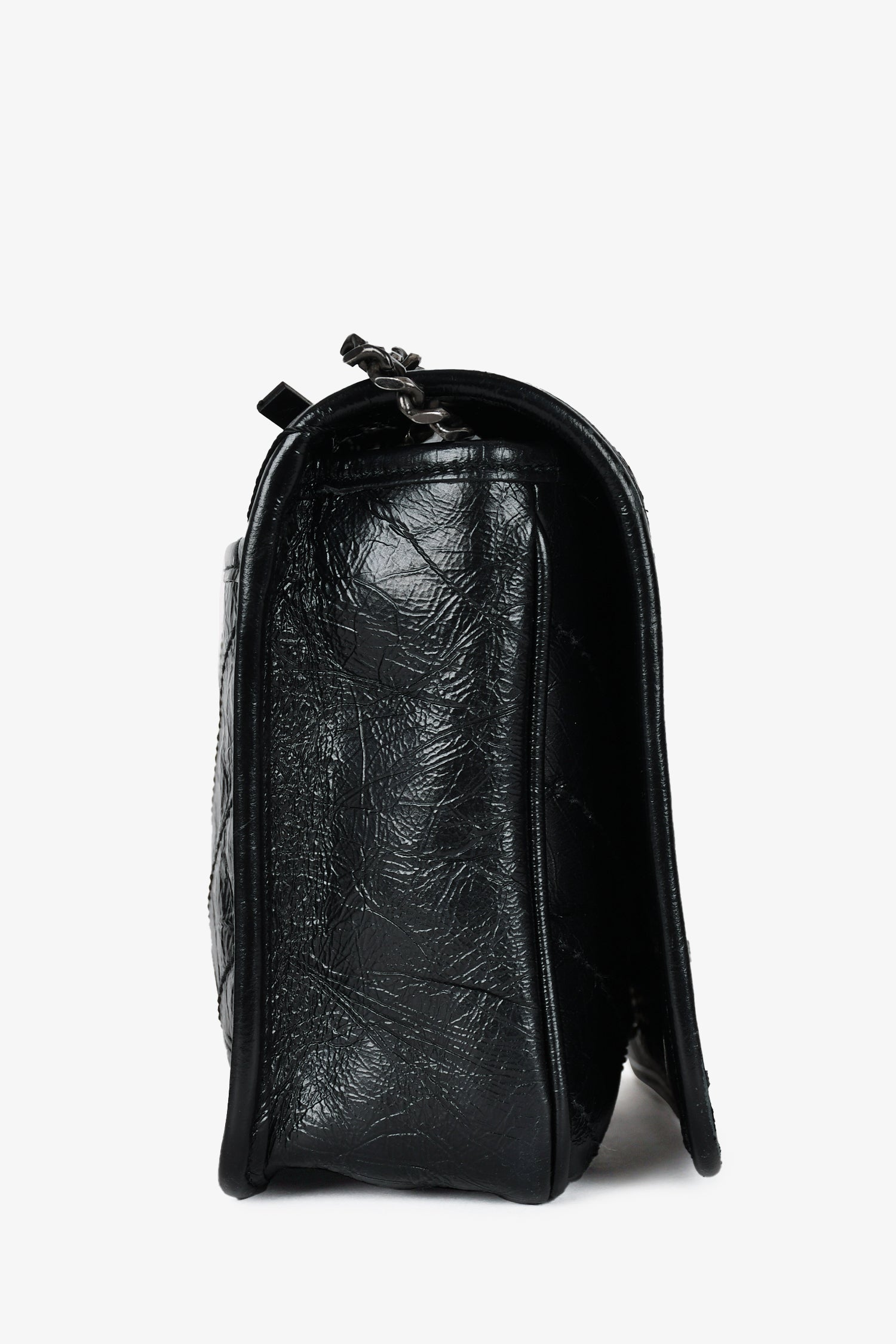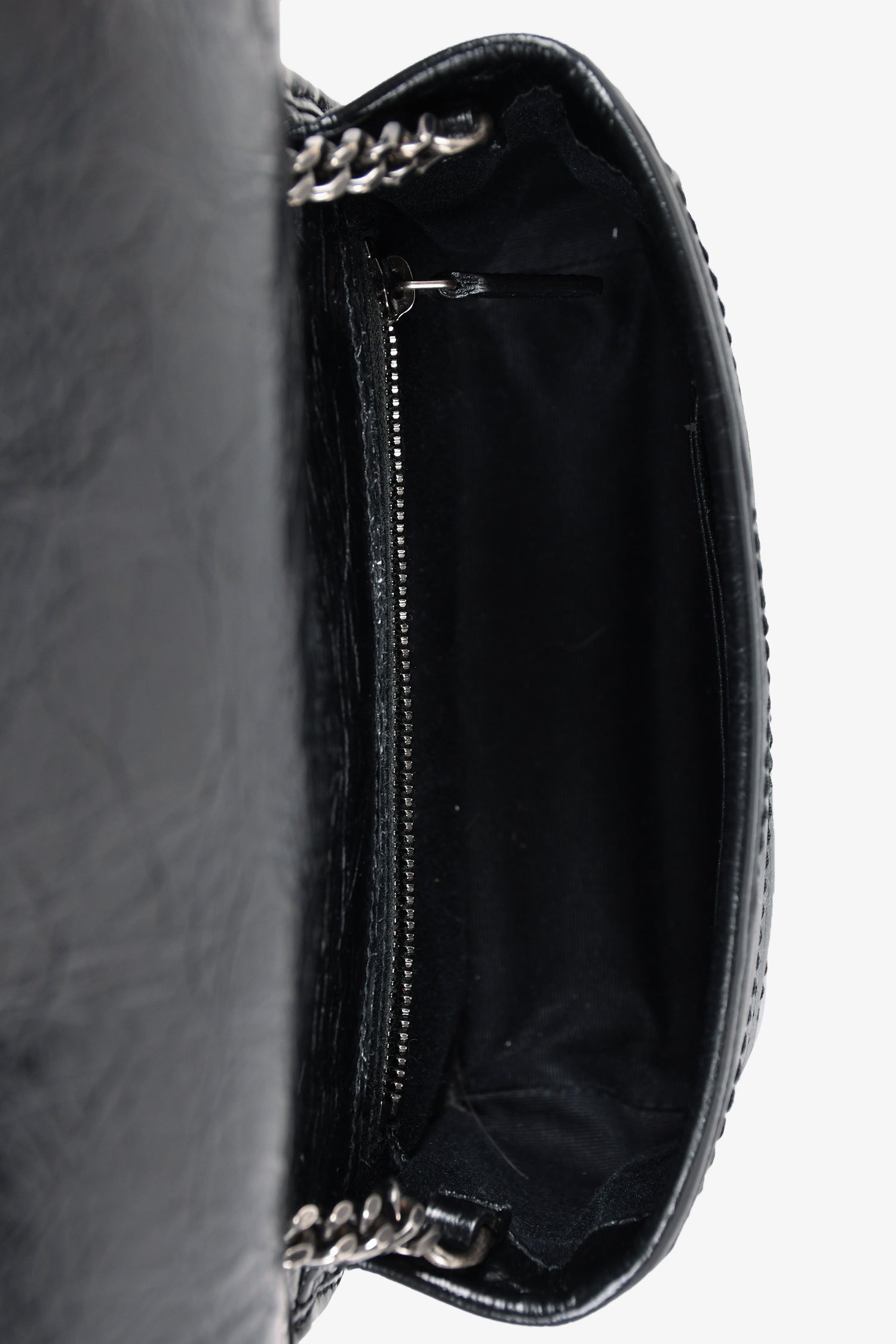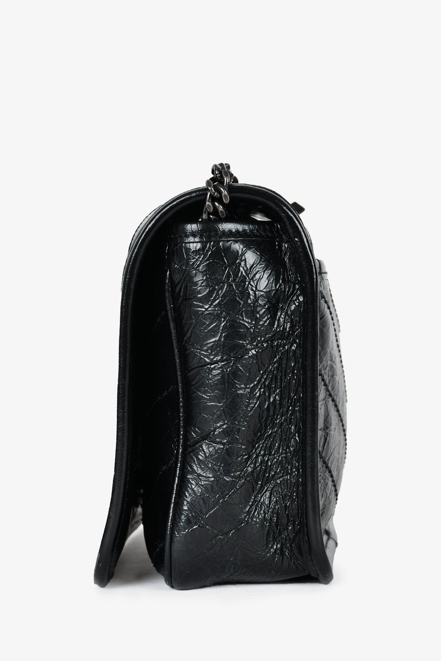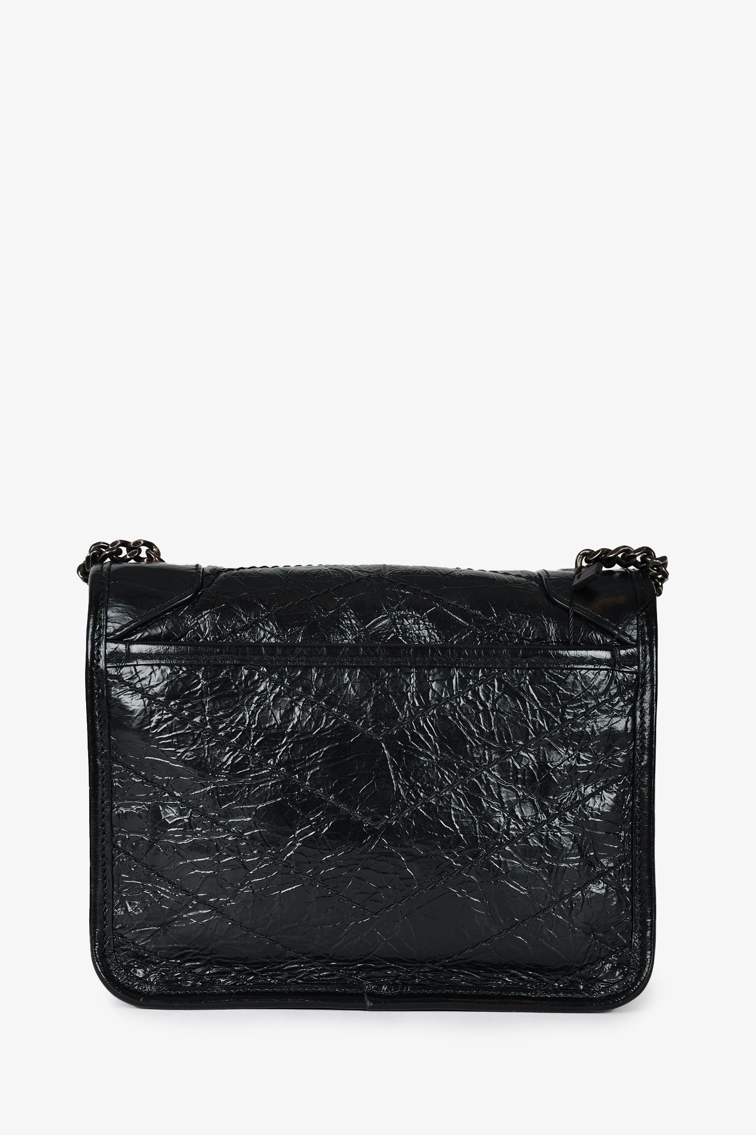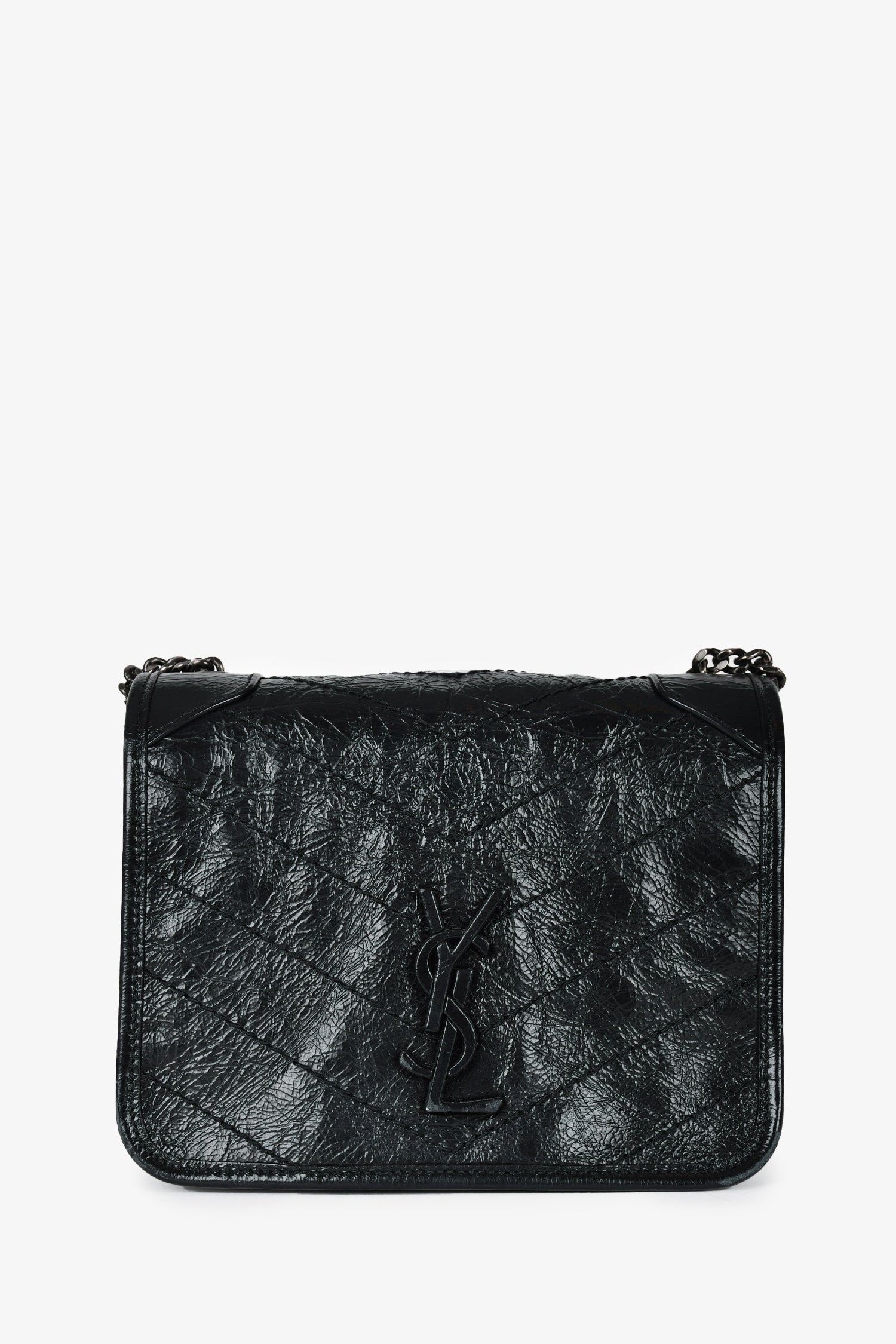 Refresh availabilitySaint Laurent Black Vintage Leather 'Niki' Wallet on Chain. Front flap closure with magnetic button. Back outer pocket. Chain handle. 4 cardholder pockets on interior. One zipper pocket. Black interior lining. Tonal stitching.