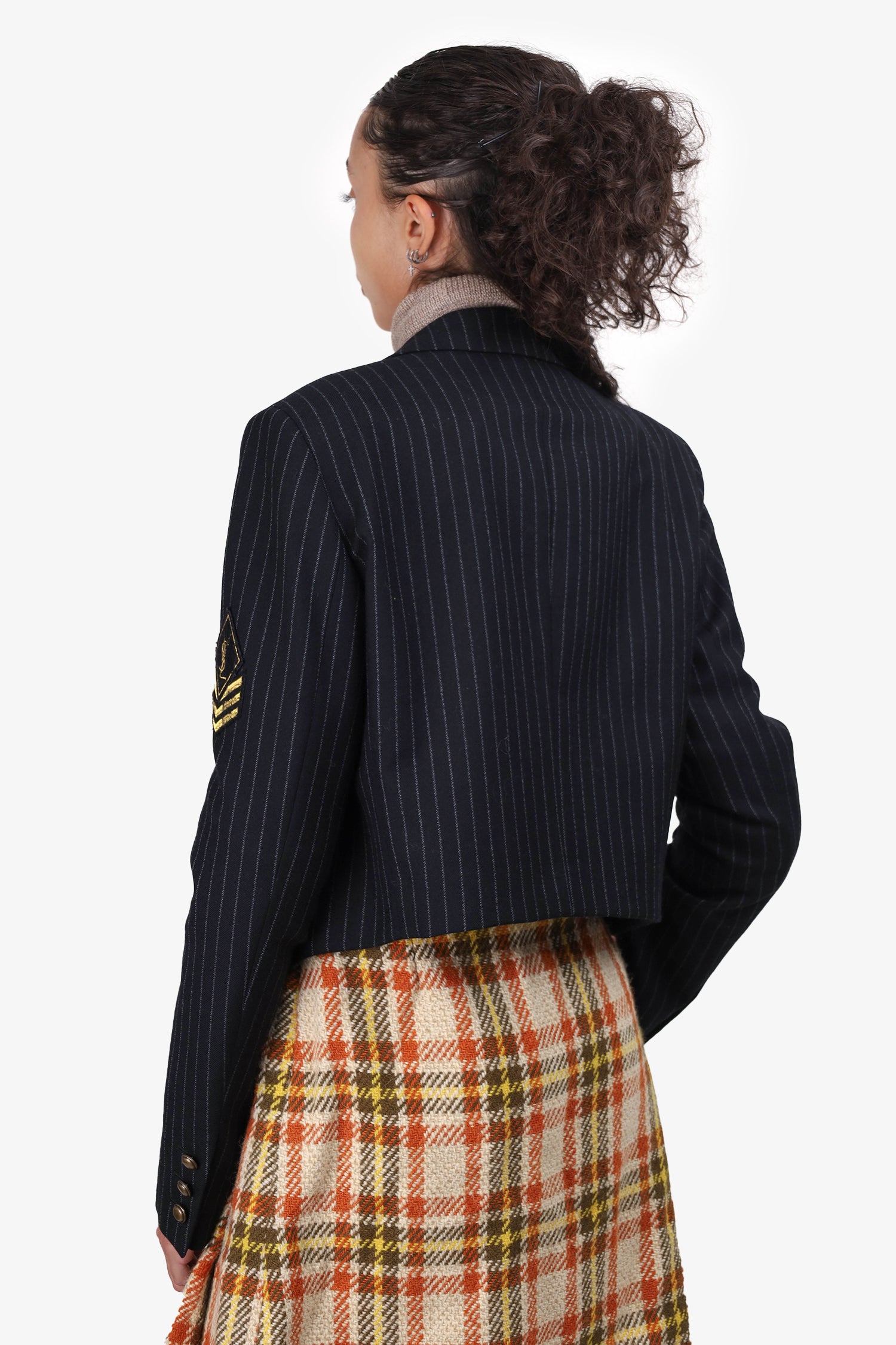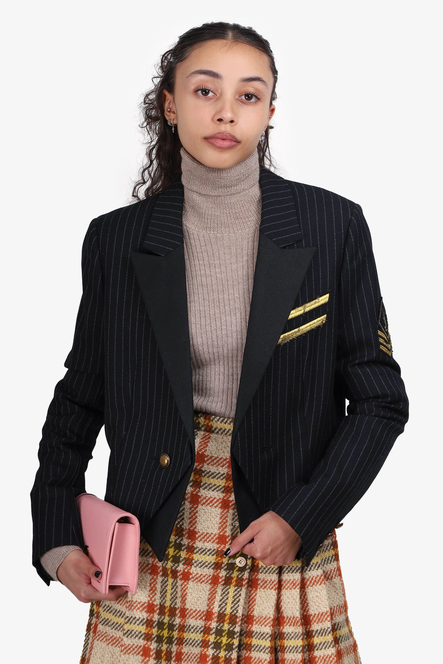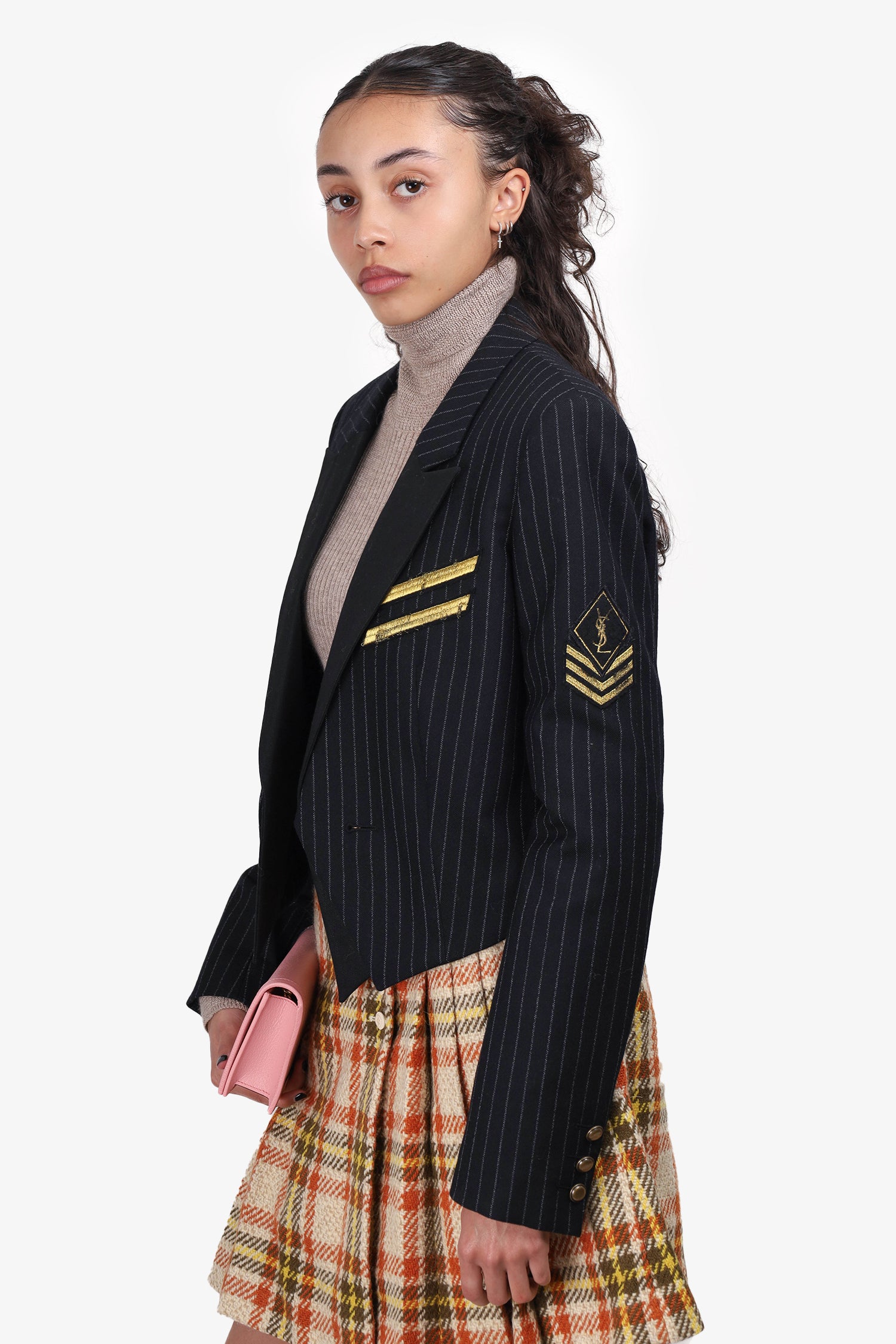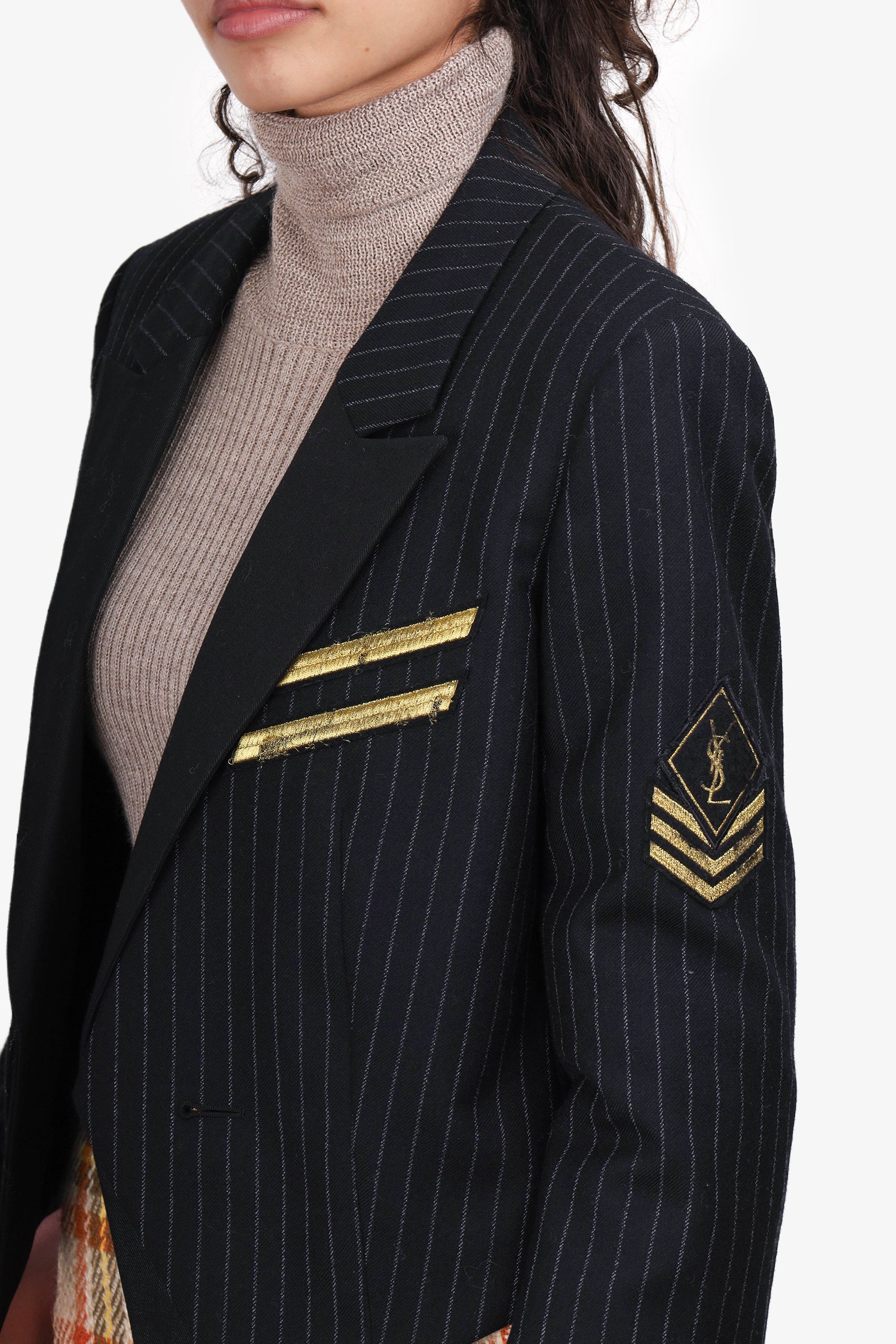 Refresh availabilitySaint Laurent Black/White Pinstripe Military Blazer. Front button closure. Lined. Gold-tone hardware. Tonal stitching.