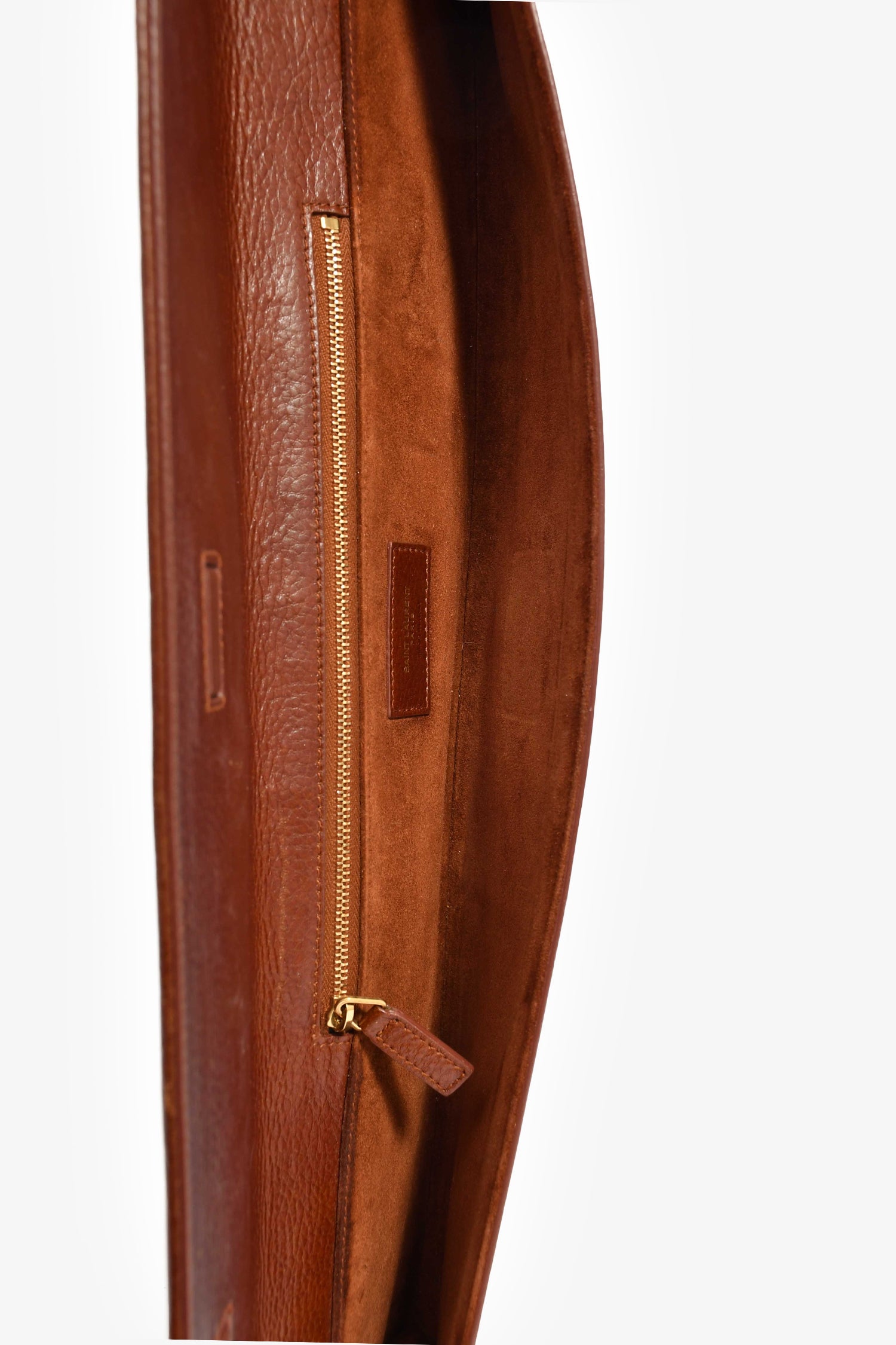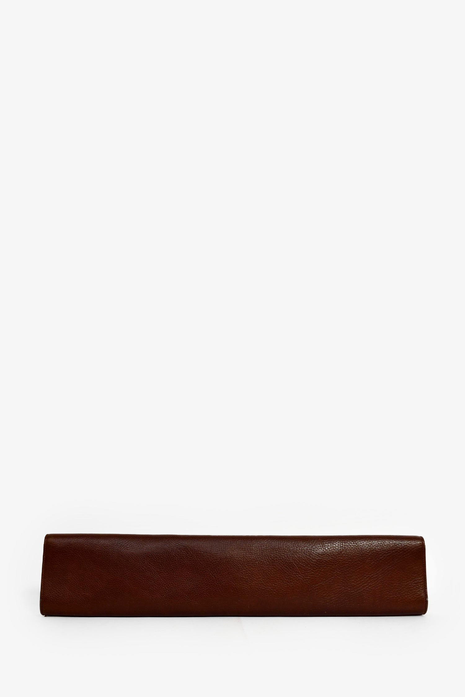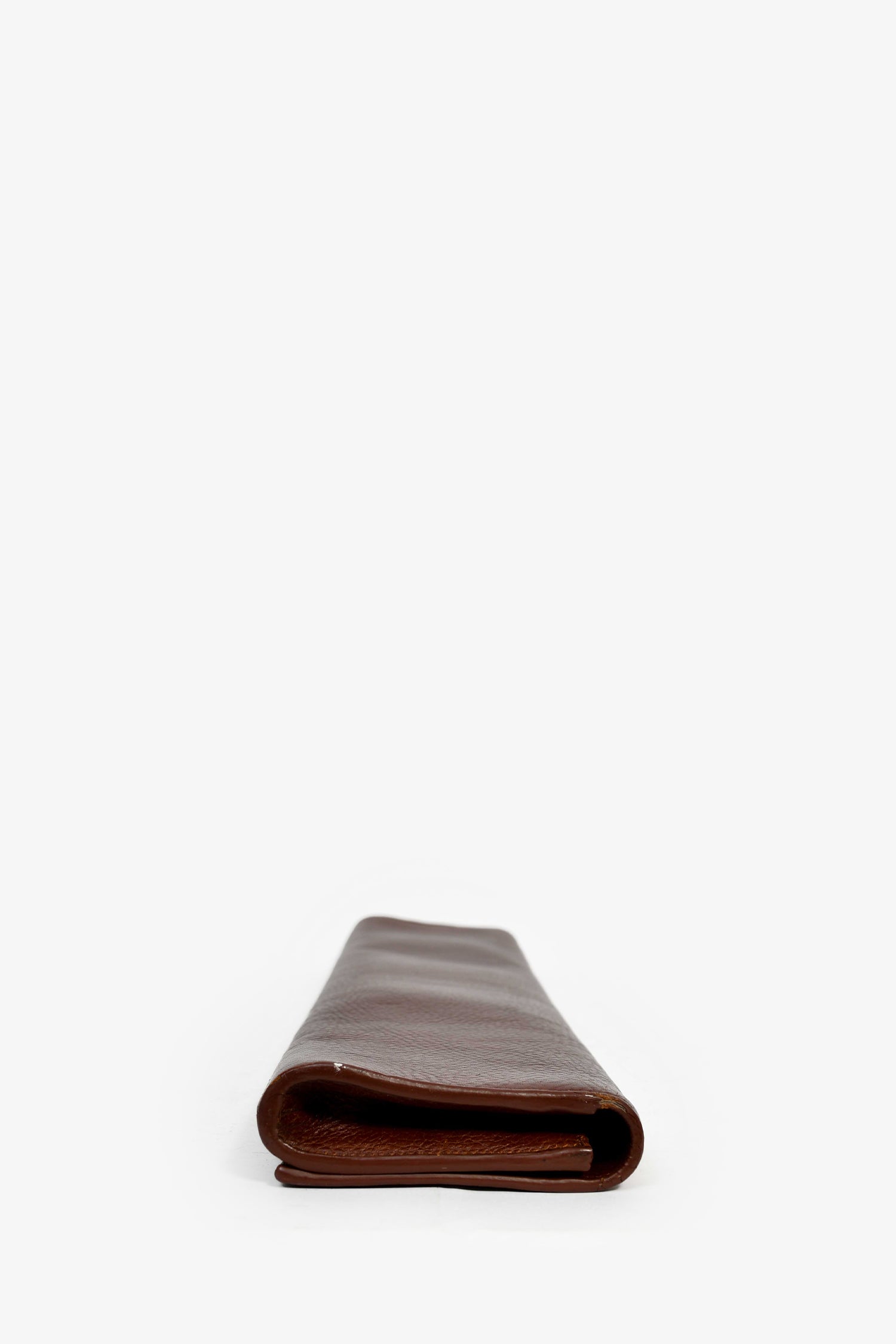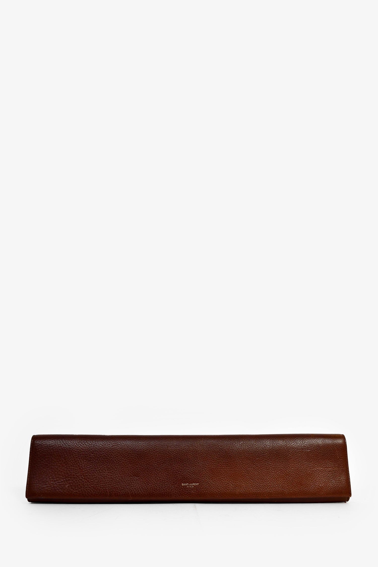 Refresh availabilitySaint Laurent Cognac Grained Leather 'Fetiche' Long Narrow Clutch. Front fold-over flap with magnetic button closures. Tonal suede interior lining. Single interior wall zip pocket. Gold-tone hardware.