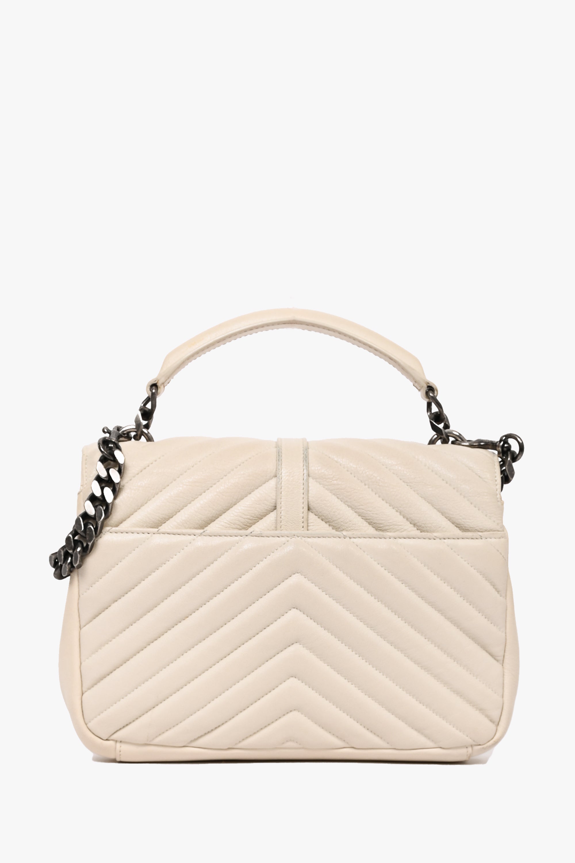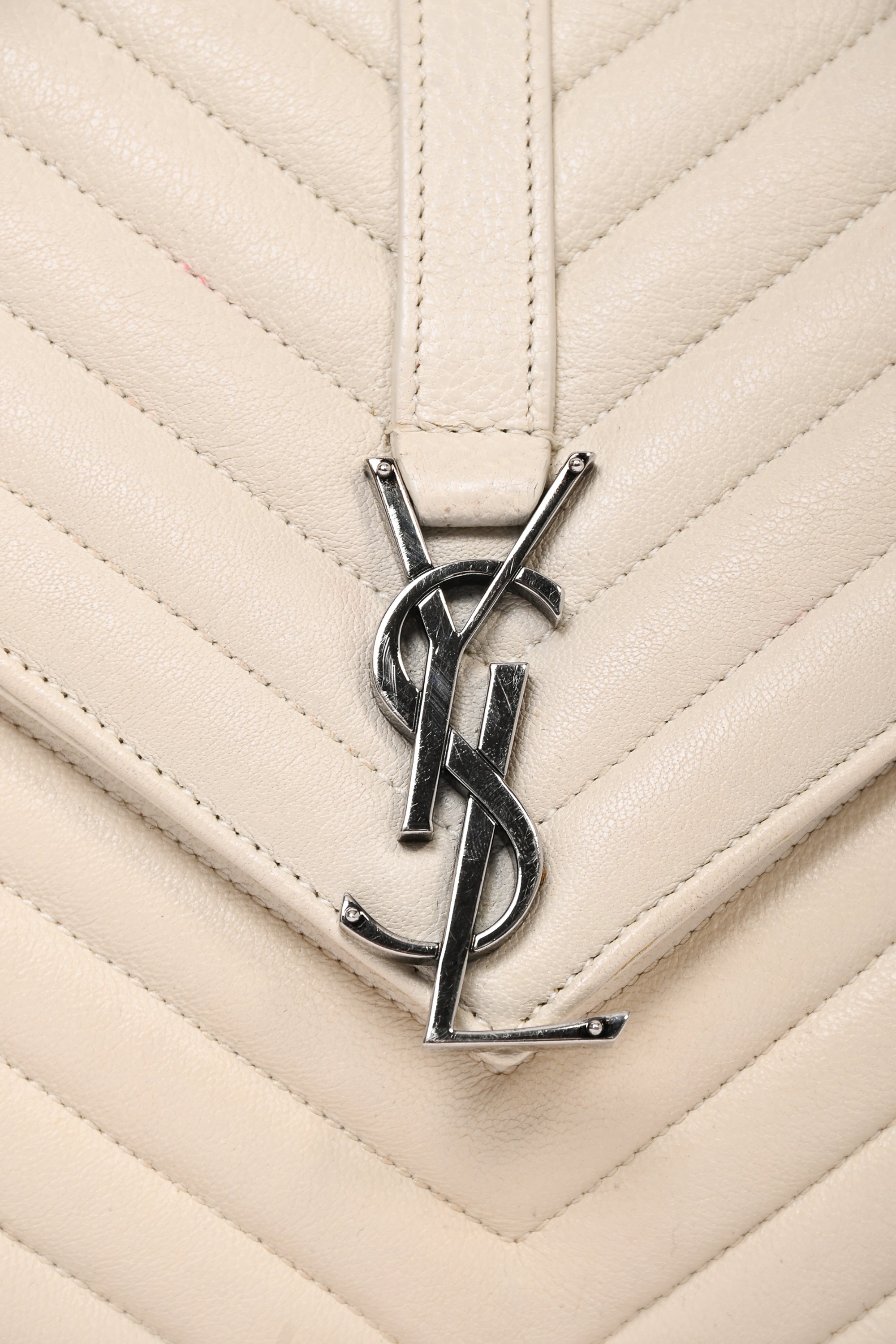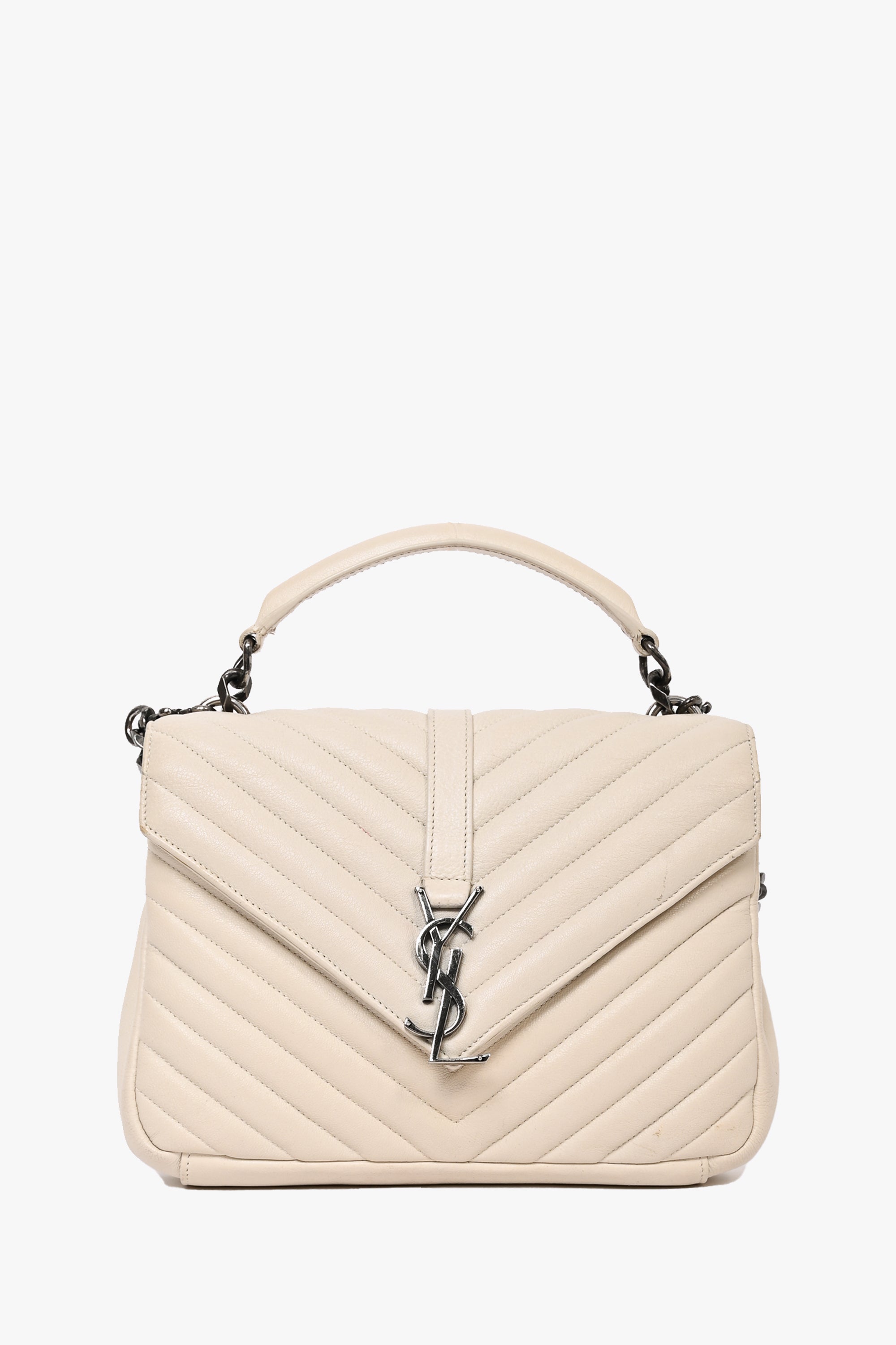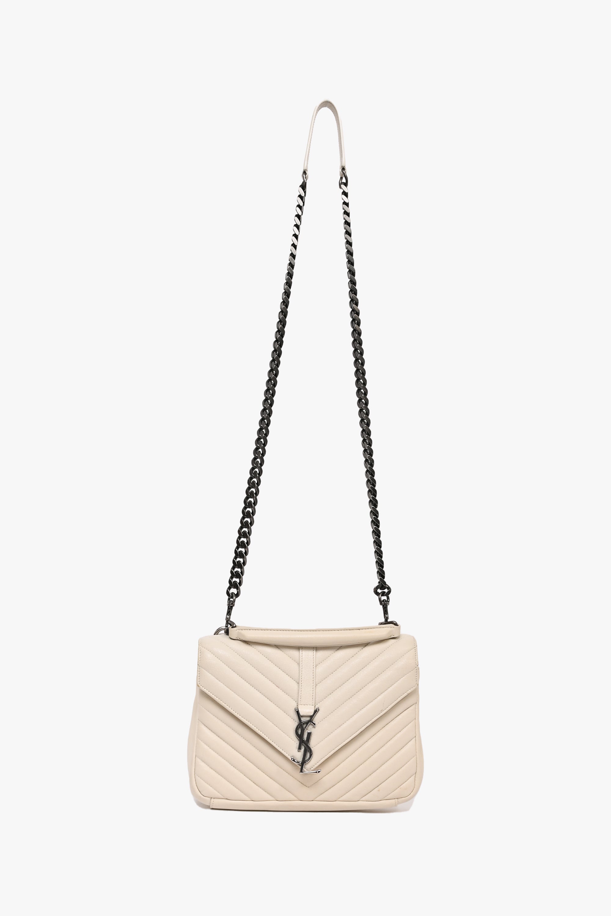 Refresh availabilitySaint Laurent 2016 Creme Medium Matelasse College Silver Chain Crossbody Bag. Front fold-over flap with magnetic button closure. Top handle. Black leather textile interior lining. 3 interior compartments; 2 open and 1 with zip closure. Outer rear slip pocket. Detachable chain strap. Silver-tone hardware. Tonal stitching. Outer rear slip pocket.