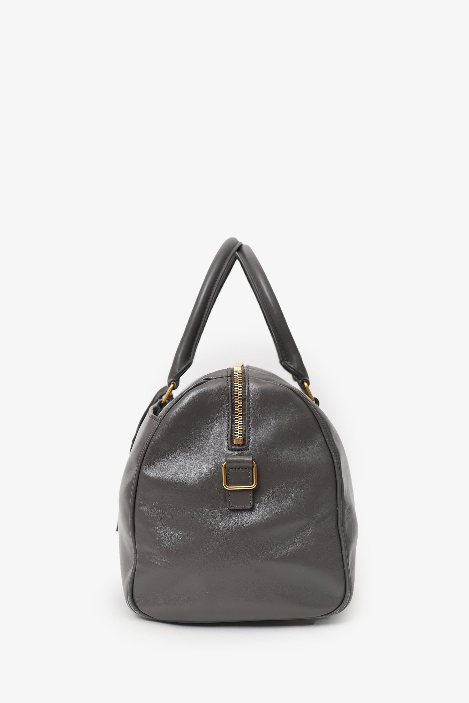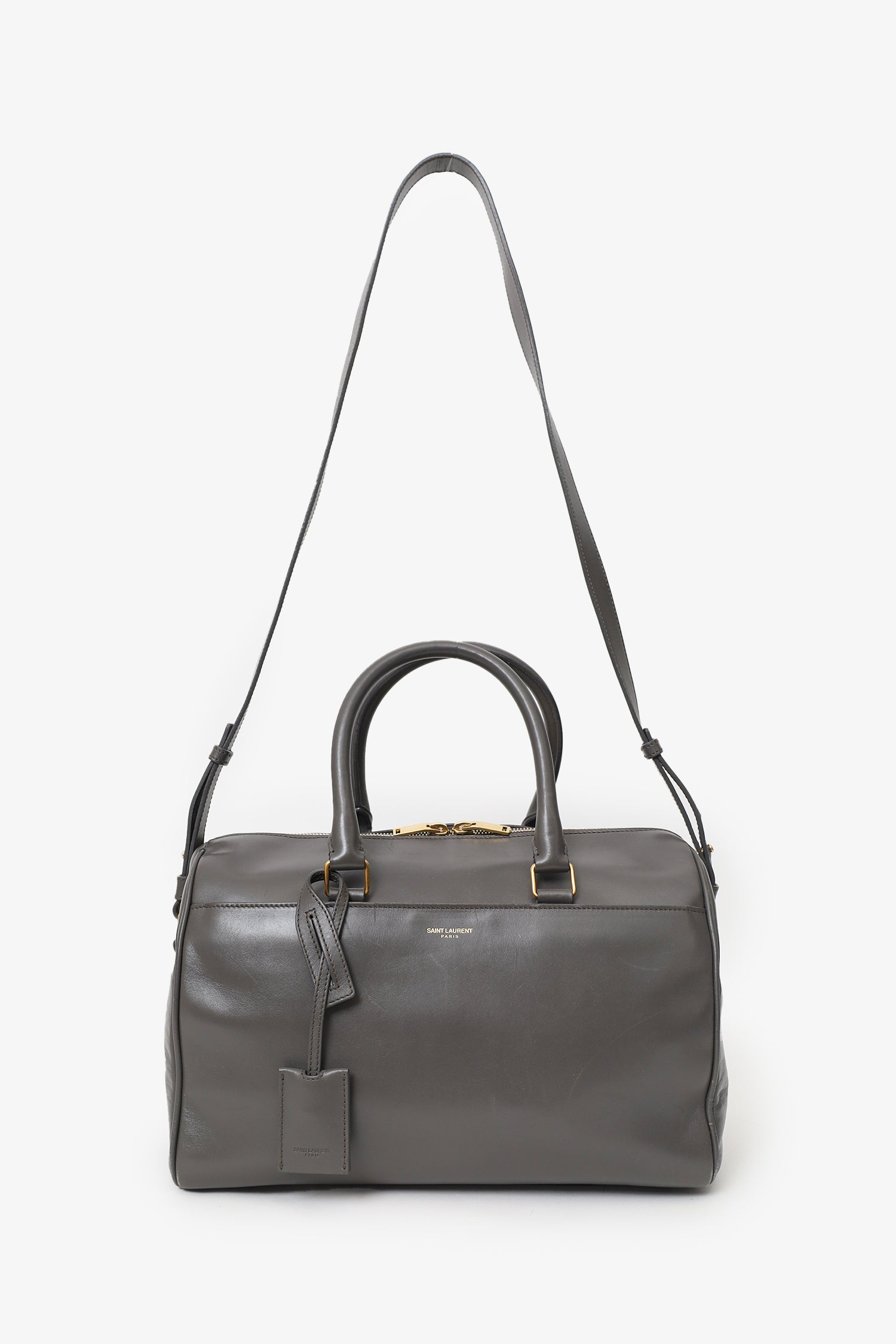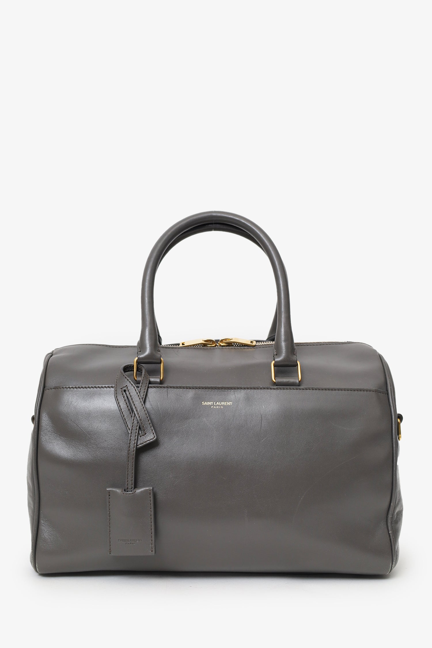 Refresh availabilitySaint Laurent Grey Leather Boston Bag. 2-way top zip closure. Twin top handles. Adjustable and removable shoulder strap. Single exterior pocket with magnetic snap closure. Protective base studs. Lined interior with single zip pocket. Removable bag tag. Gold-tone hardware. Tonal stitching.