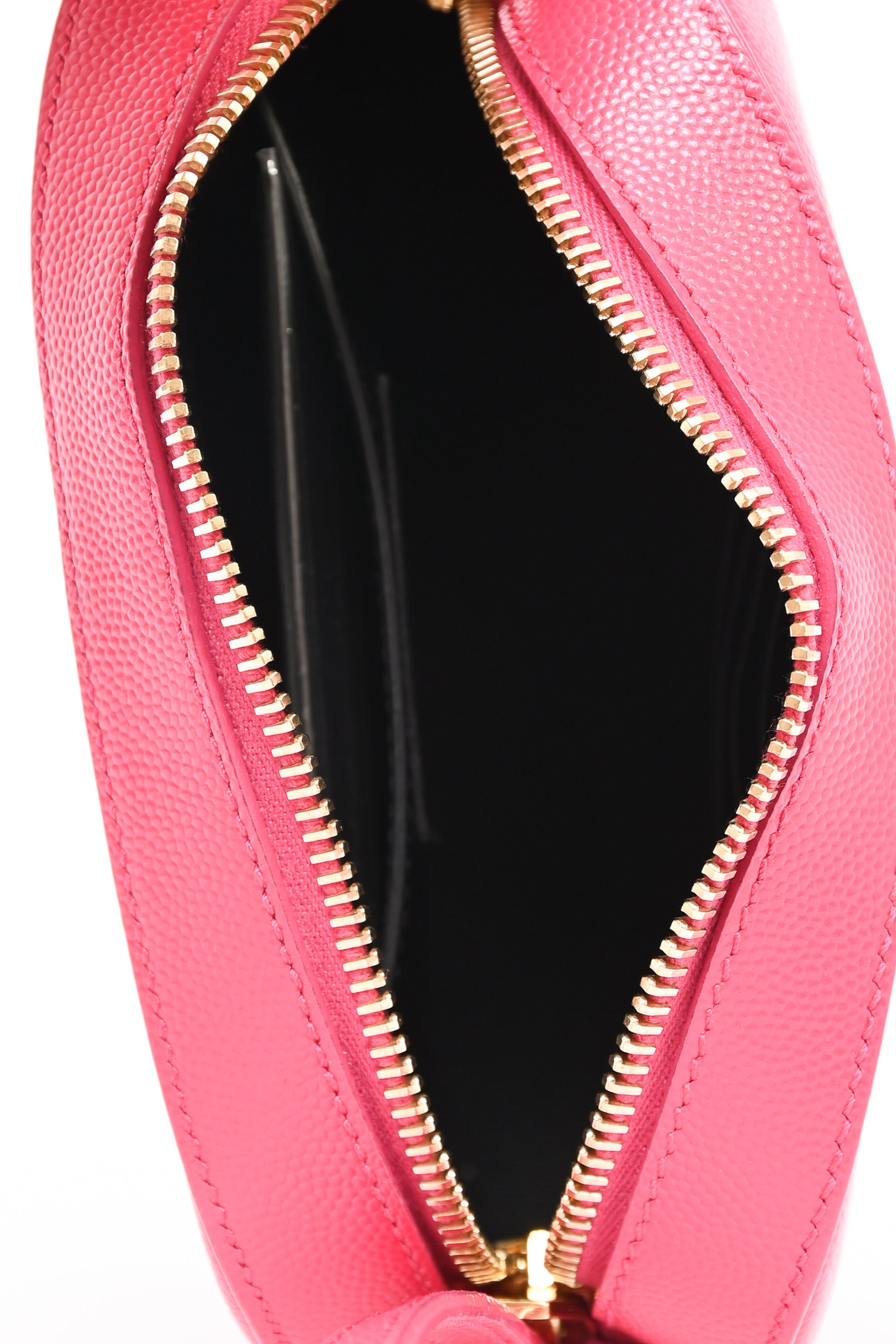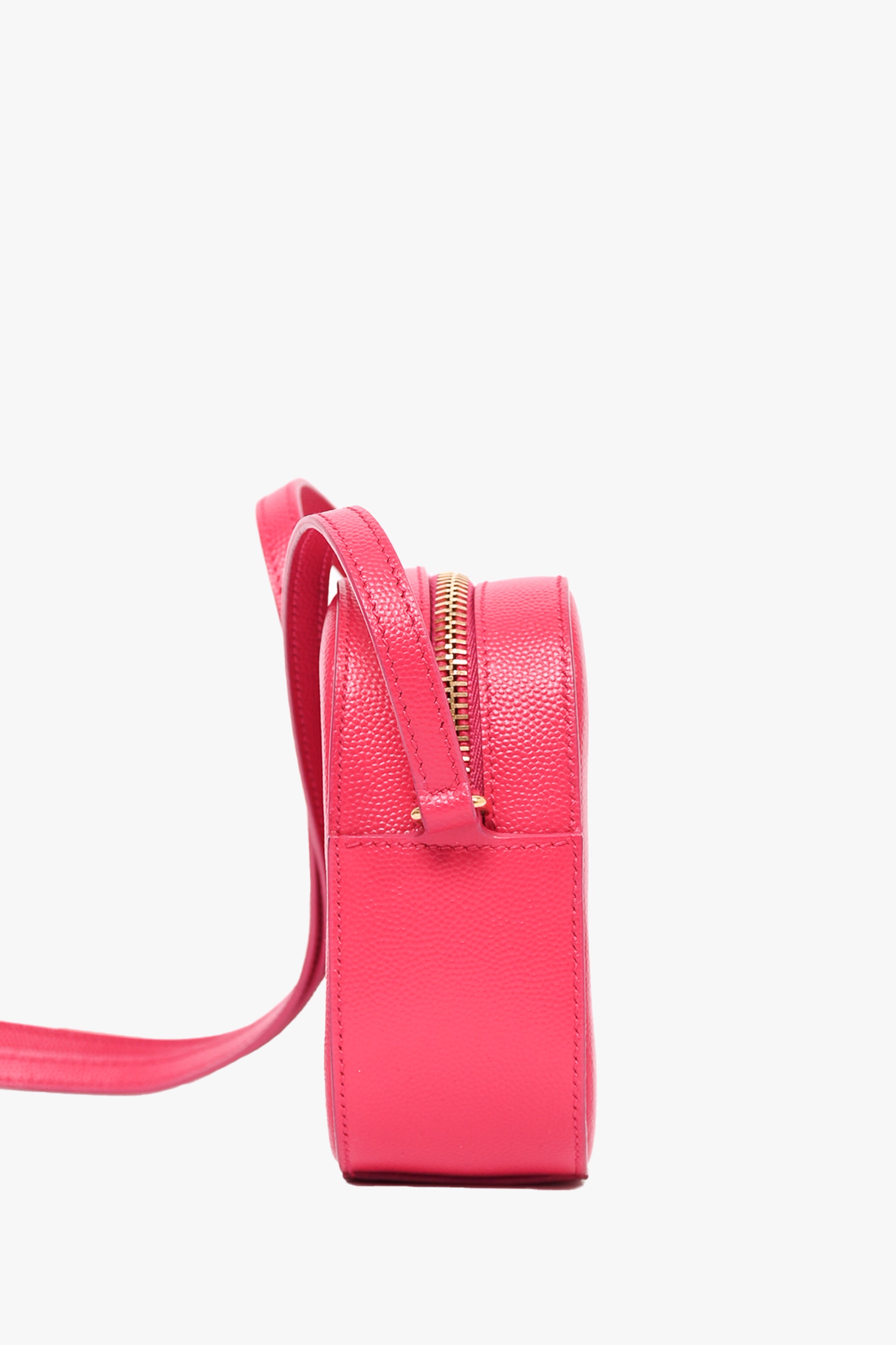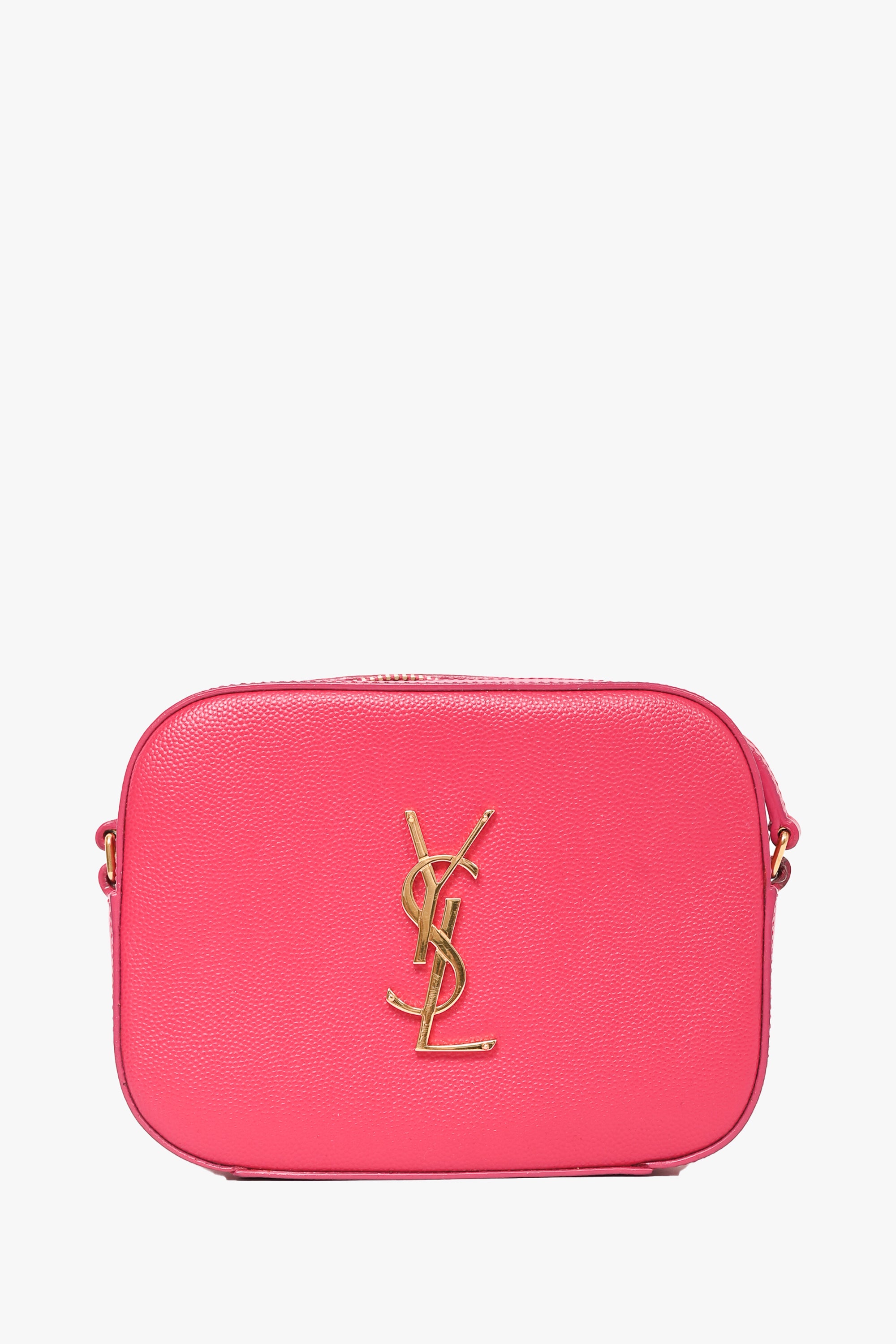 Refresh availabilitySaint Laurent 2015 Hot Pink Leather Camera Crossbody. Top two-way zip closure. Black leather interior. 4 interior card slots. 1 interior wall slip pocket. Gold-tone hardware. Tonal stitching.