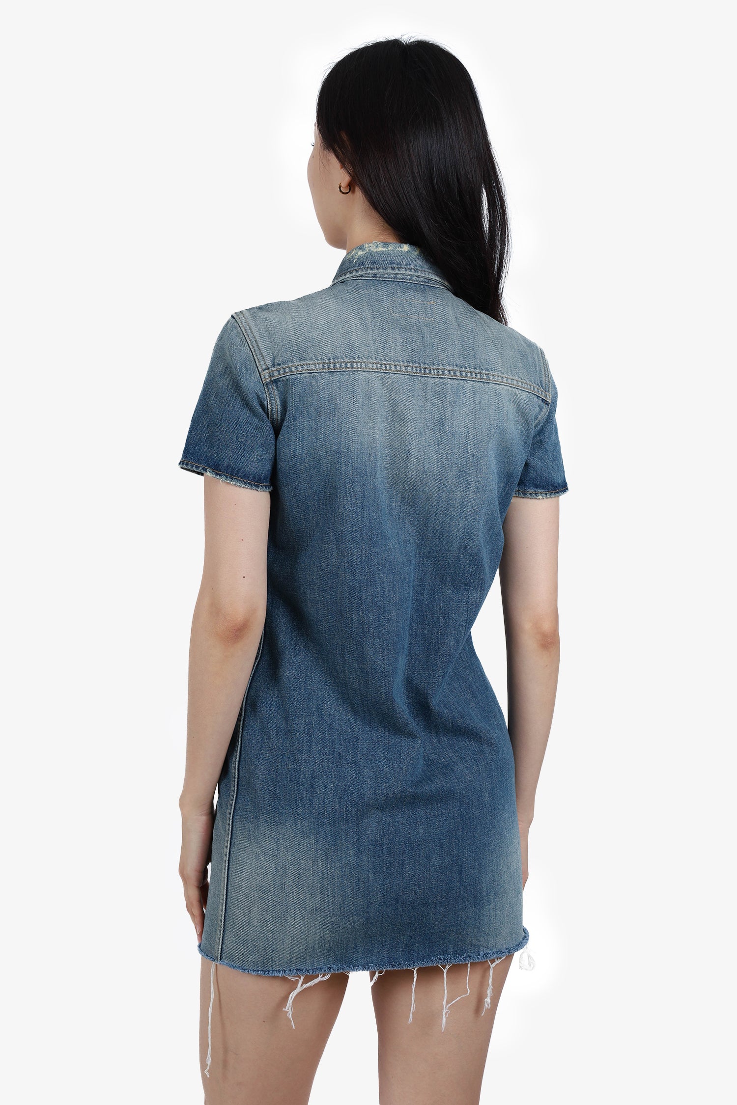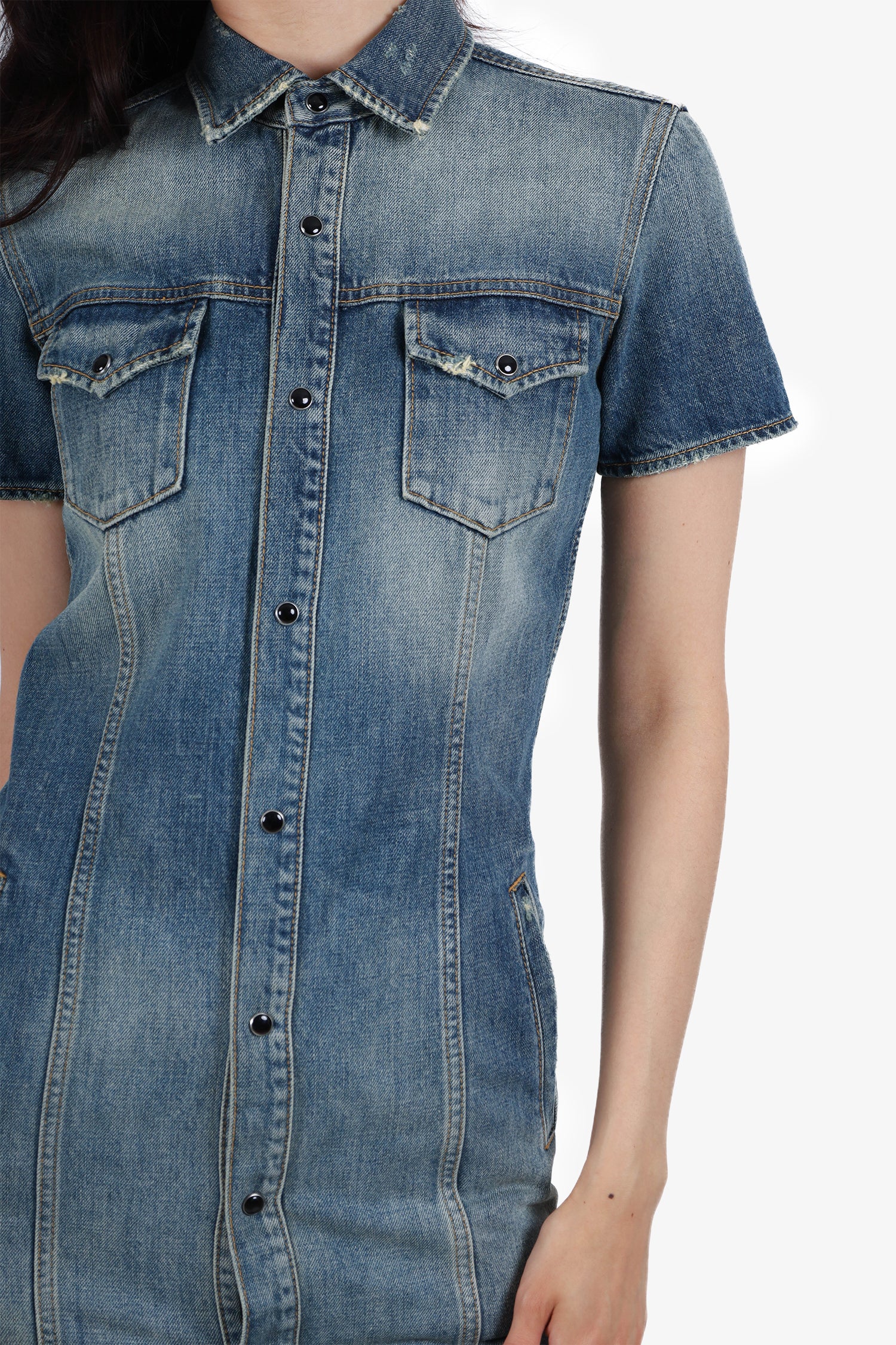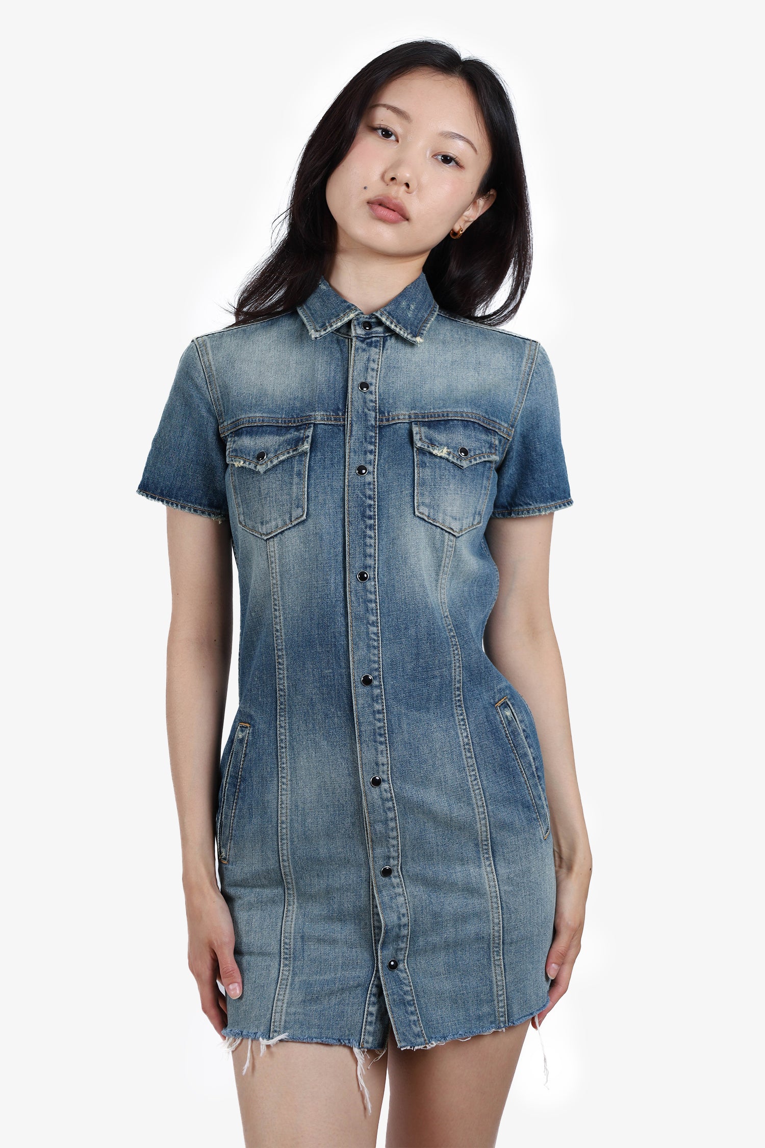 Refresh availabilitySaint Laurent Light Blue Denim Distressed 'Stonewashed' Mini Dress. Front snap closure. Collared neckline. Intentional distressing. Side pockets. Tonal stitching.