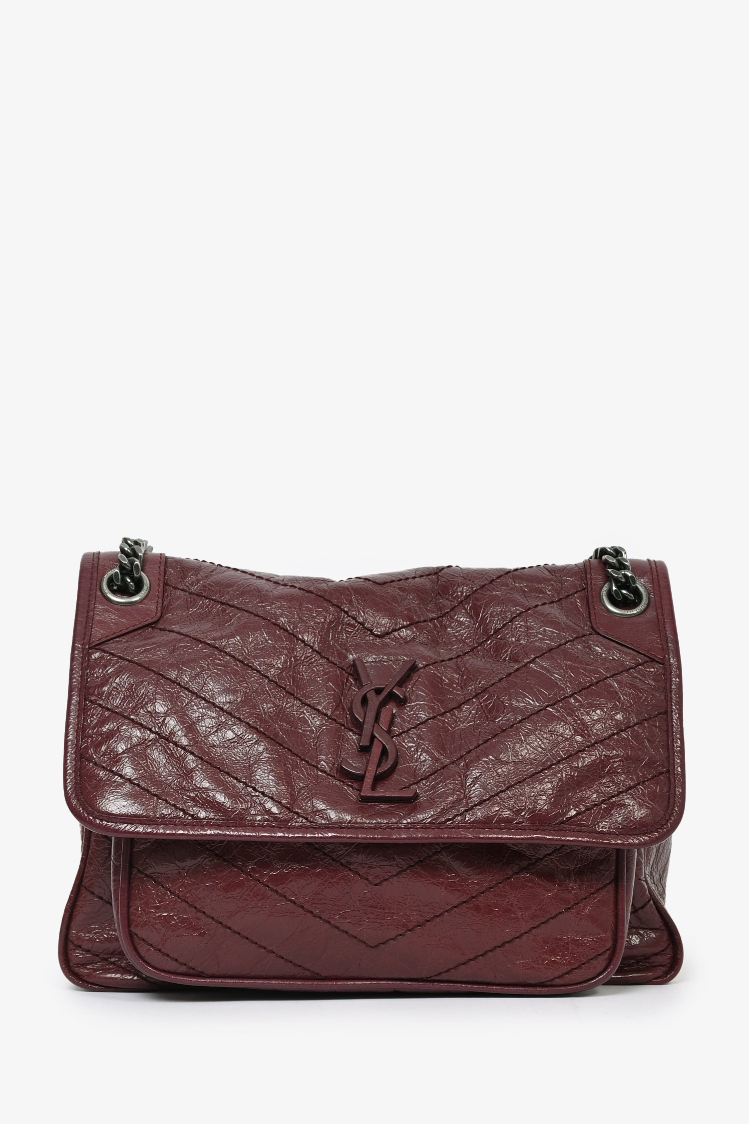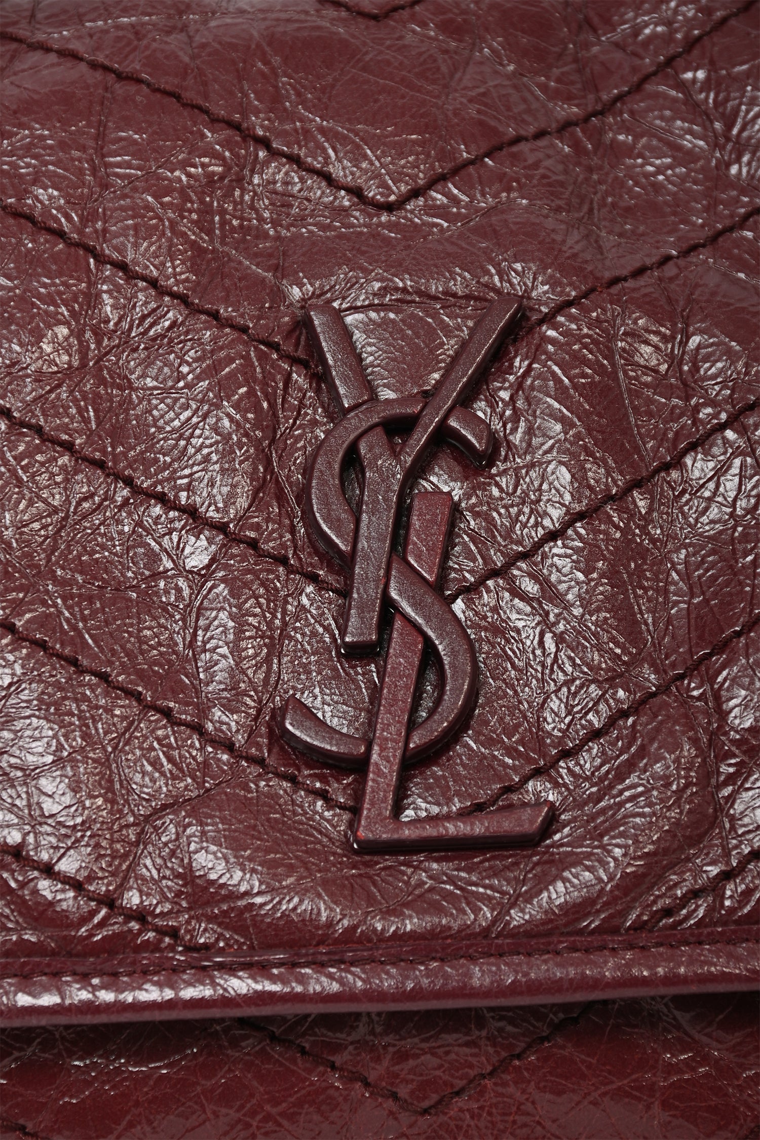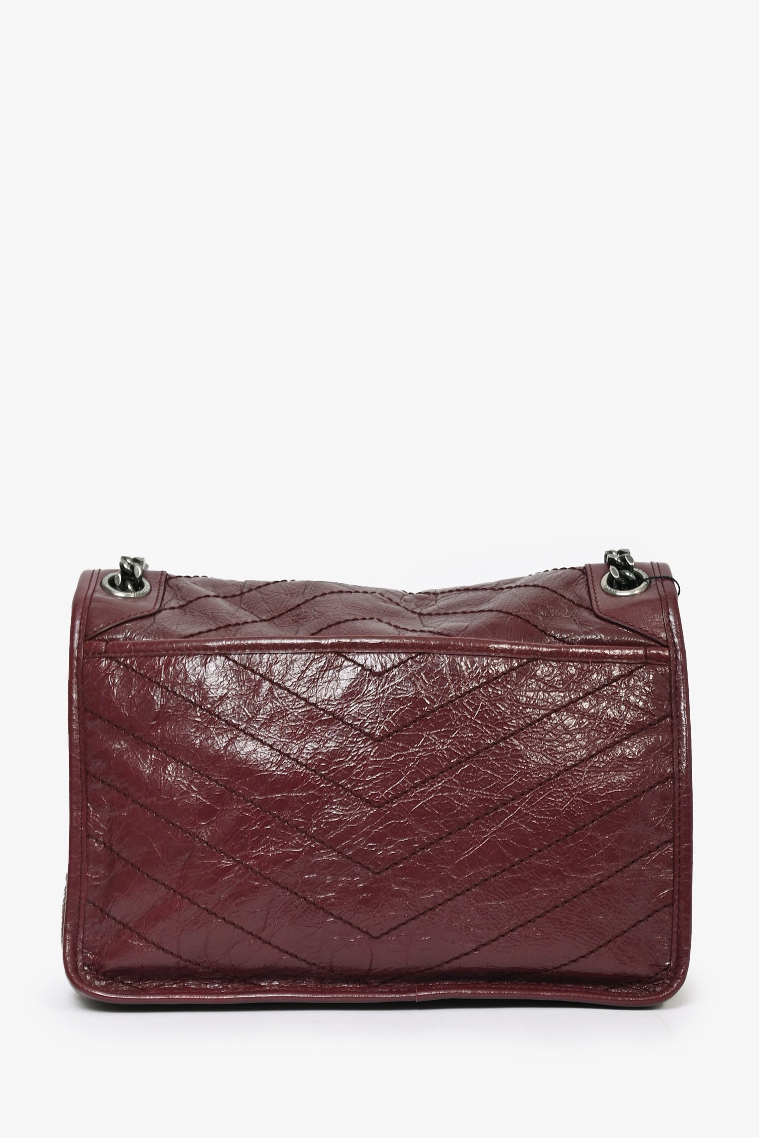 Refresh availabilitySaint Laurent Maroon Crinkled Leather Medium 'Niki' Shoulder Bag. Snap closure. Metal hardware. Exterior pocket. Zippered pocket interior. 1 interior pouch. Tonal stitching.