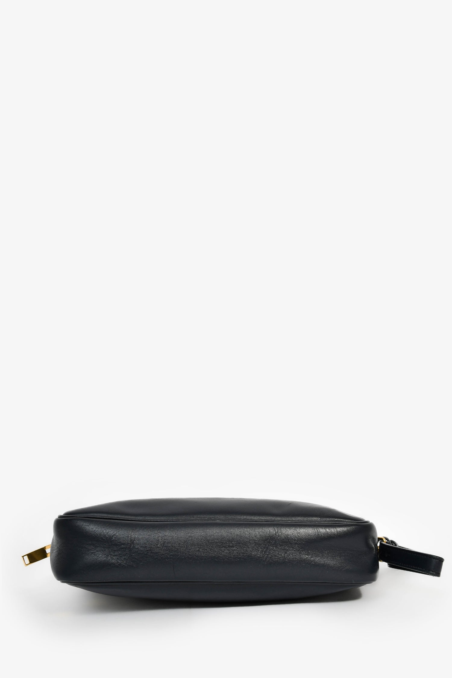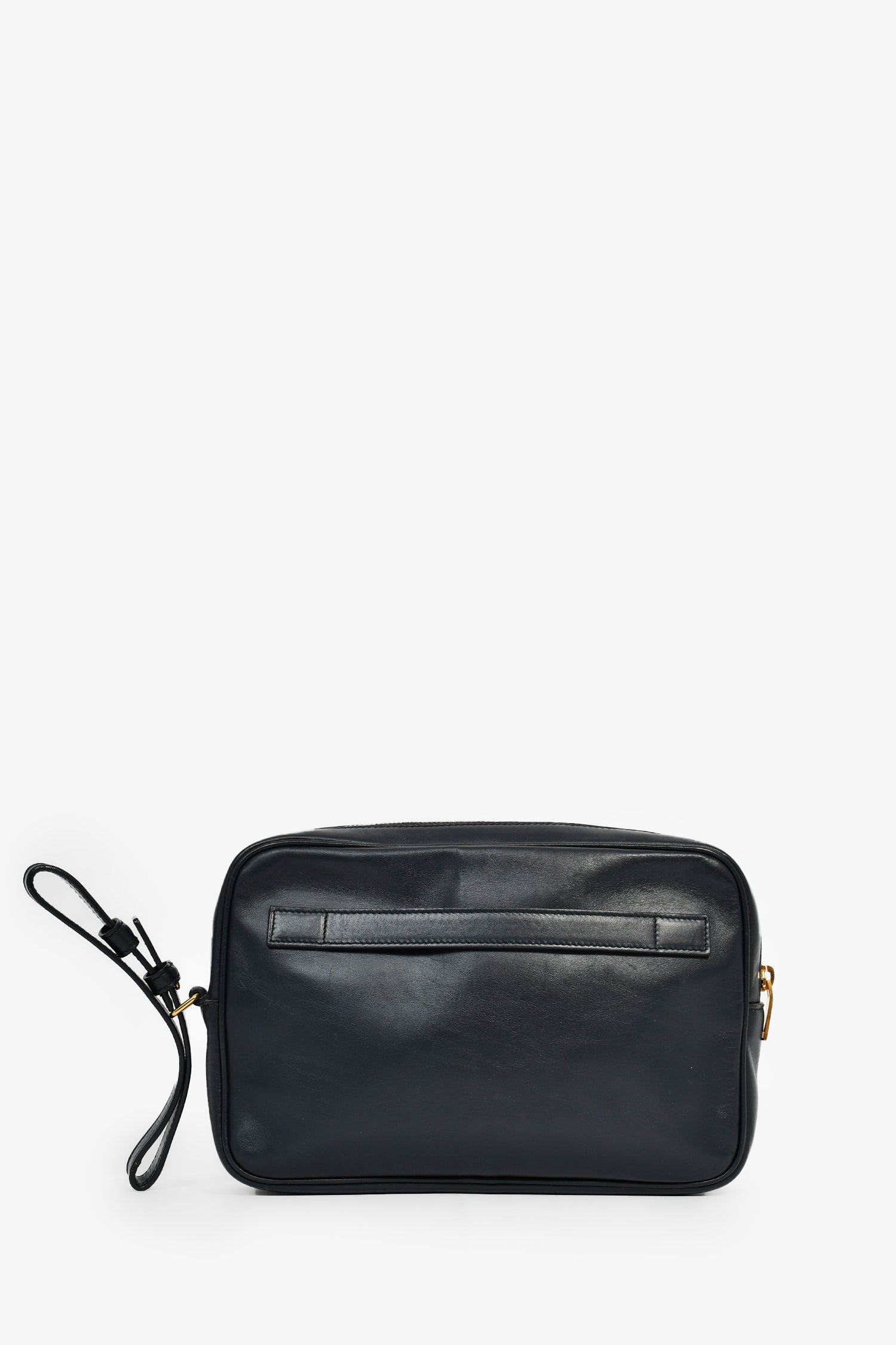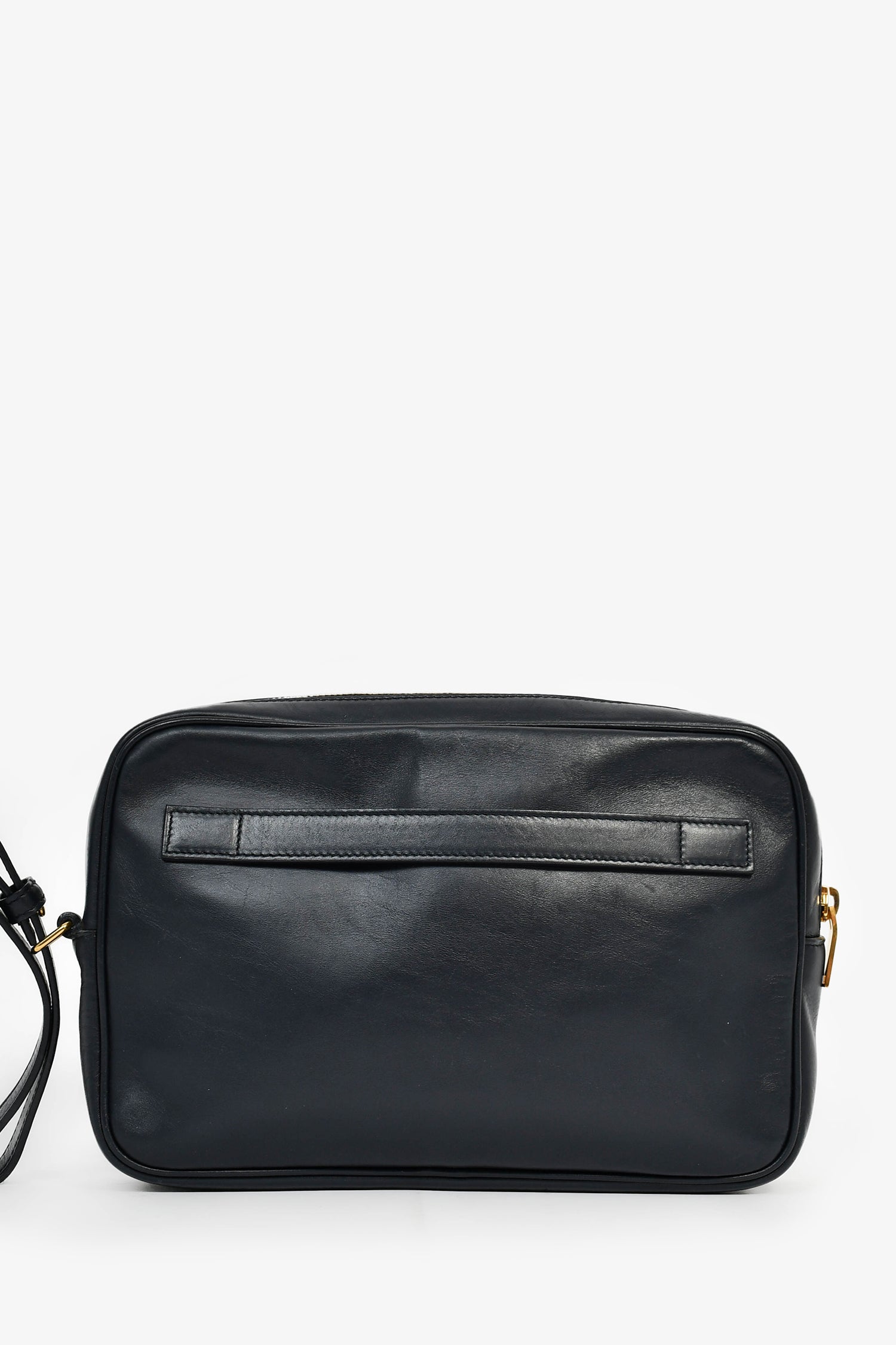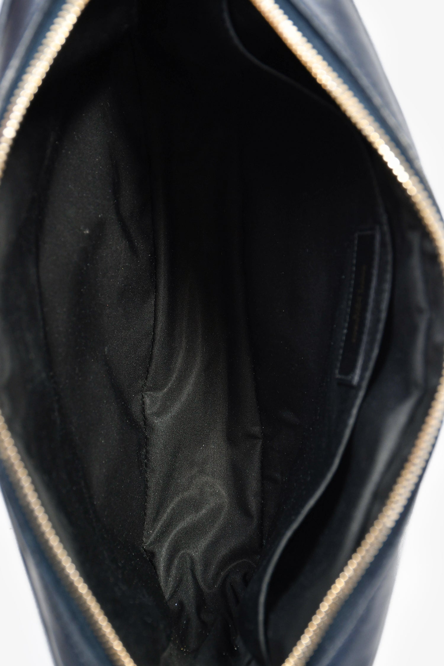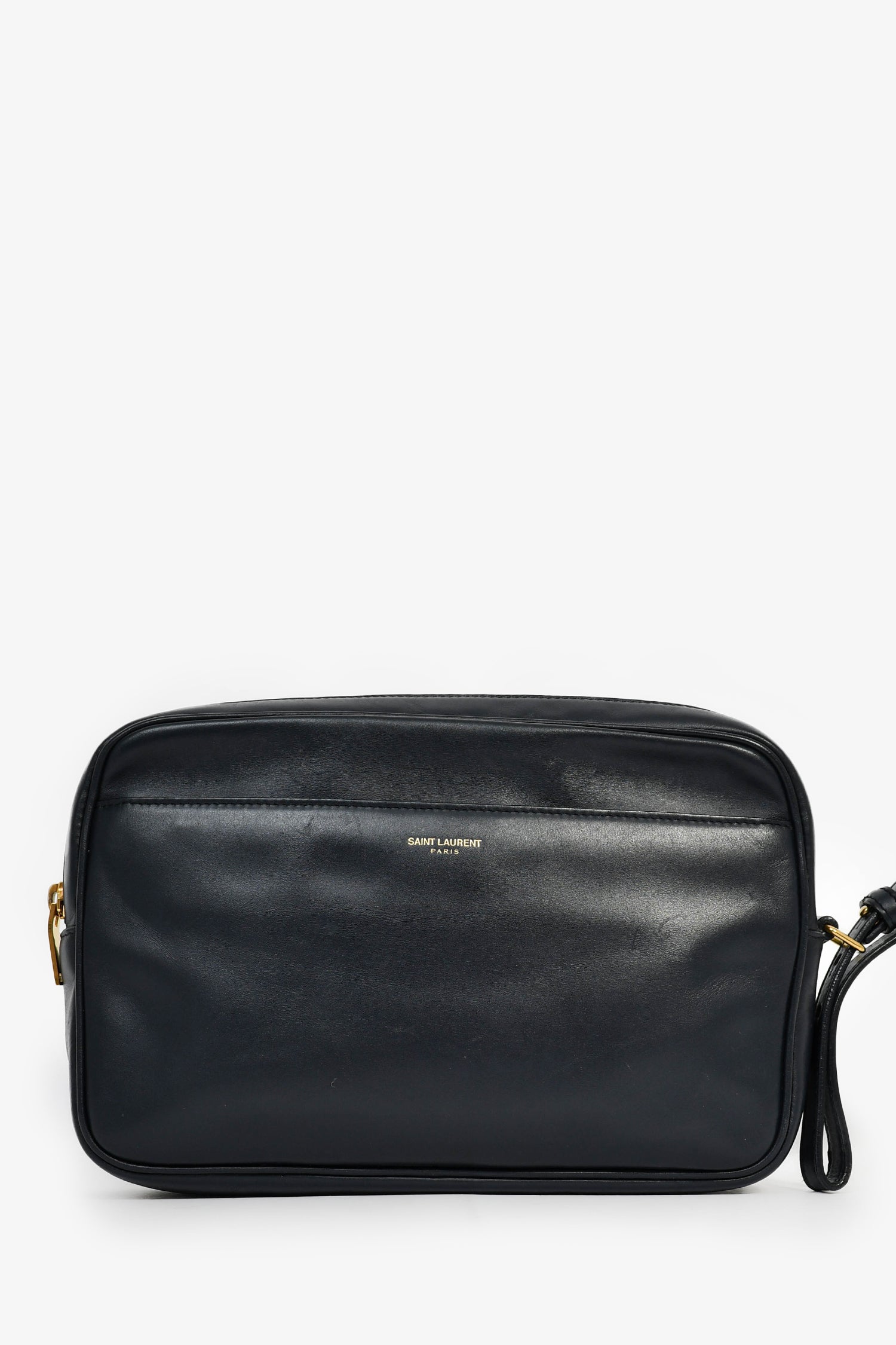 Refresh availabilitySaint Laurent Navy Blue Leather Clutch Bag. Gold-tone hardware. Top zipper. Attached leather loop. Exterior slip compartment. Lined interior with a pocket. Tonal stitching.
