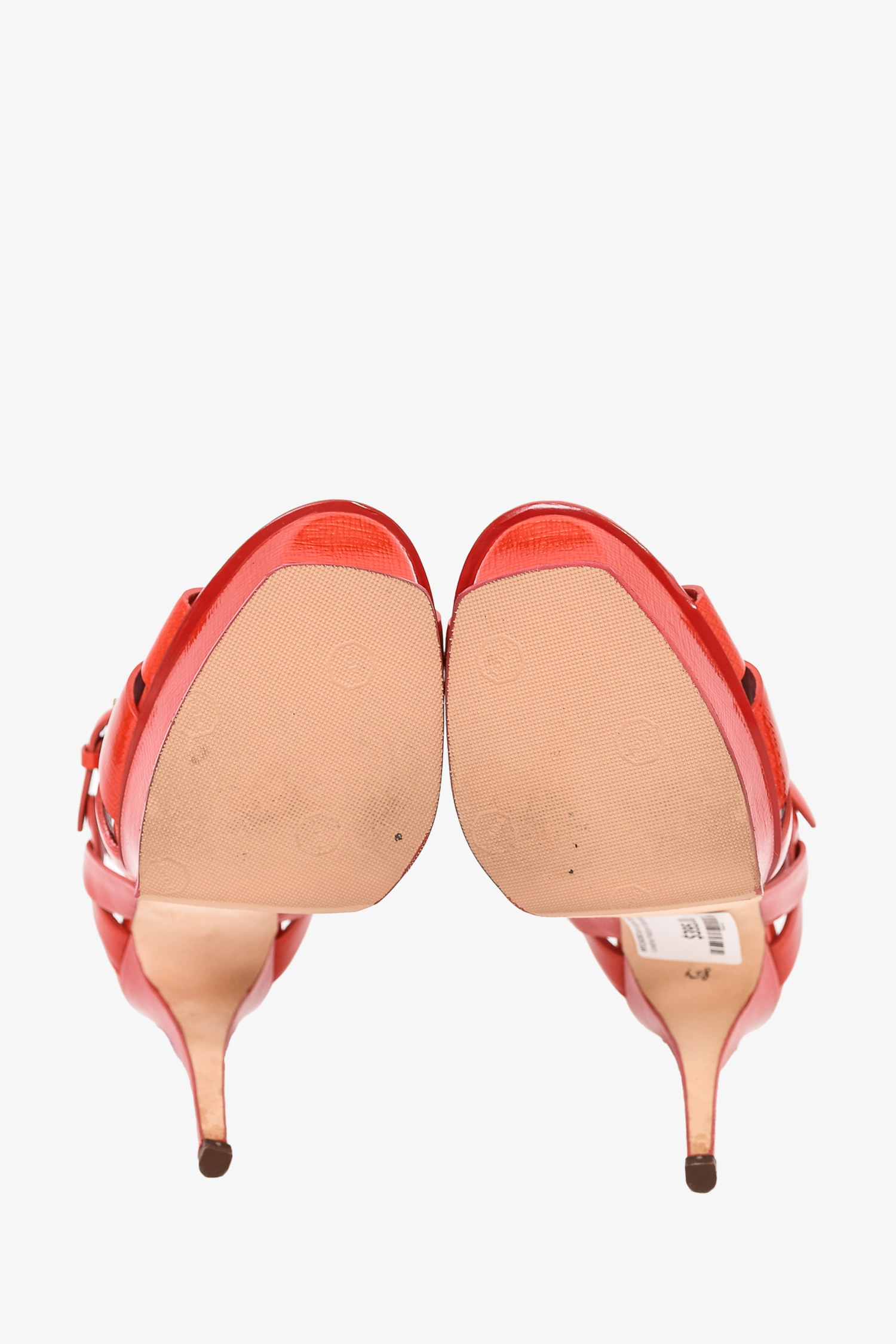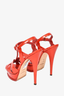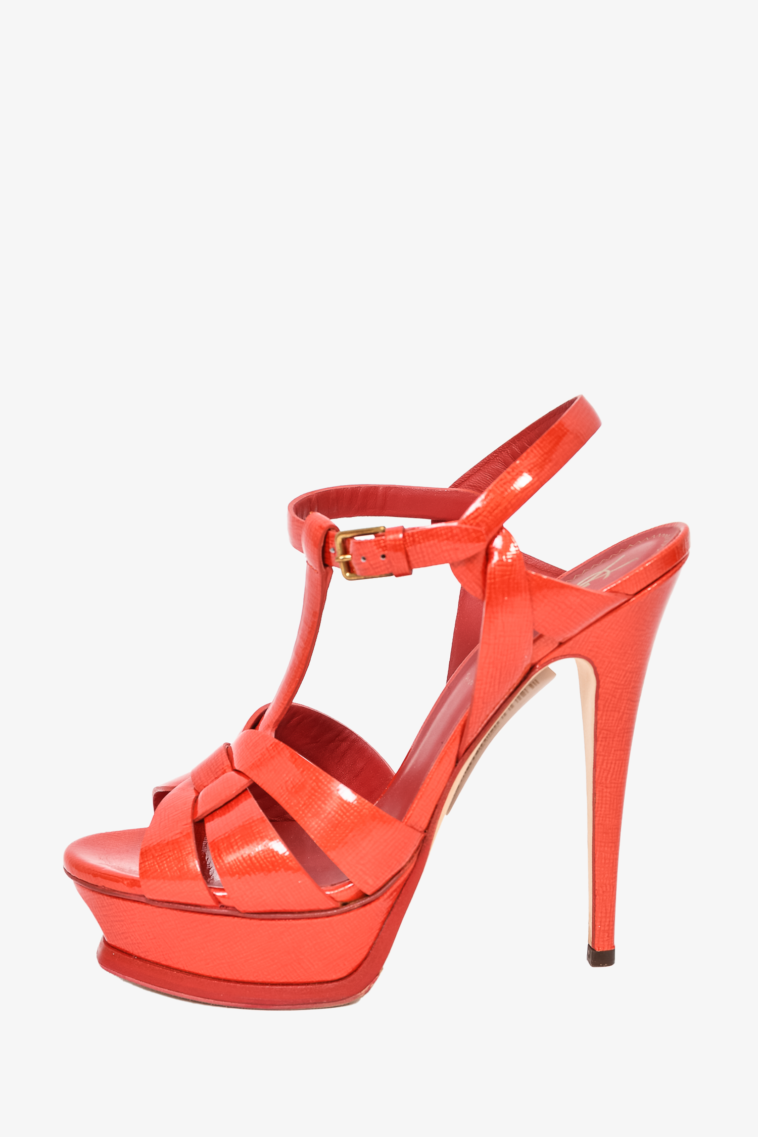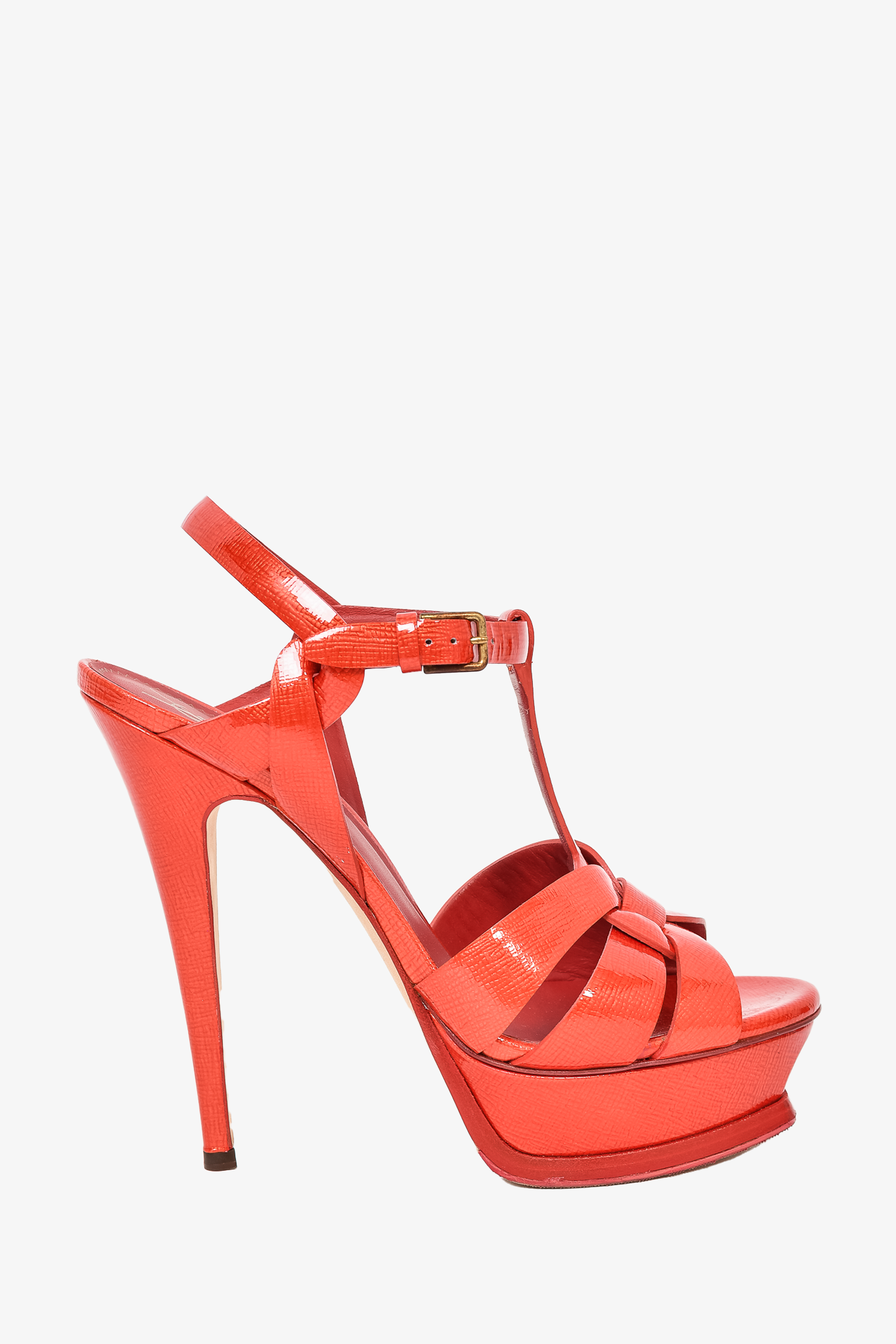 Refresh availabilitySaint Laurent Orange Patent Leather Platform Tribute Sandals. Ankle strap with buckle closure. Open almond toe. Tonal stitching.