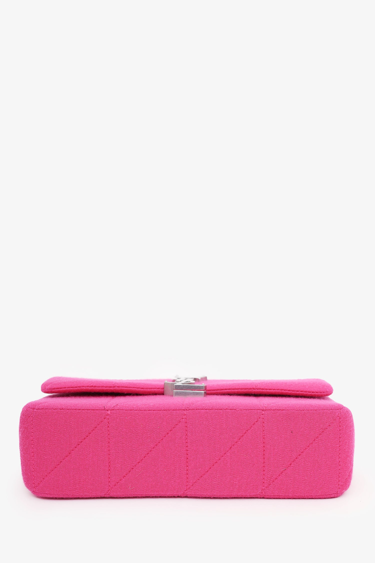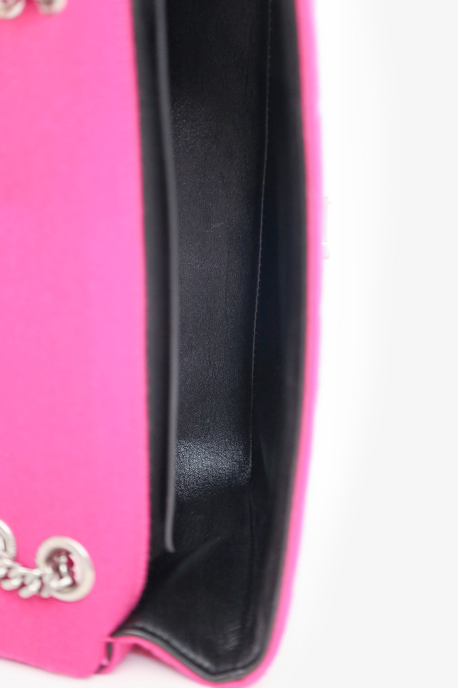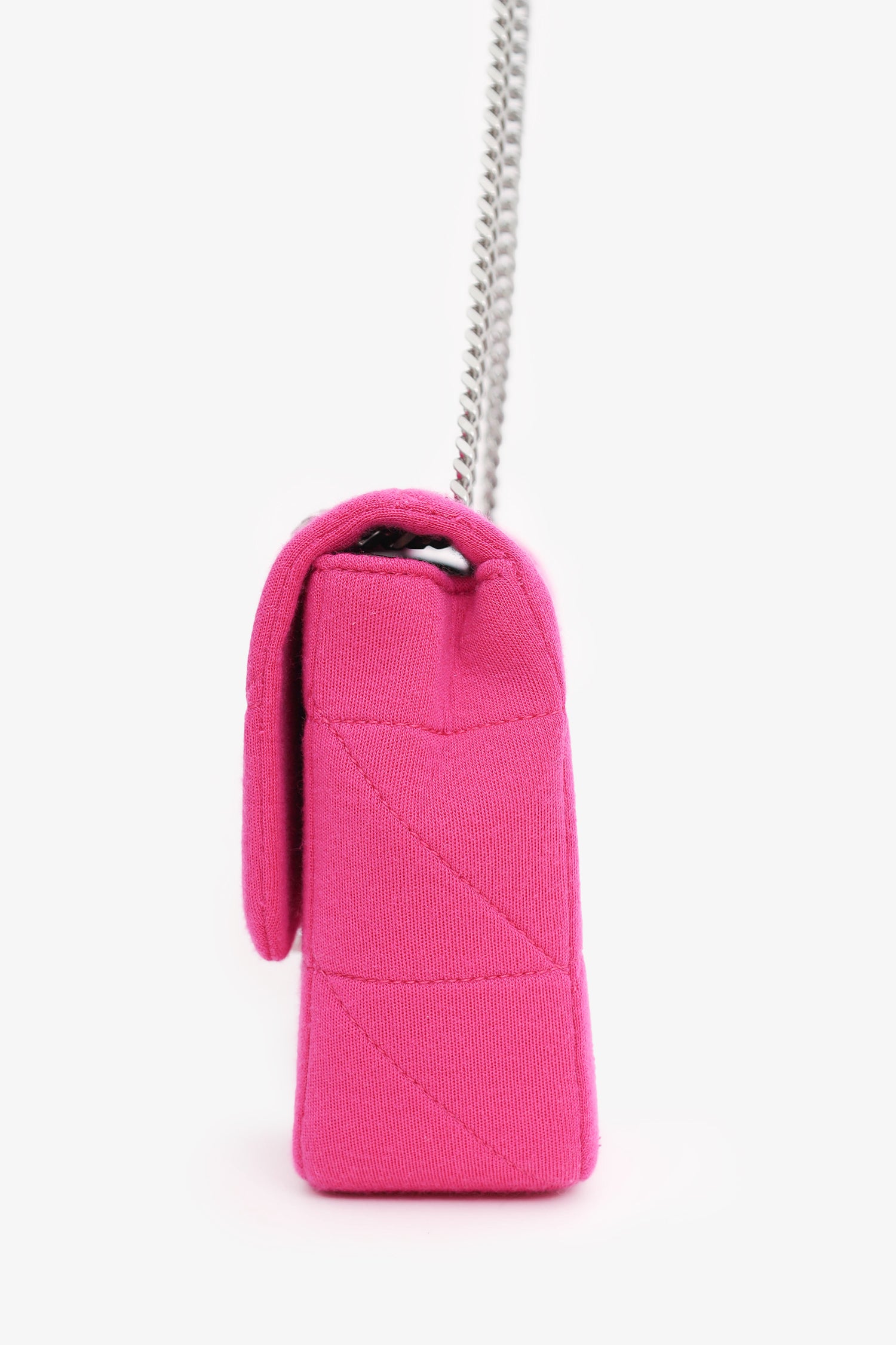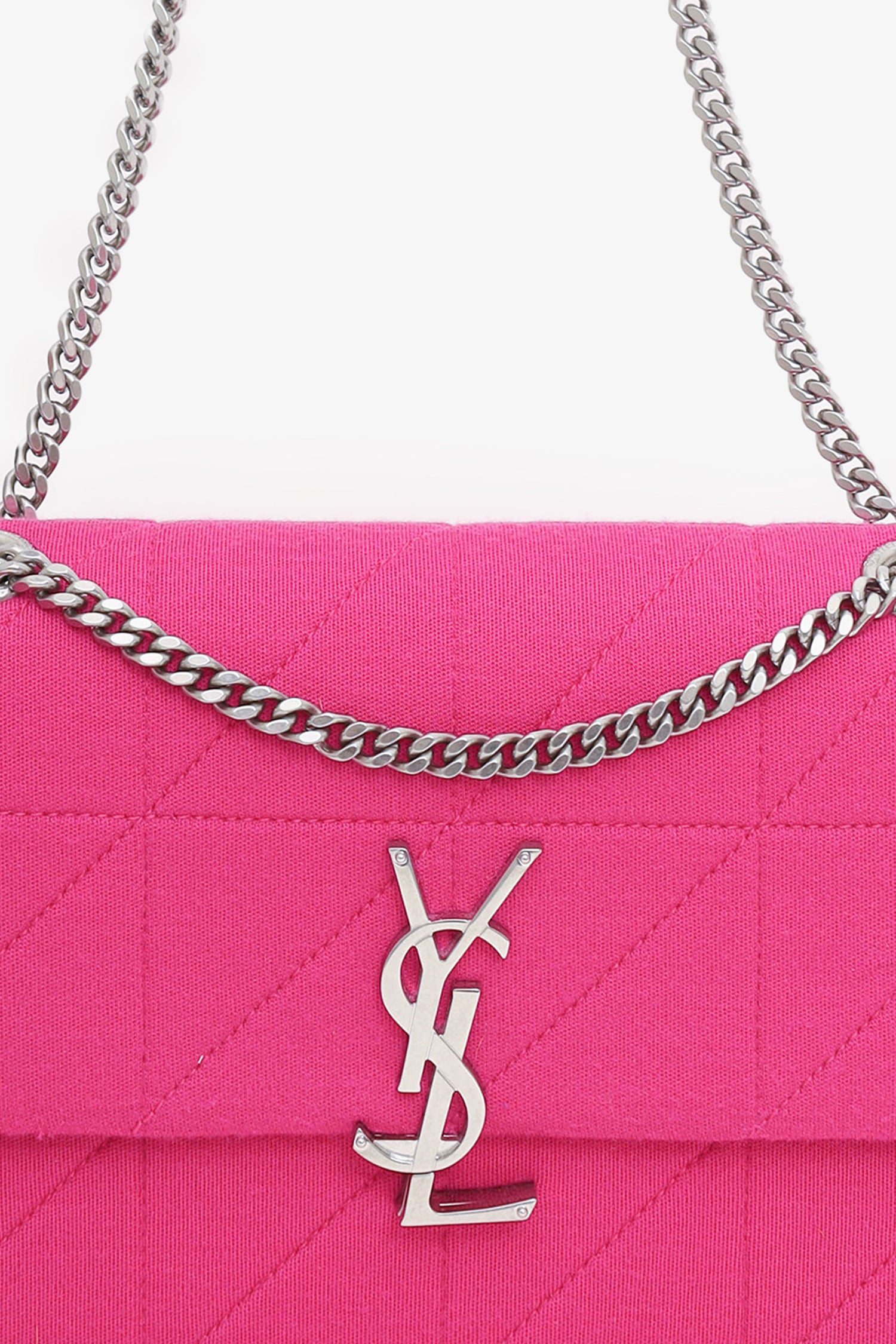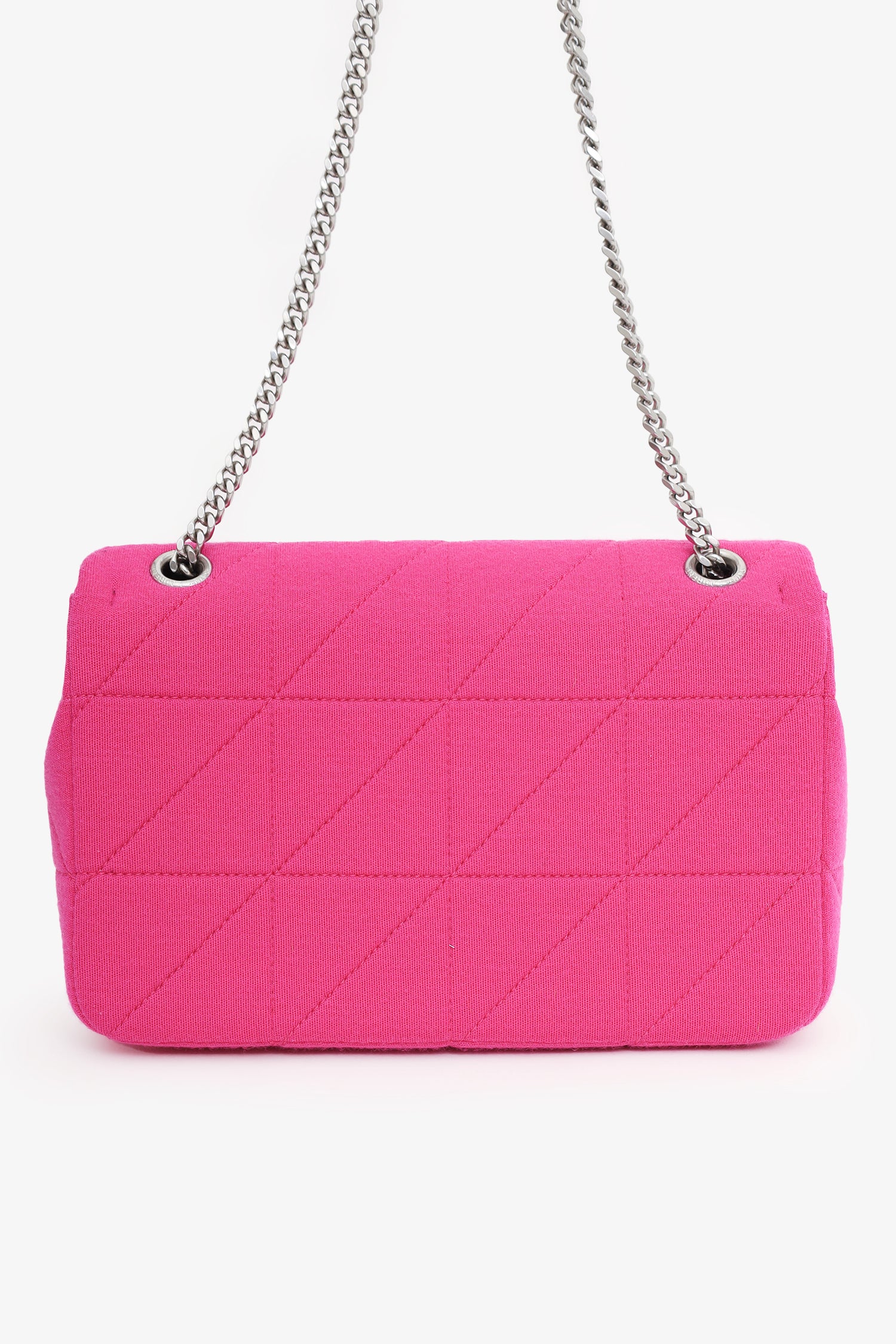 Refresh availabilitySaint Laurent Pink Jersey Medium Jamie Bag. Front fold-over flap with turn-lock closure. Double chain shoulder/crossbody strap. Open interior with single wall slip pocket. Silver-tone hardware. Tonal stitching.