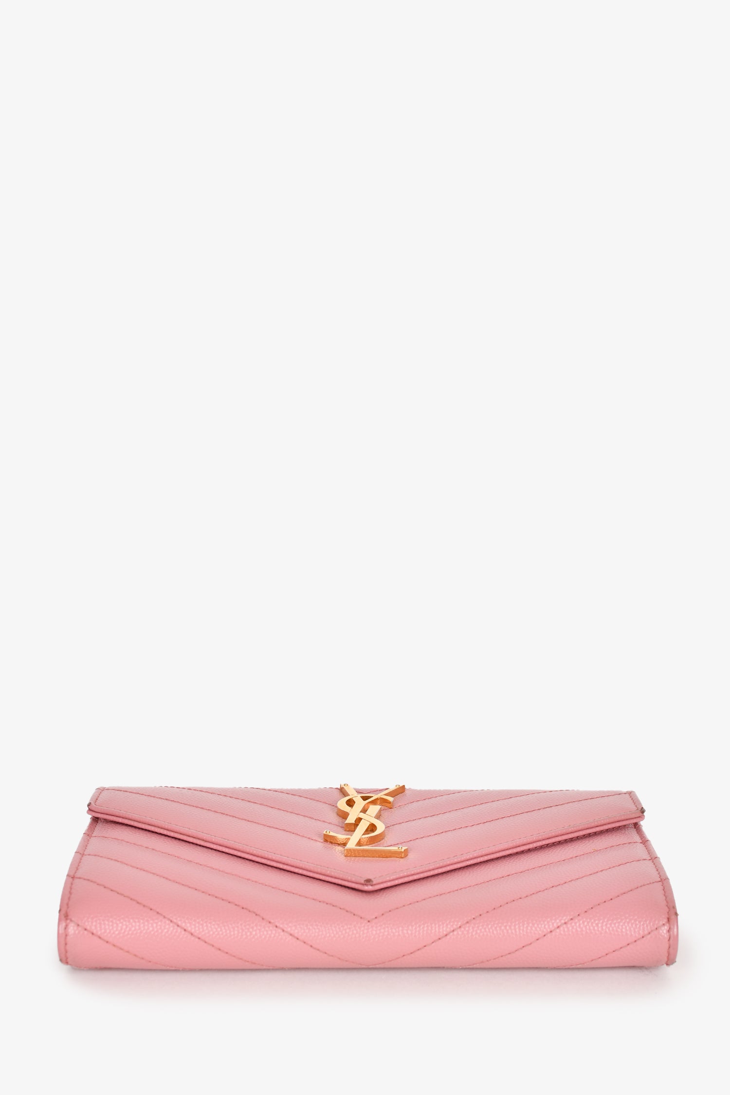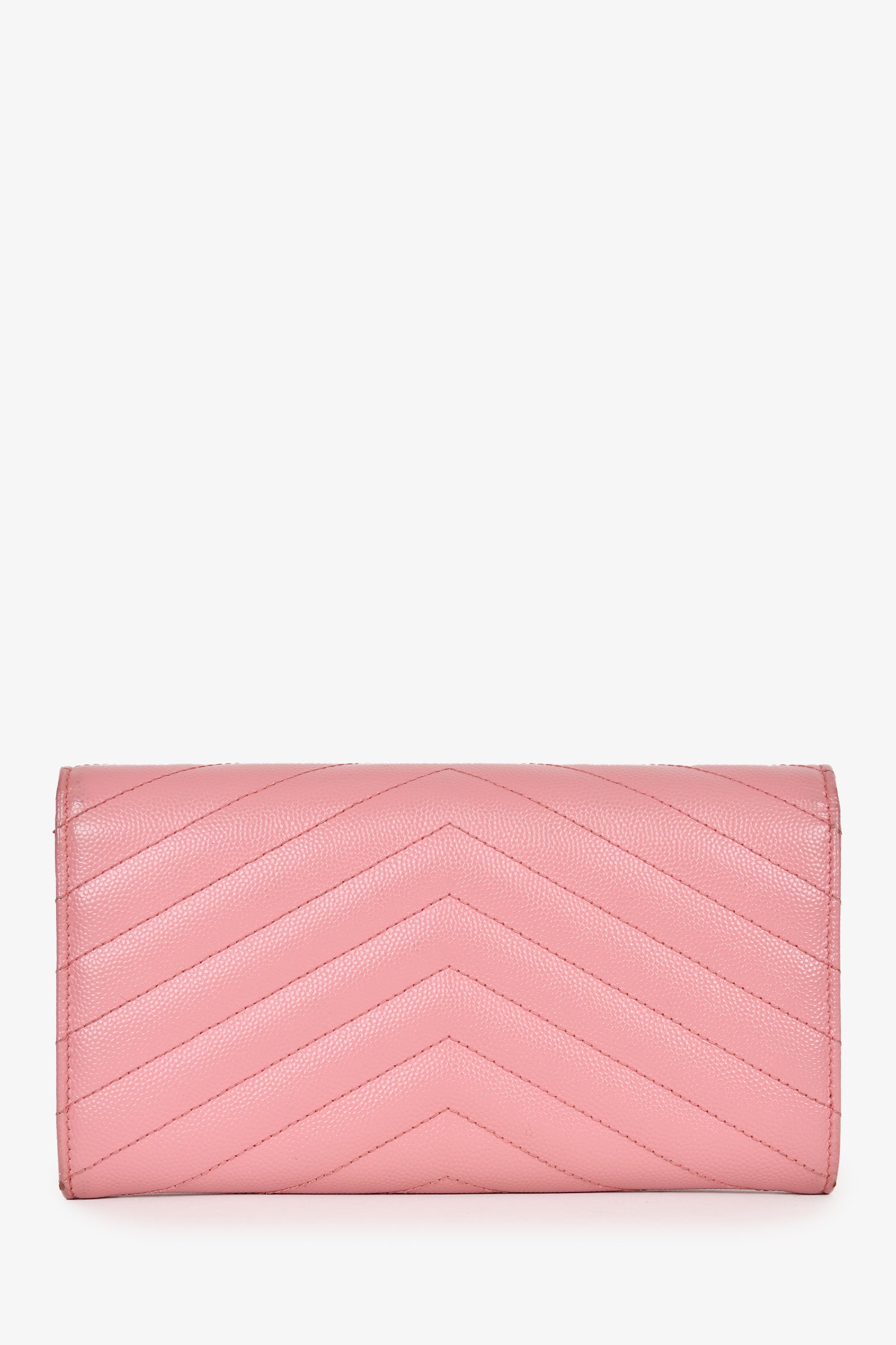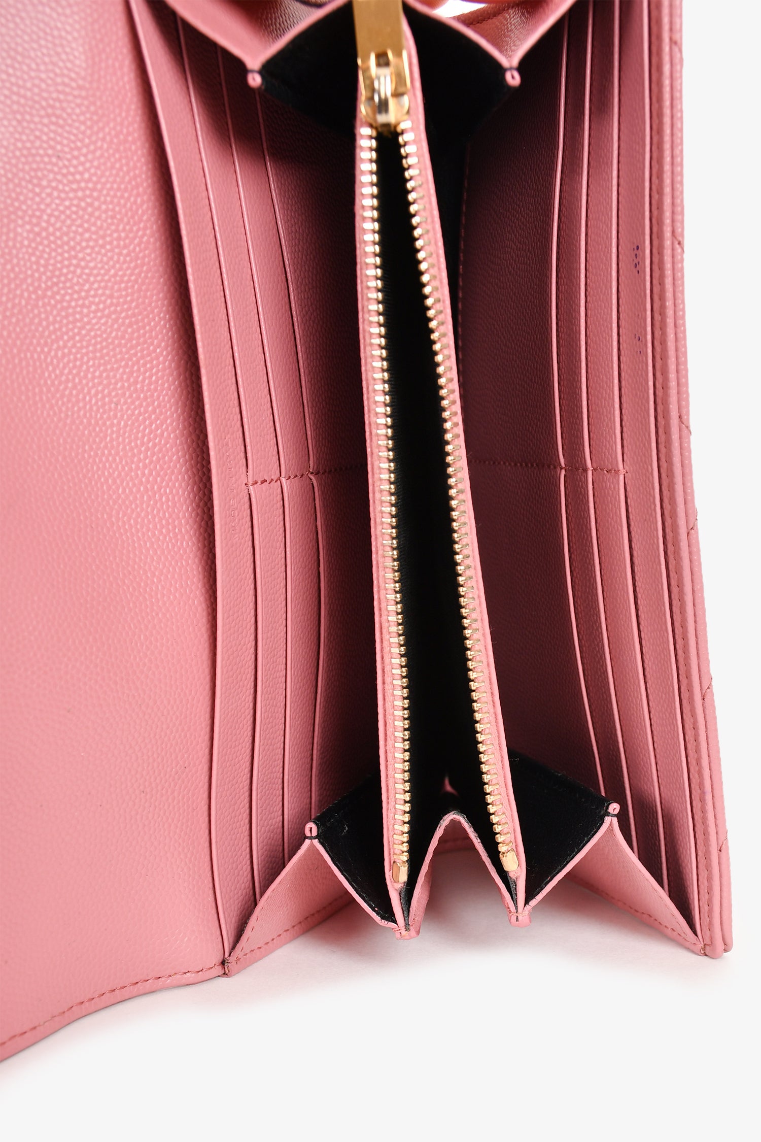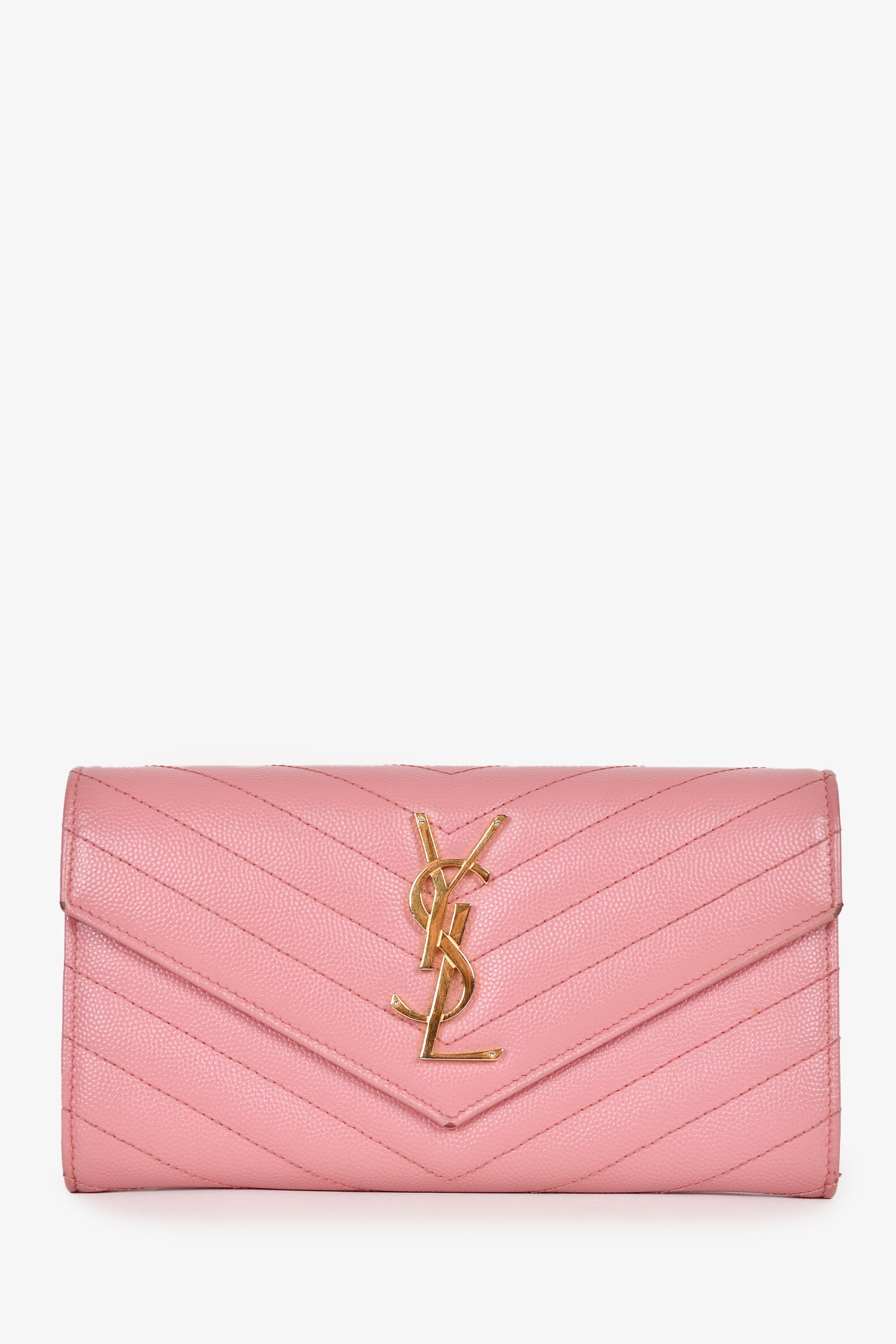 Refresh availabilitySaint Laurent Pink Leather Cassandre Matelasse Large Flap Wallet. Front fold-over flap with magnetic button closure. 12 interior card slots. 1 interior zip compartment. 2 bilfold compartments. Gold-tone hardware. Tonal stitching.