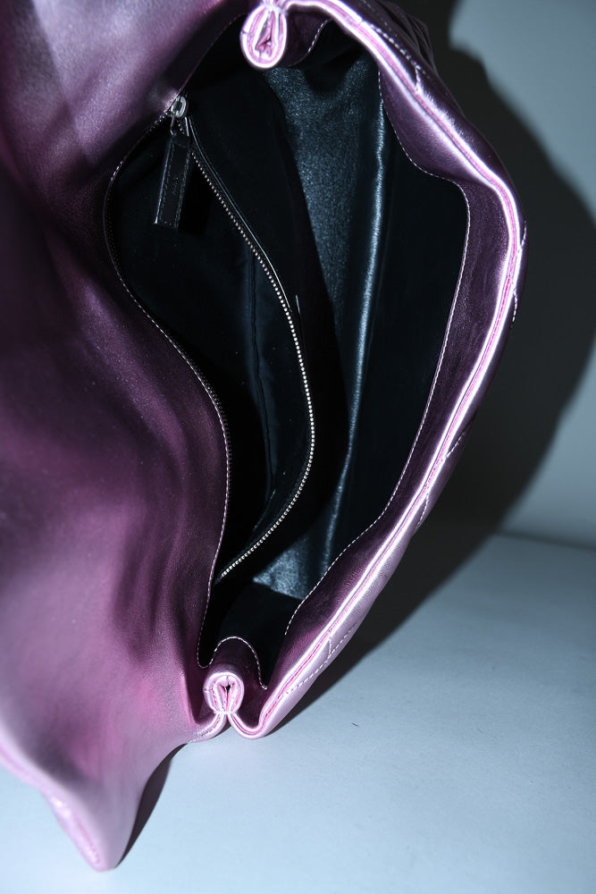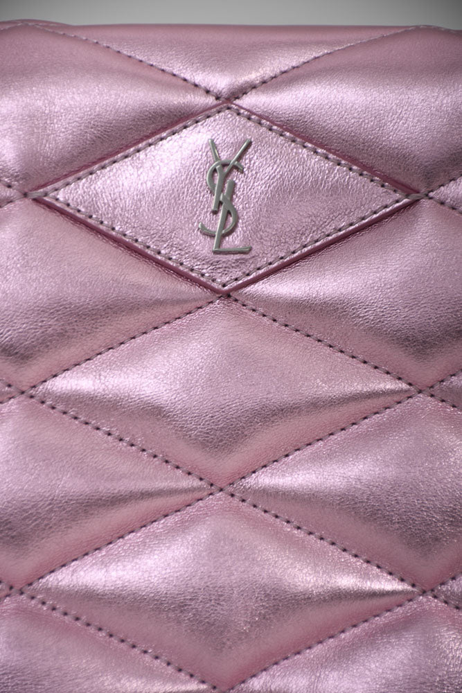 Refresh availabilitySaint Laurent Pink Metallic Envelope Quilted Clutch. Front foldover flap with magnetic button closure. Black interior. Single interior wall zip pocket. Silver-tone hardware. Tonal stitching.