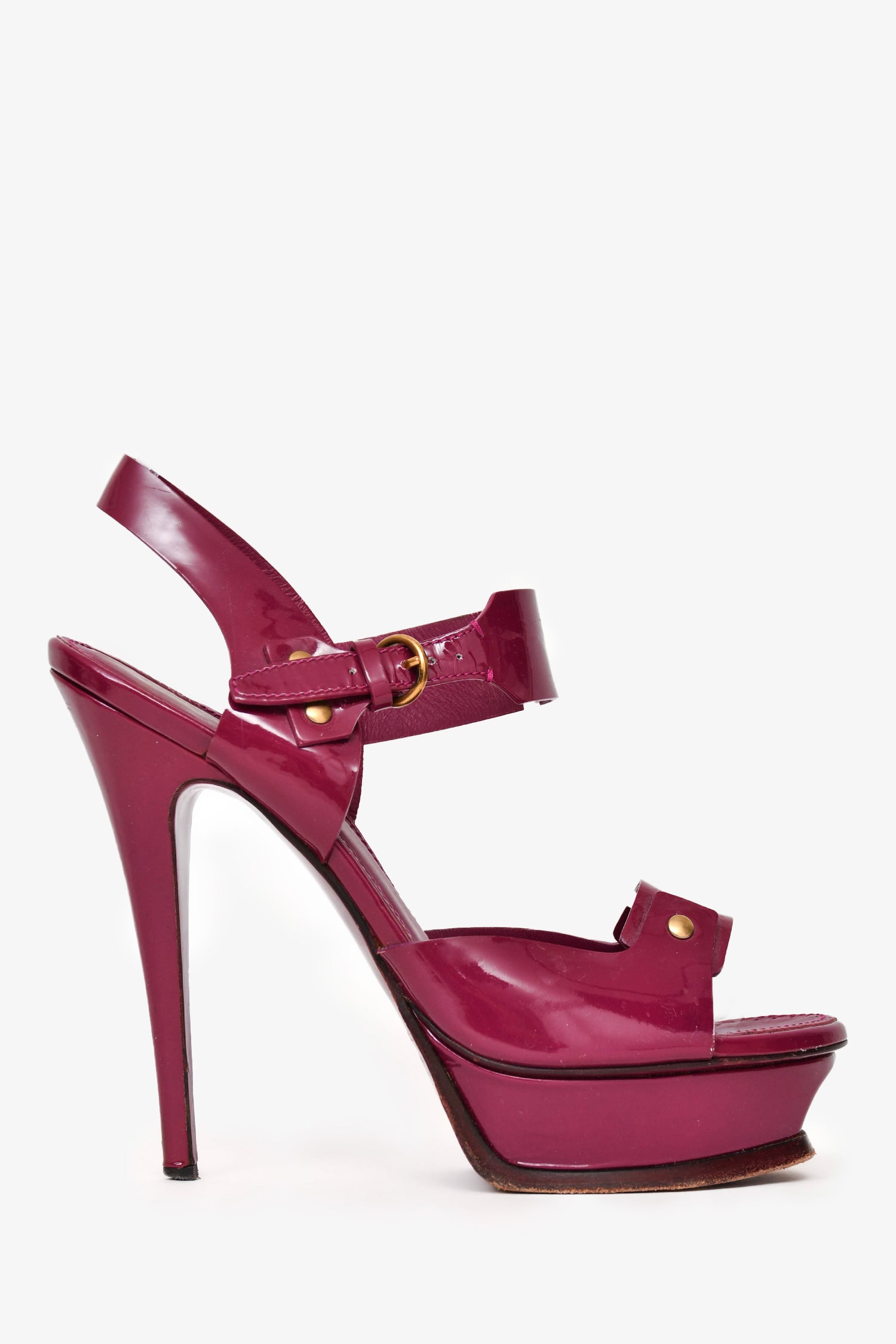Refresh availabilitySaint Laurent Purple Patent Platform Tribute Heels. Peep toe. Gold-tone hardware. Buckle closure at the ankle. Tonal stitching.