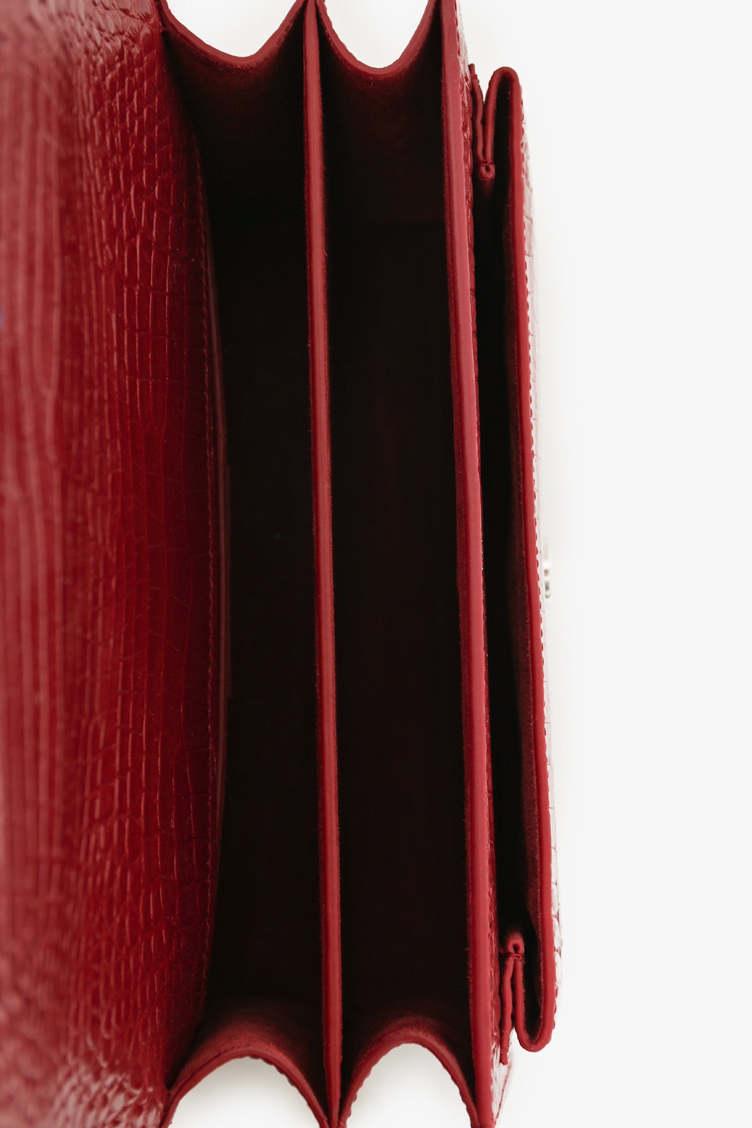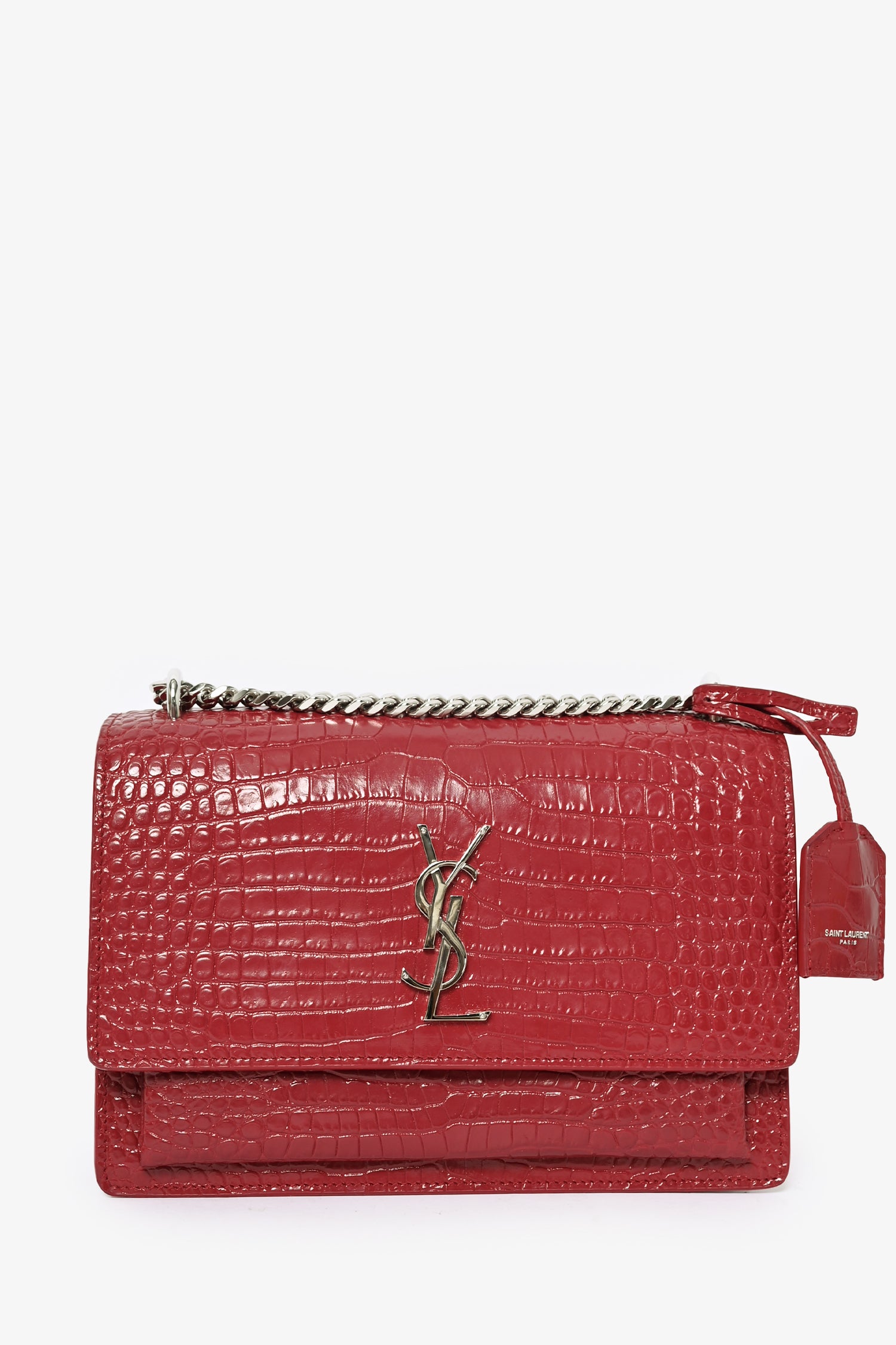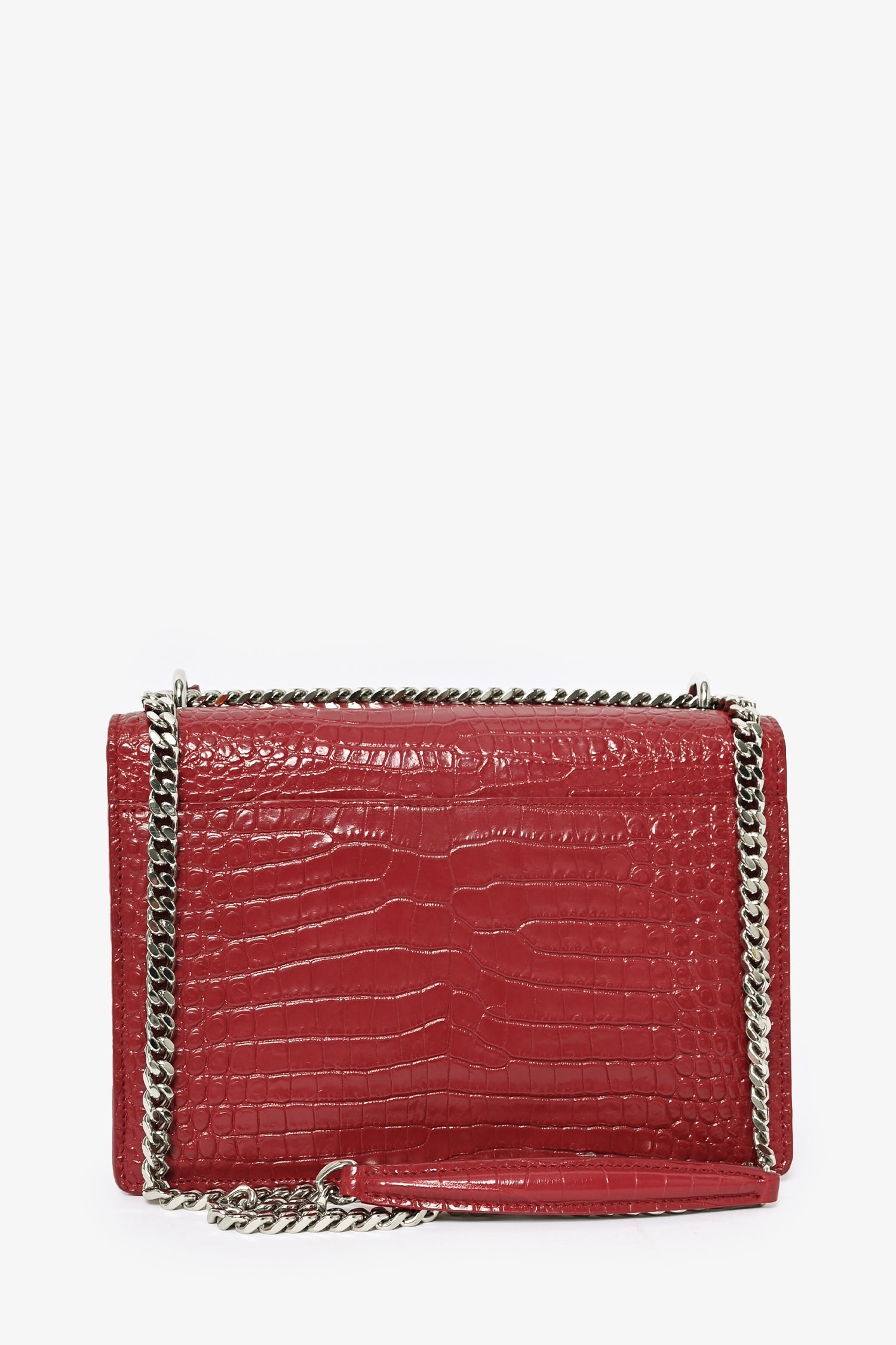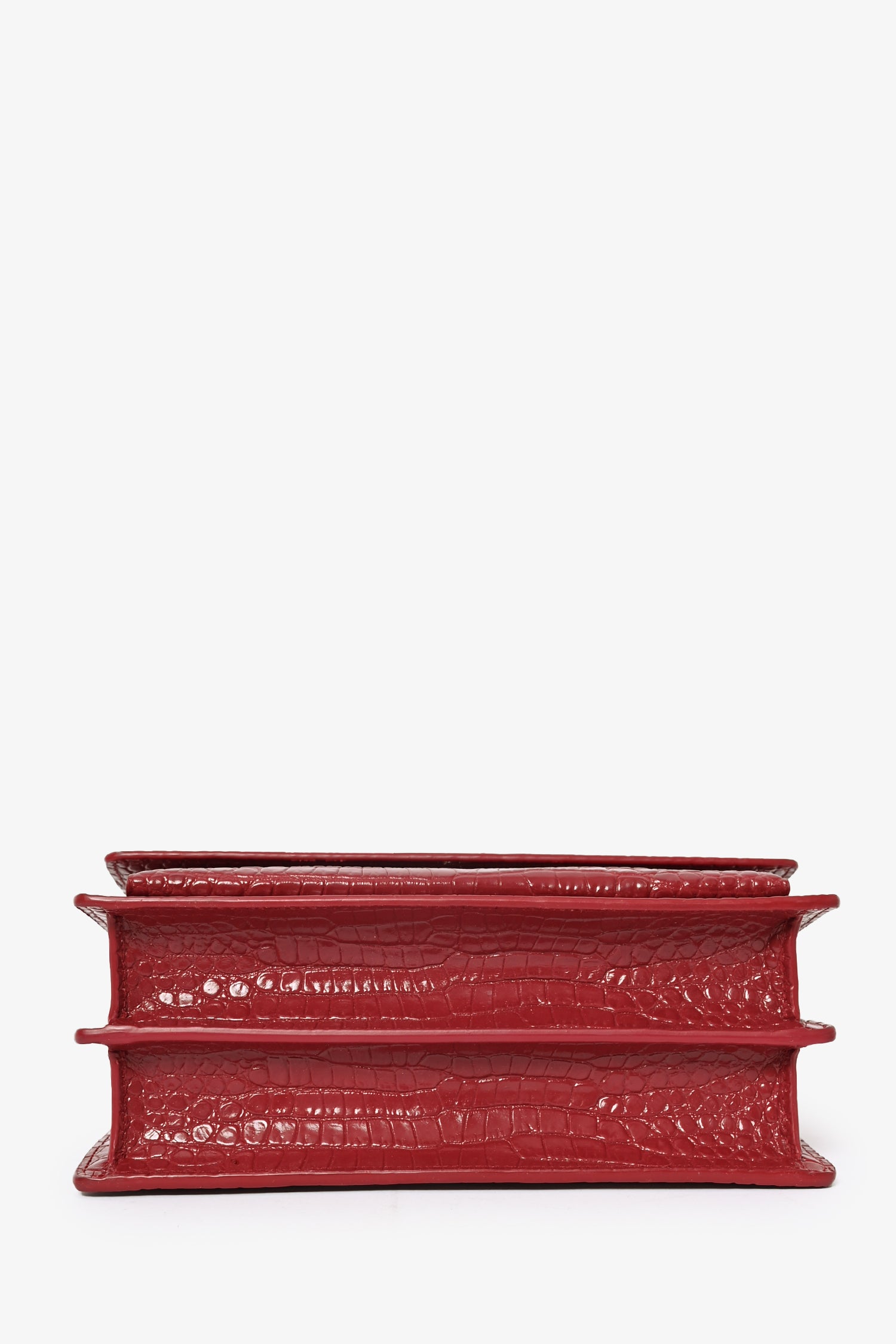 Saint Laurent Red Croc Embossed Leather 'Sunset'Medium Crossbody Bag. Silver-toned hardware. Chain-link shoulder strap. Magnetic snap closure. Suede interior. 4 interior compartments. Exterior pocket. Attached clochette. Comes with dust bag.