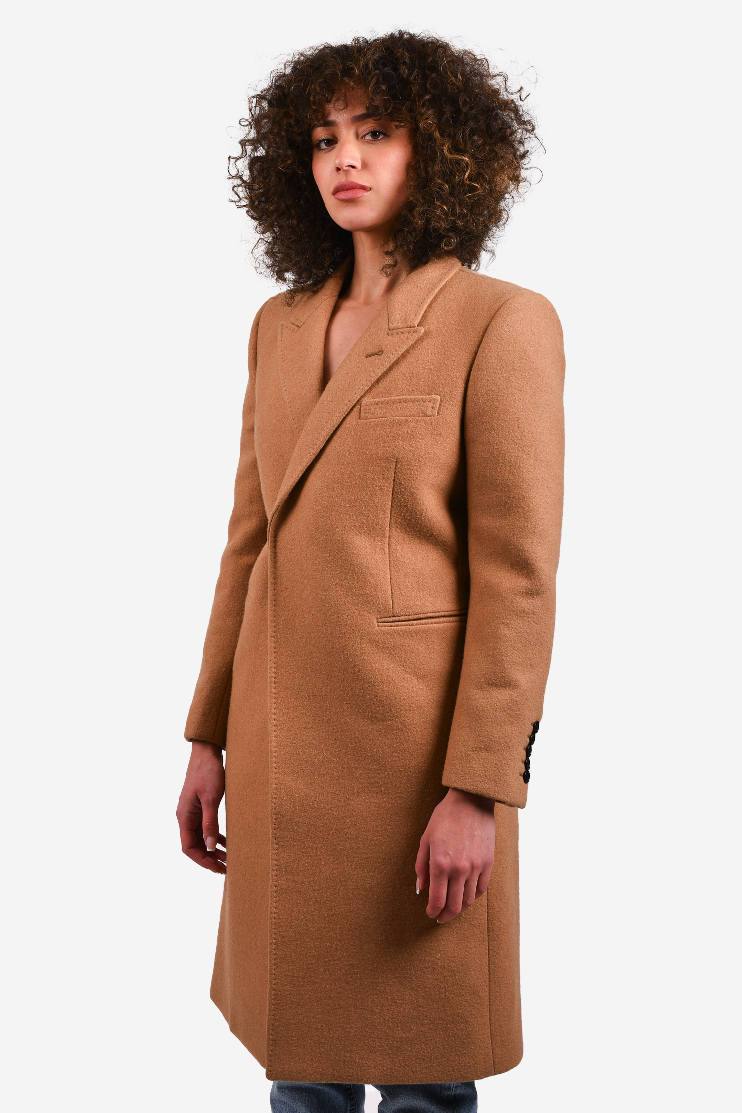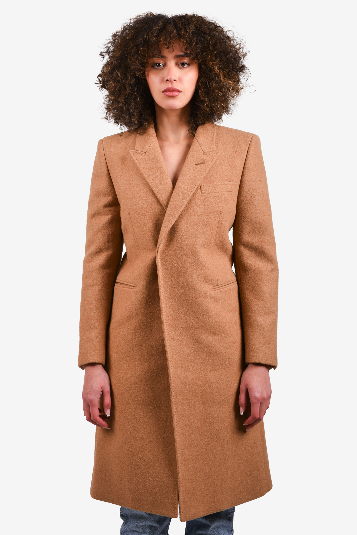 Refresh availabilitySaint Laurent Tan Camel Hair Single Breasted Coat. Single front button closure. Front pockets. Lined. Padded shoulders. Tonal stitching.