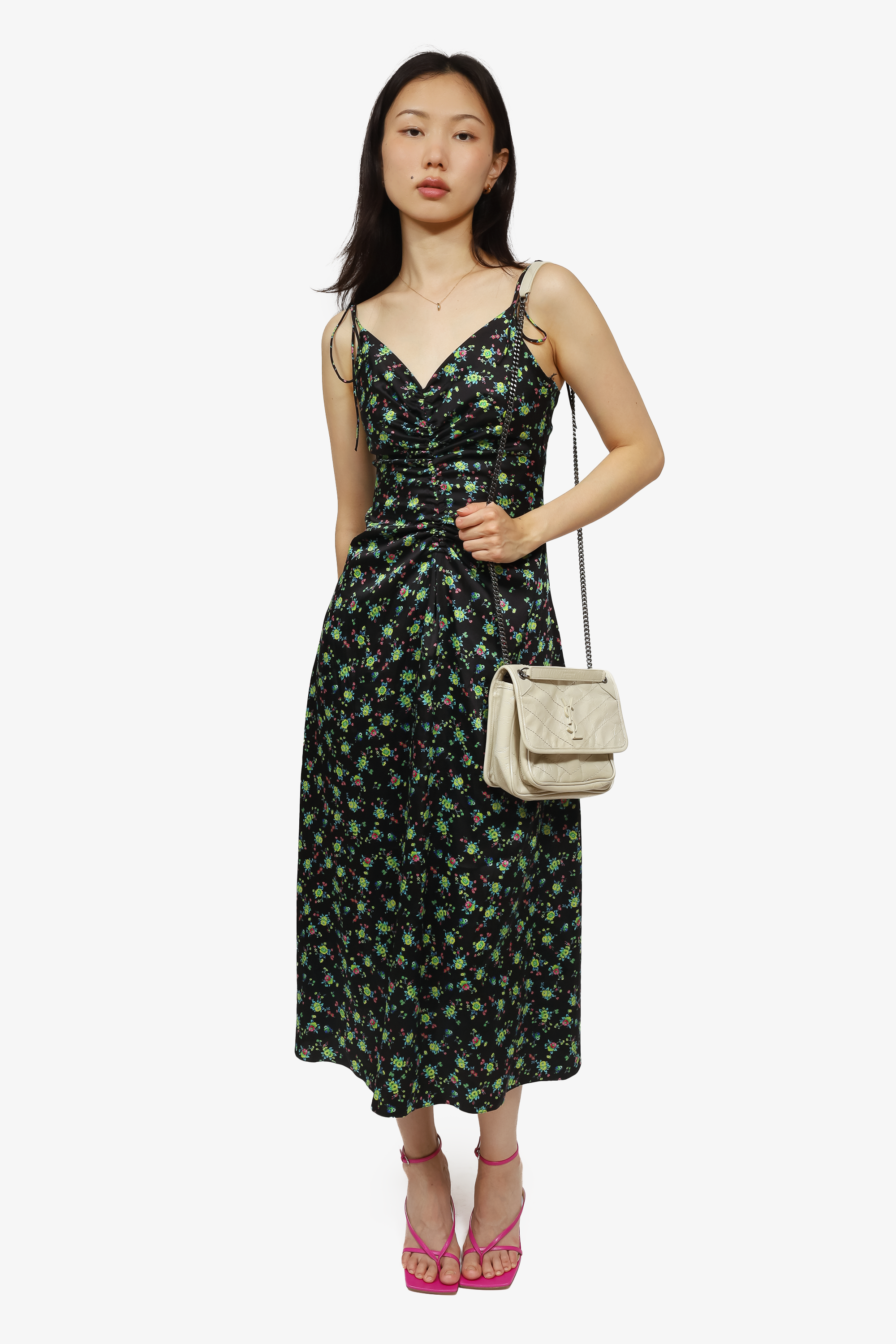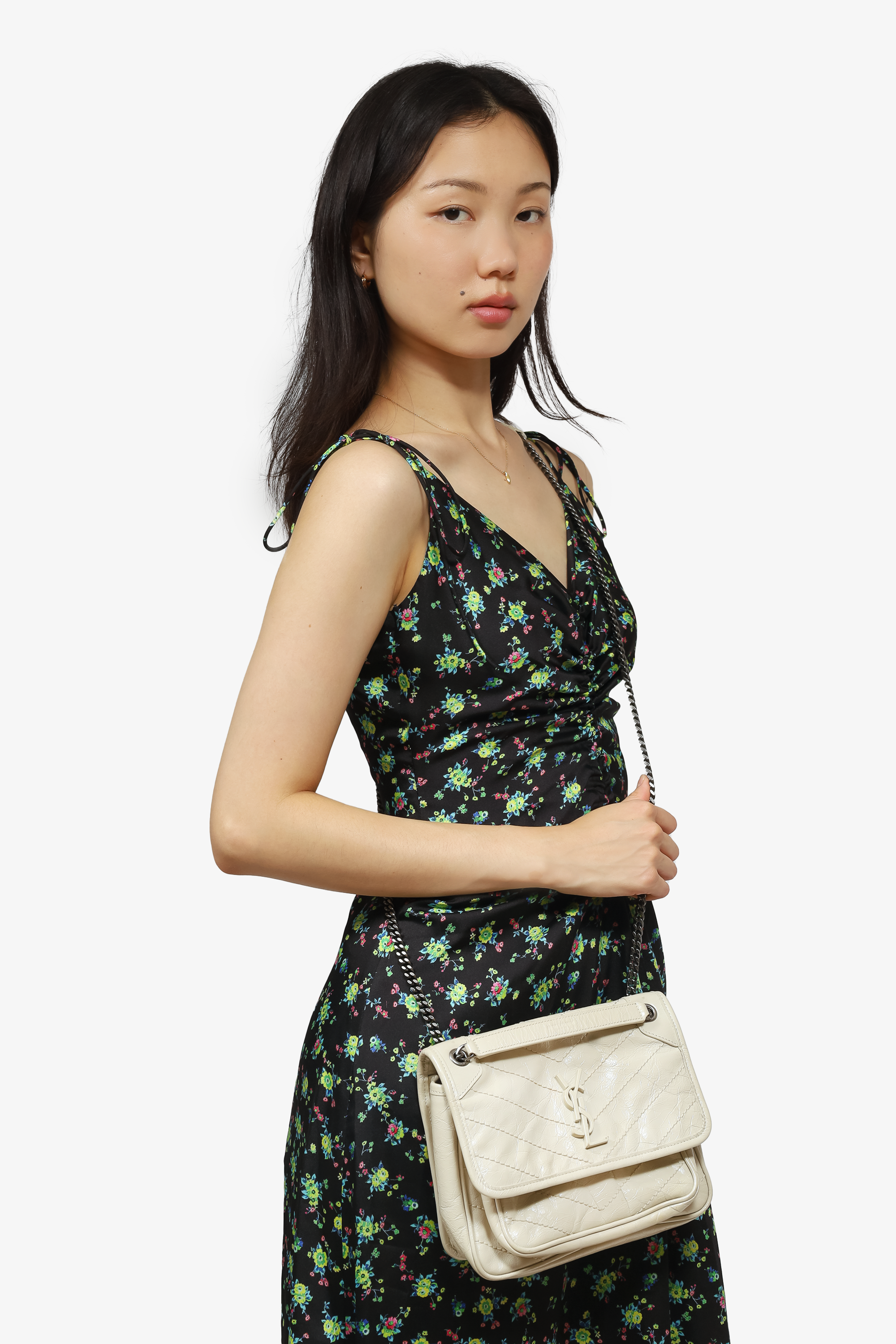 Refresh availabilitySaint Laurent White Crinkle Leather Baby Niki Shoulder Bag. Front fold over flap with magnetic button closure. Slip pouch under front fold over flap. 1 interior wall slip pocket. Tonal stitching. 1 exterior slip pocket on back with magnet closure. Silver-tone hardware.