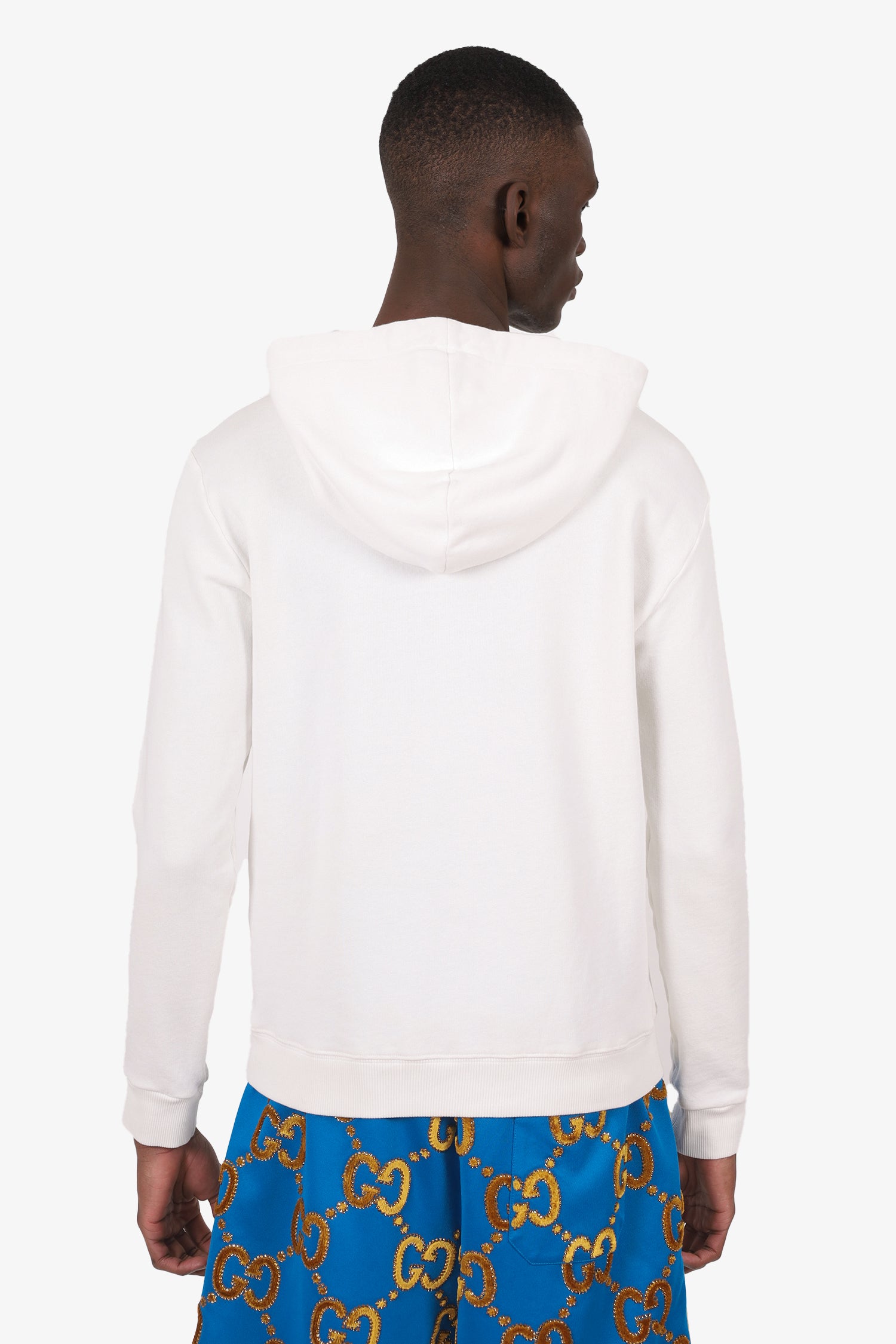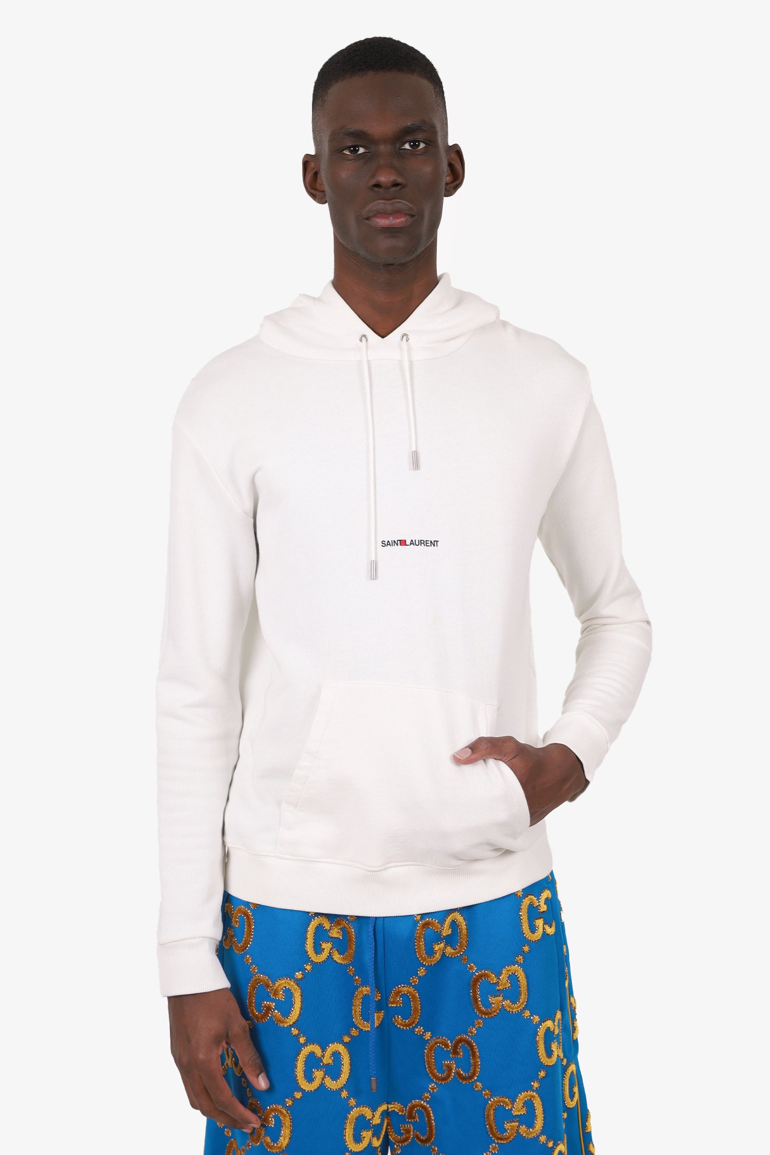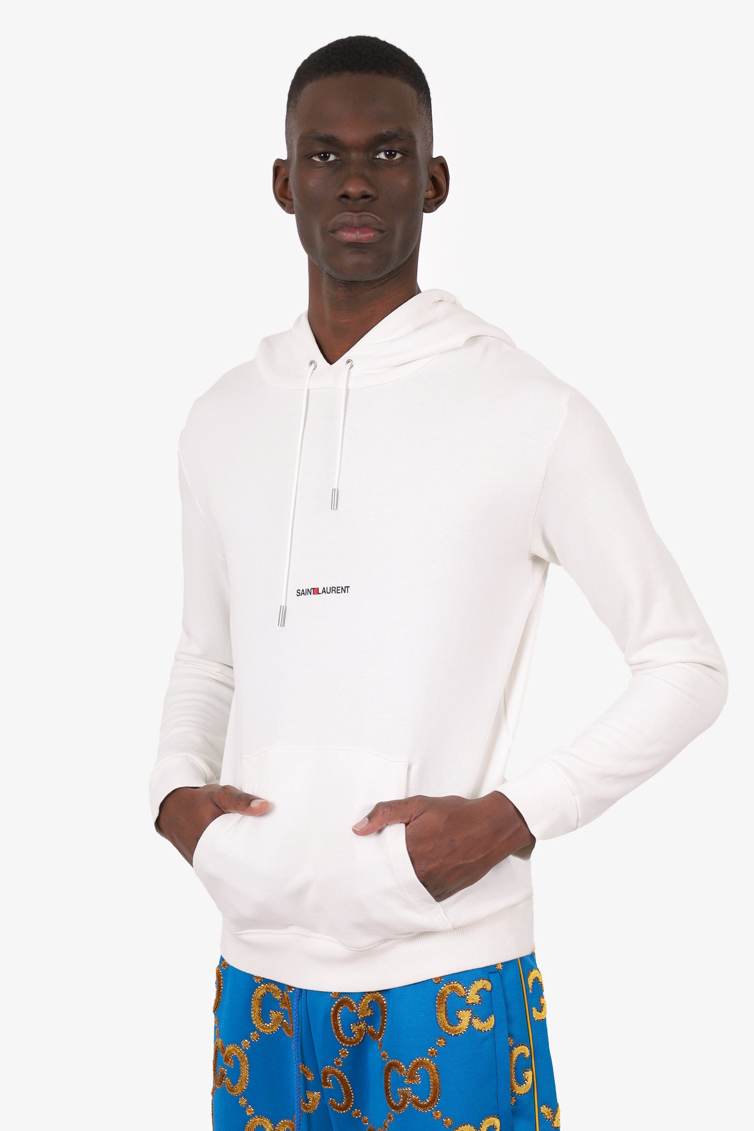 Refresh availabilitySaint Laurent White Logo Hoodie. Pull-on. Hooded with adjustable cinching drawstring closure. Front kangaroo pocket. Ribbed sleeve cuffs and bottom hem. Silver-tone hardware. Tonal stitching.