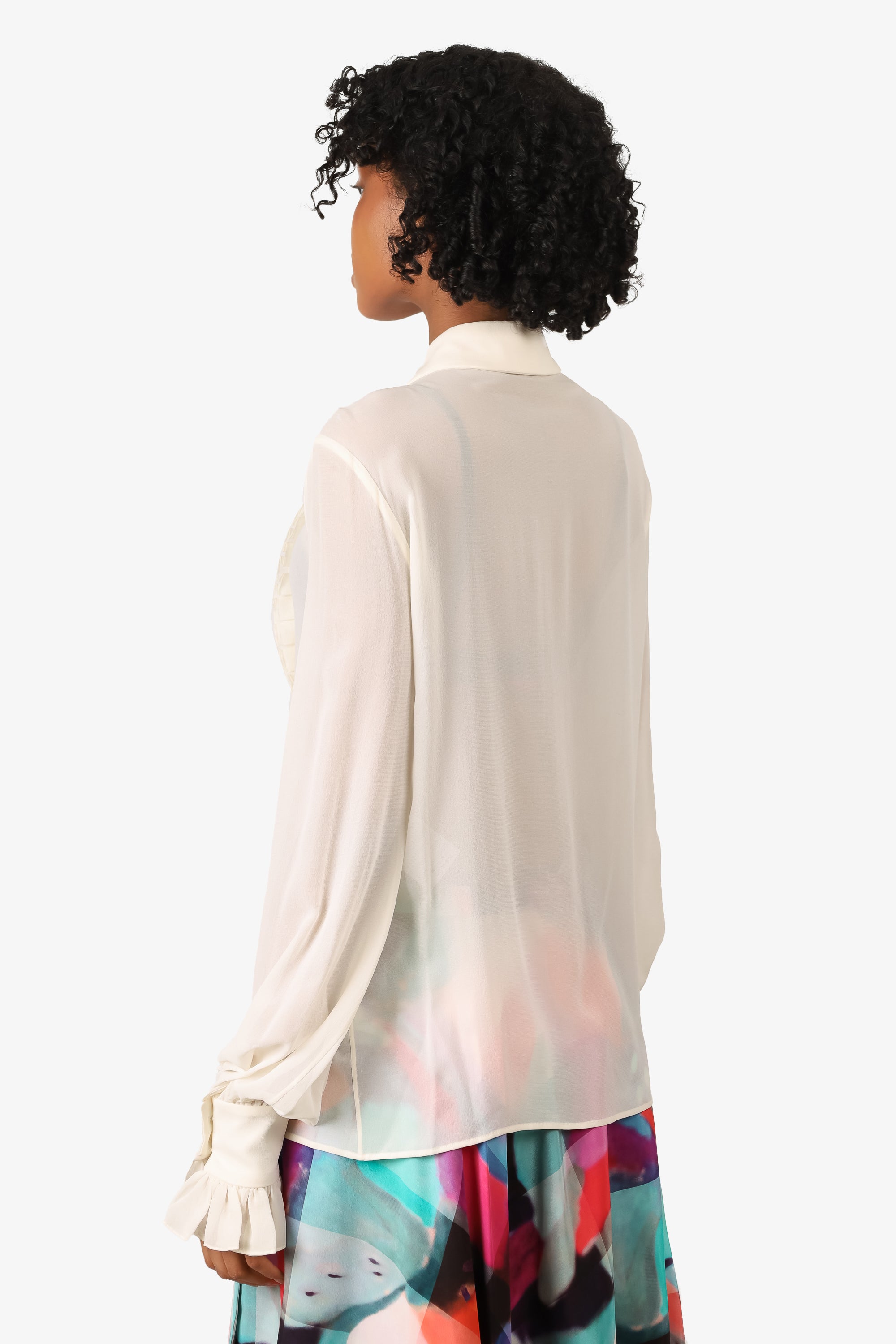 Refresh availabilitySaint Laurent White Silk Ruffled Blouse. Front button closure. Collared neckline. Ruffle detail on sleeves. Tonal stitching.