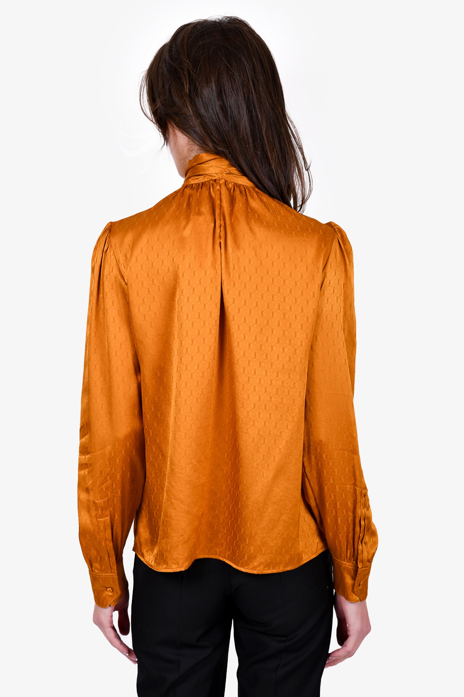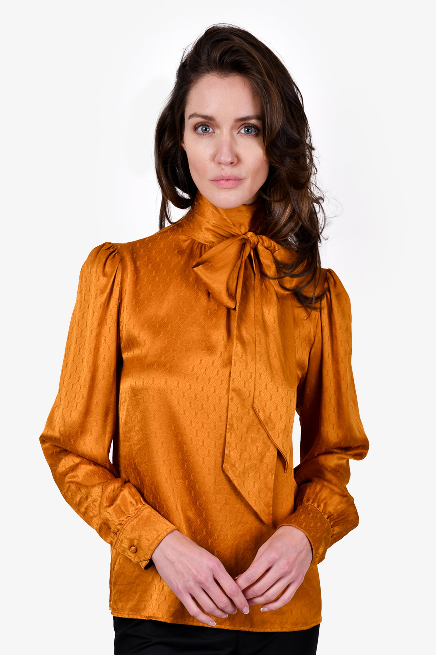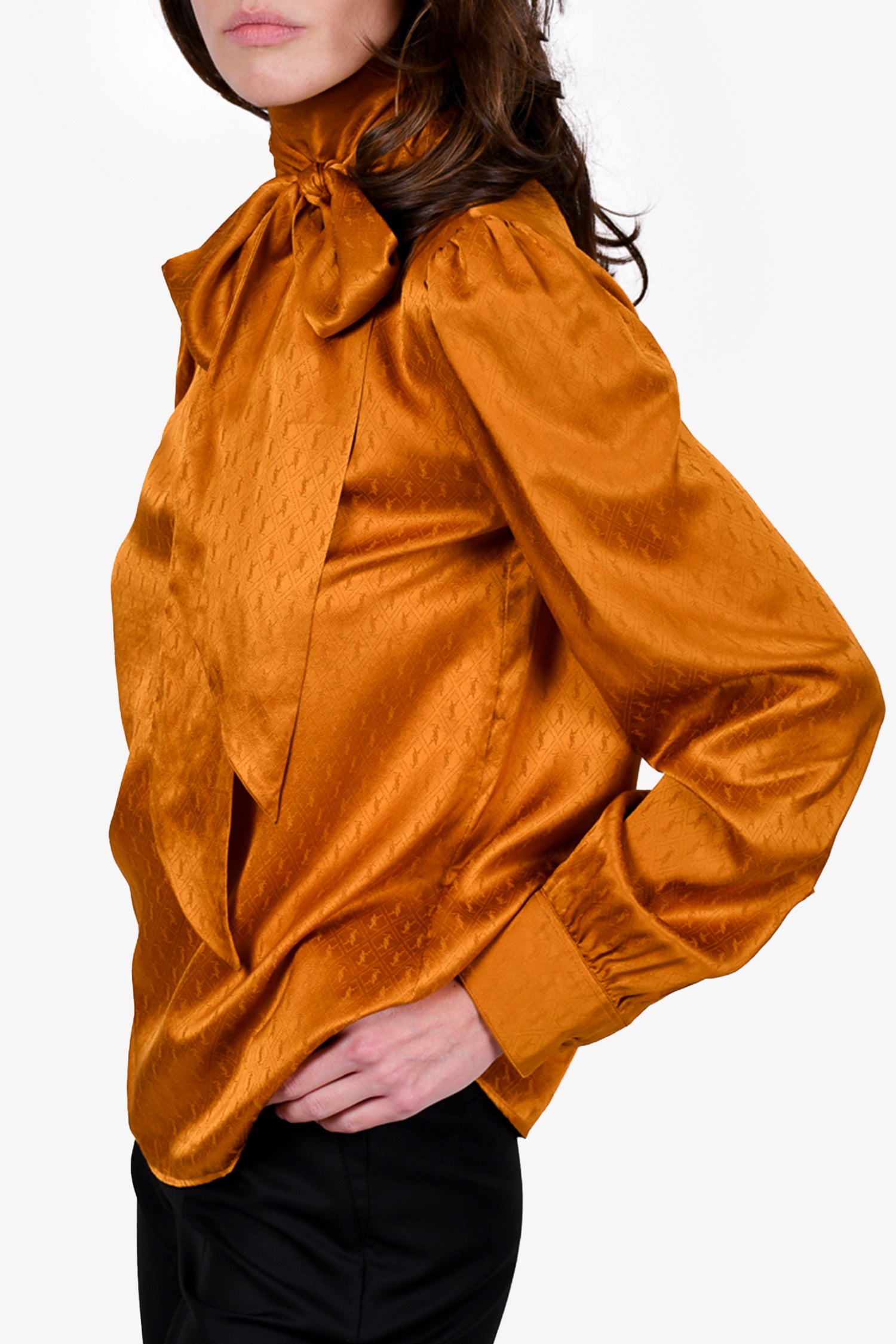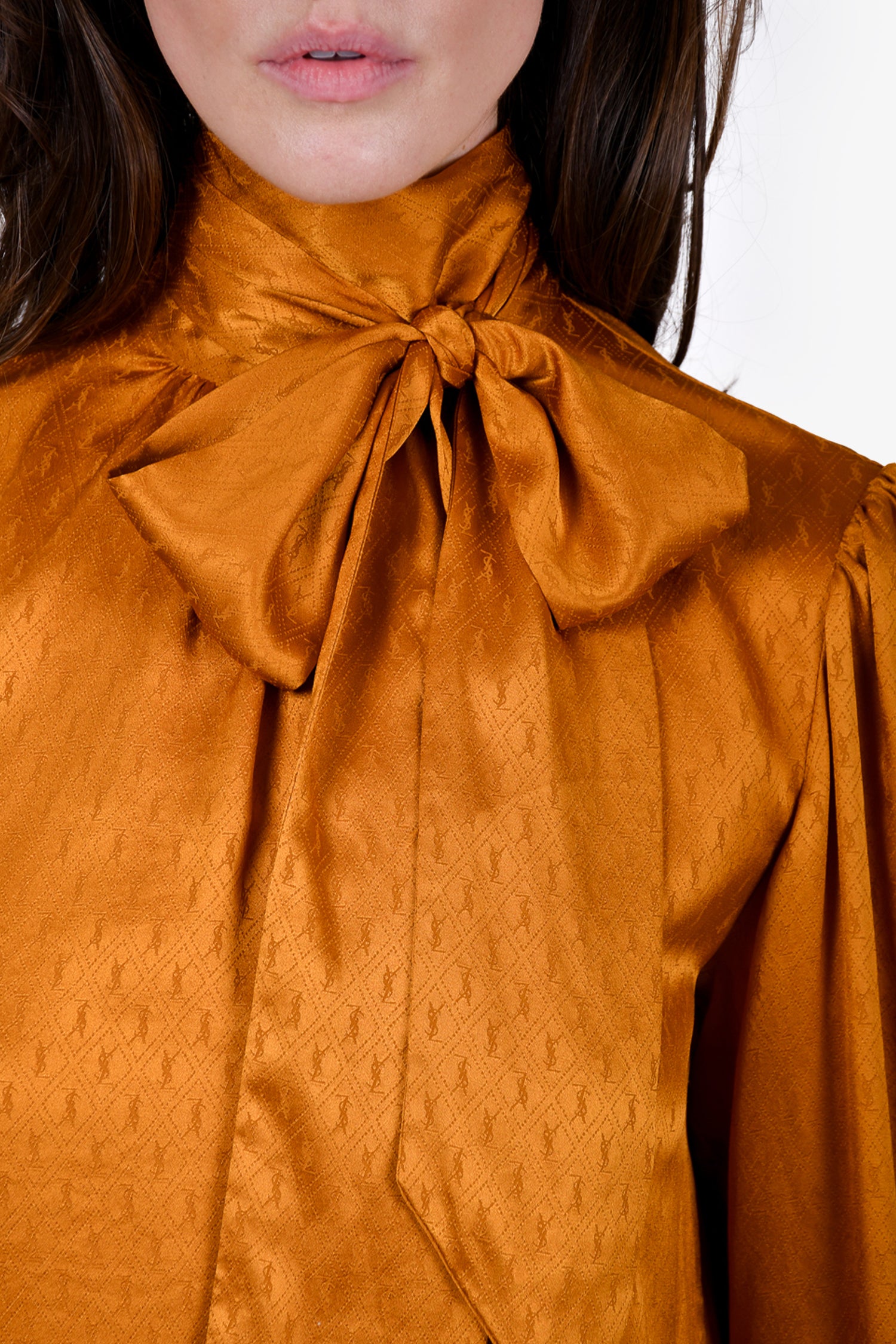 Refresh availabilitySaint Laurent Yellow Silk Monogram Blouse. Self tie-up neck tie. Tonal stitching.