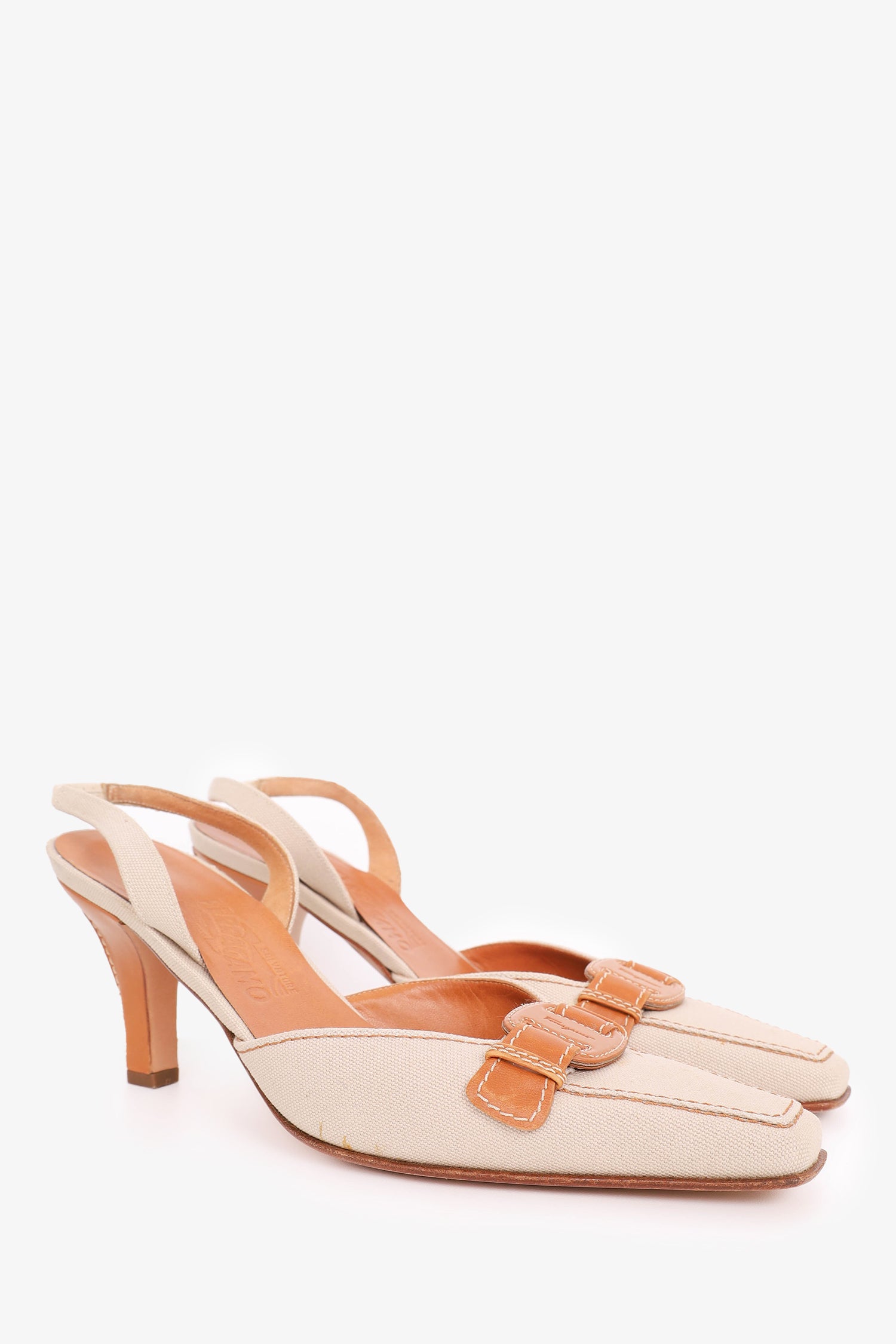 Refresh availabilitySalvatore Ferragamo Beige/Brown Canvas/Leather Square Toe Sling Back Heels. Brown buckle detailing with embossed logo. Contrasting brown heel. Contrasting stitching.