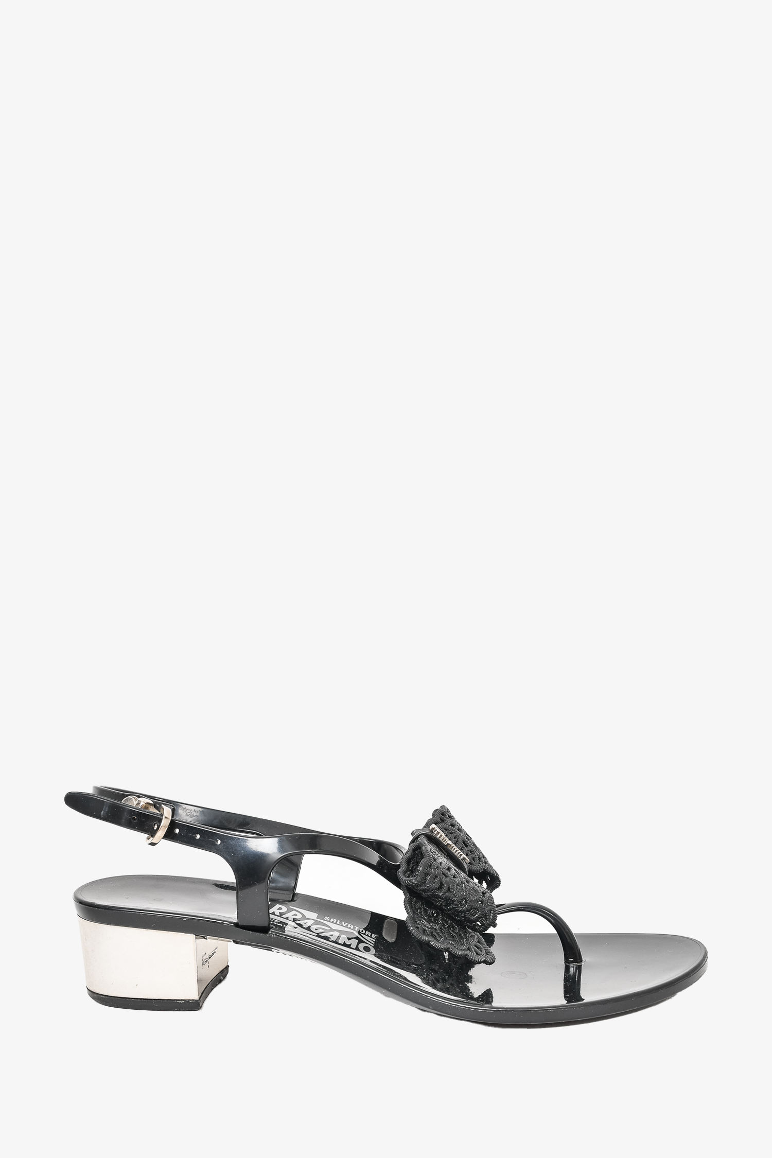 Refresh availabilitySalvatore Ferragamo Black Bow Detail Sandals with Silver Heels. Adjustable ankle strap with buckle closure. Silver-tone hardware. Block heel.