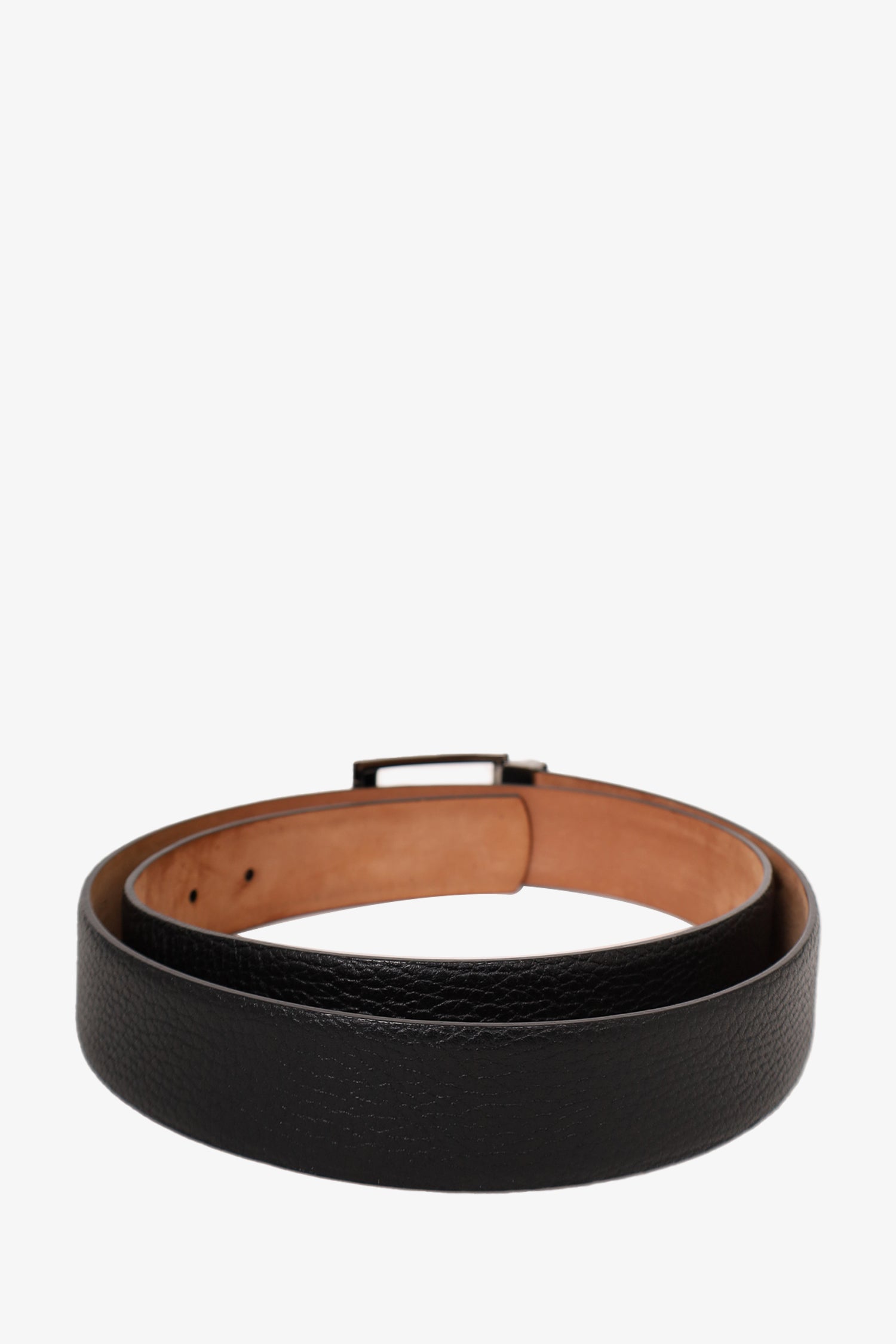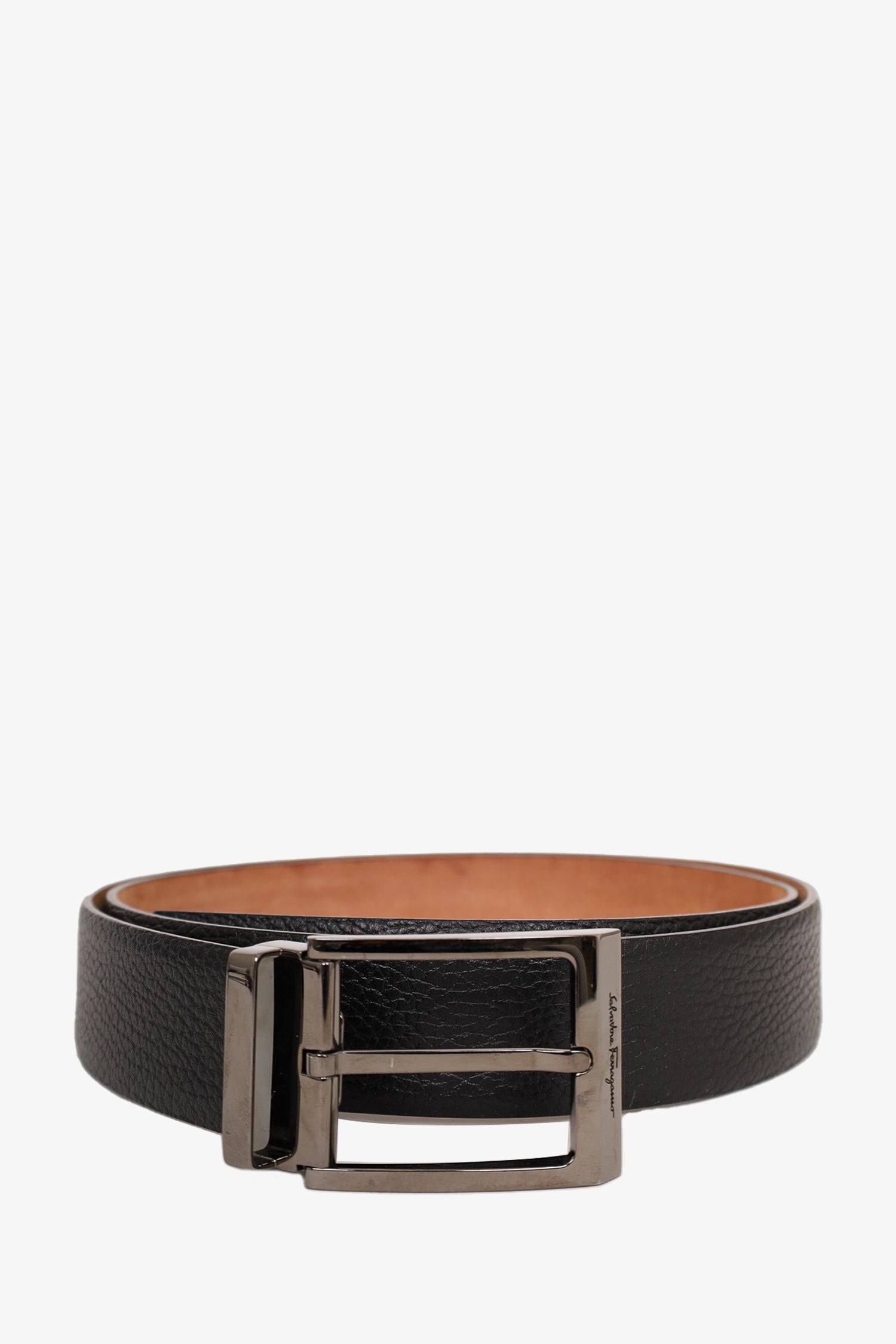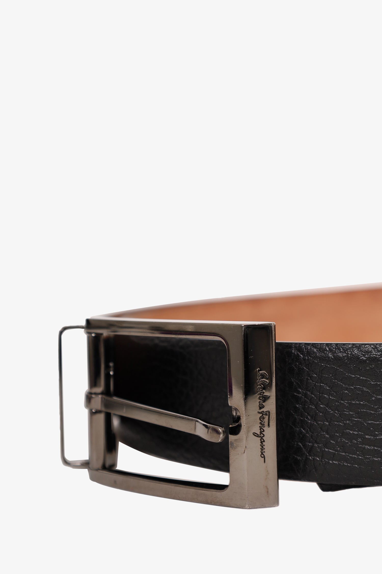 Refresh availabilitySalvatore Ferragamo Black Grained Leather Silver Square Buckle Belt. Gun metal tone hardware. Tonal stitching.