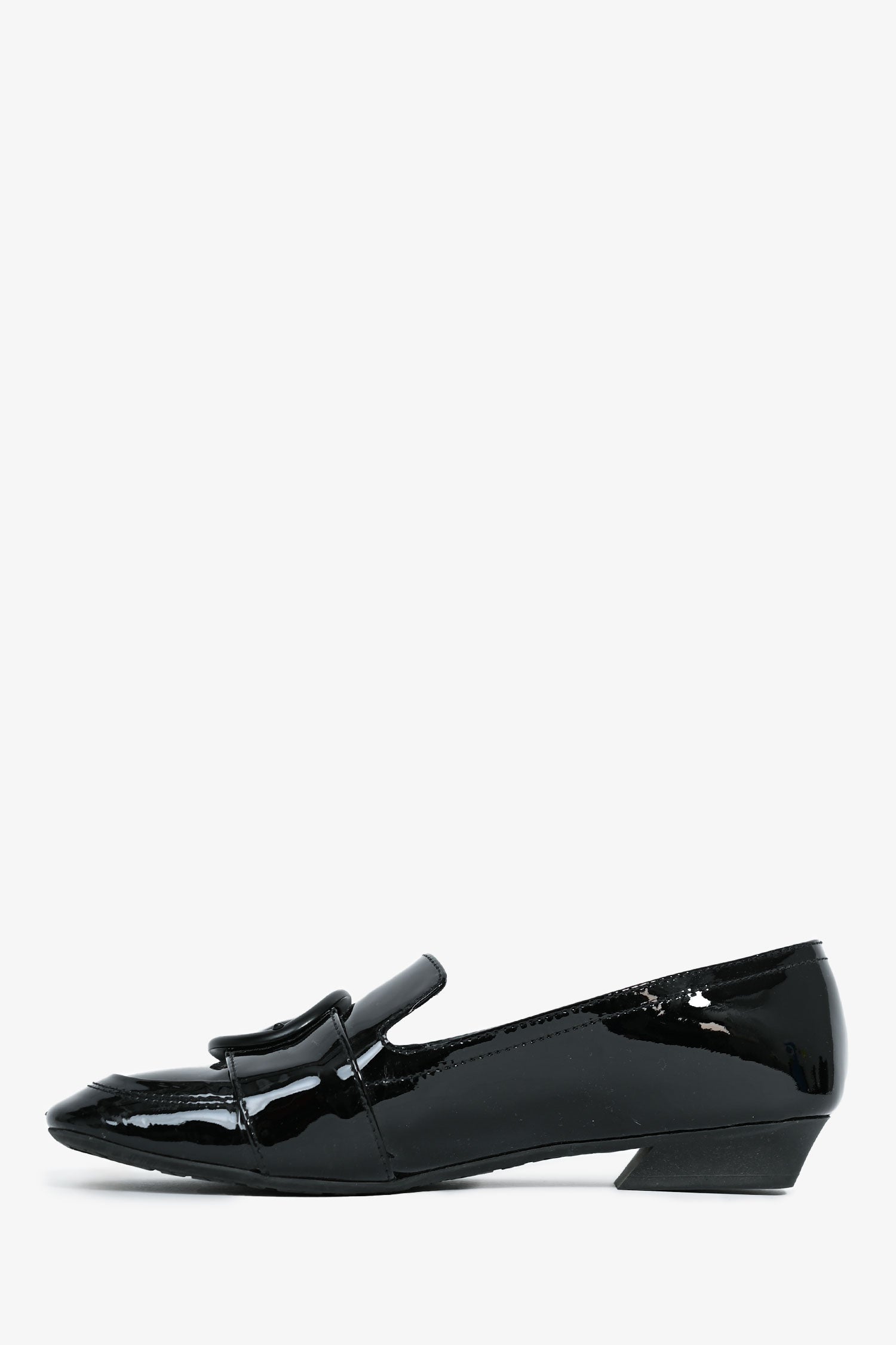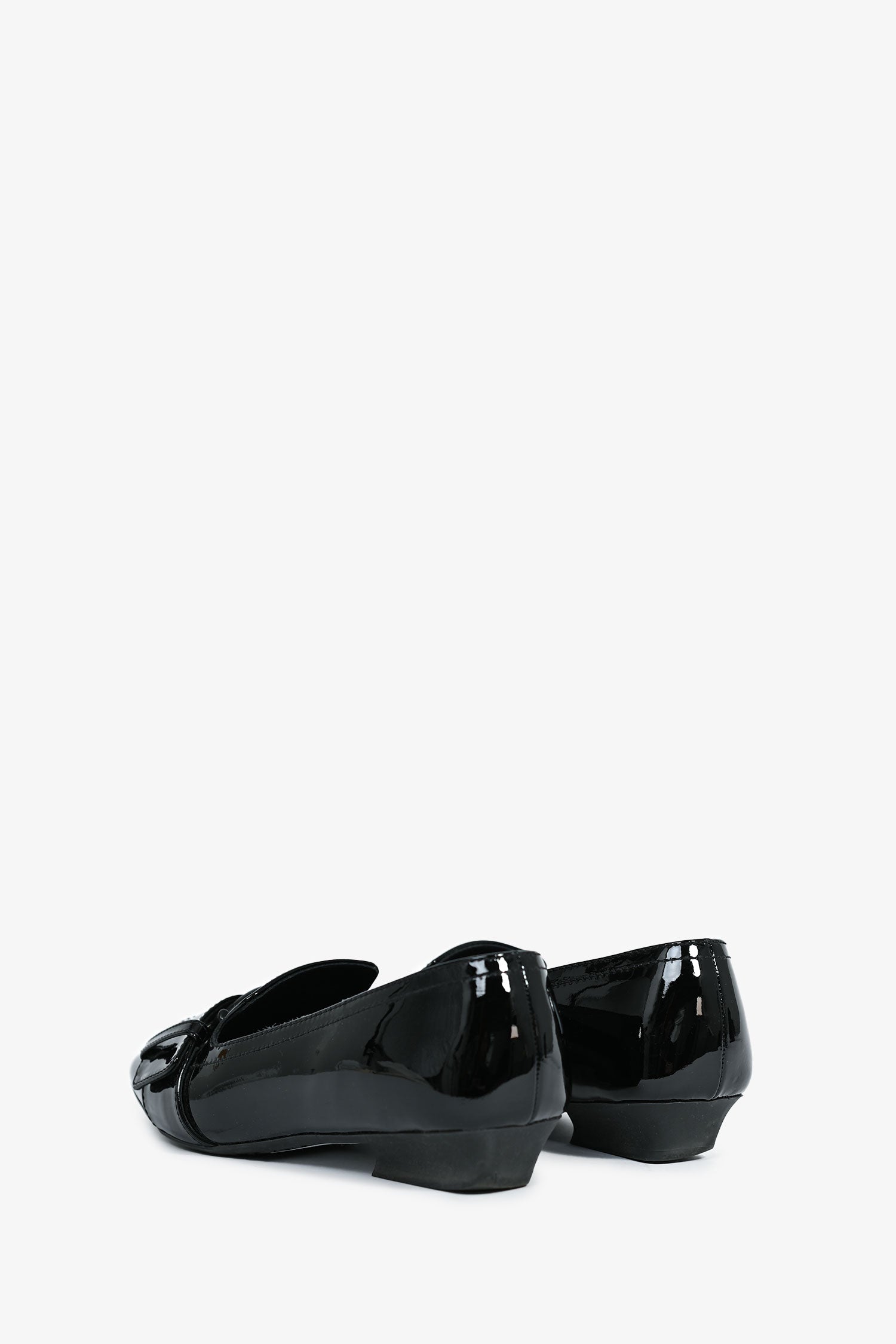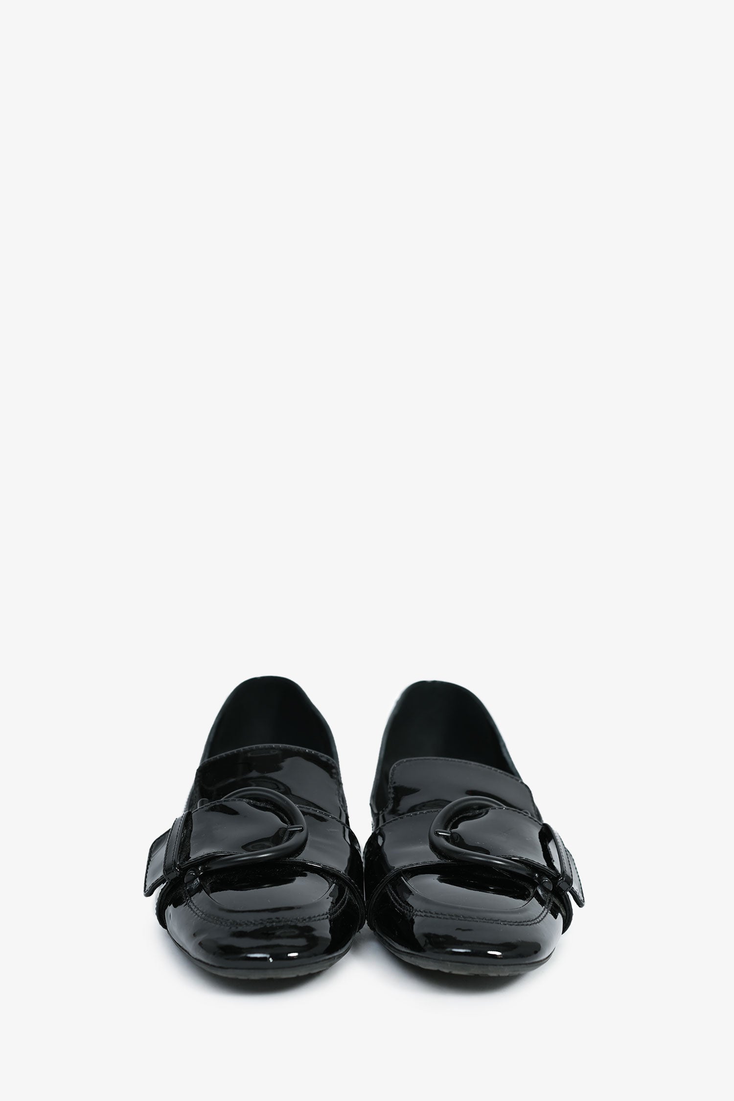 Refresh availabilitySalvatore Ferragamo Black Patent Leather Large Buckle 'Bonnie' Loafers. Tapered square toe. Slip-on. Tonal stitching.