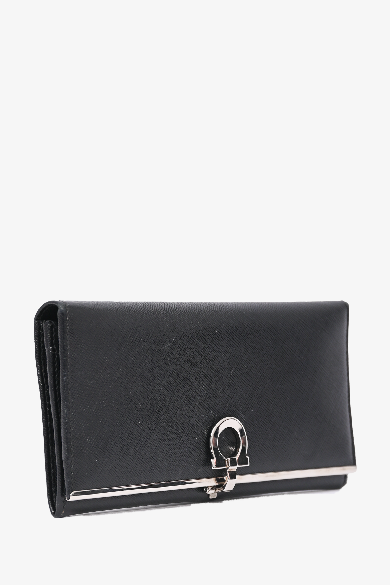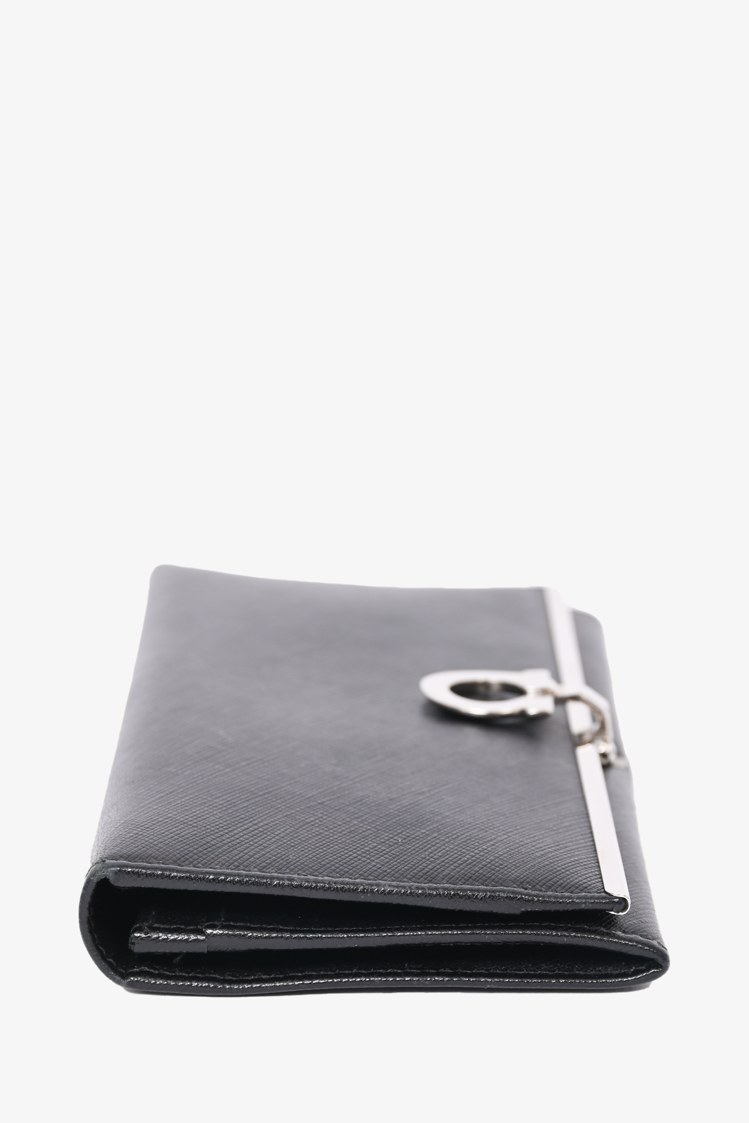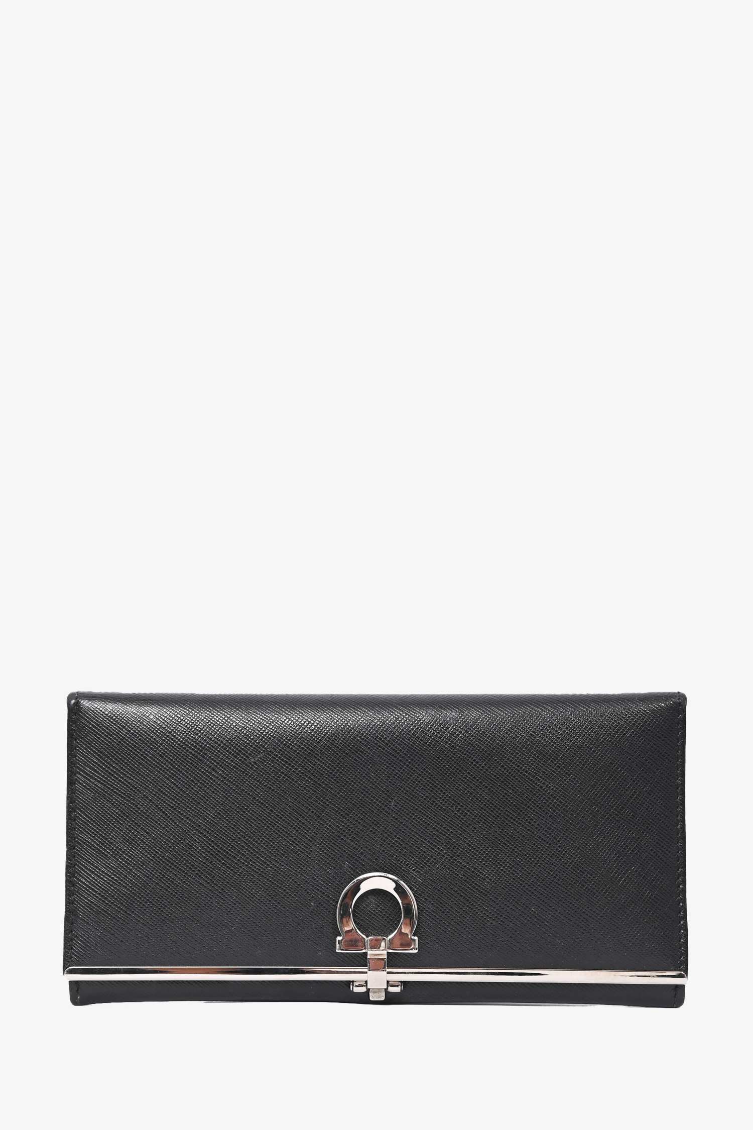 Salvatore Ferragamo Black Saffiano Leather Silver Gancini Closure Wallet