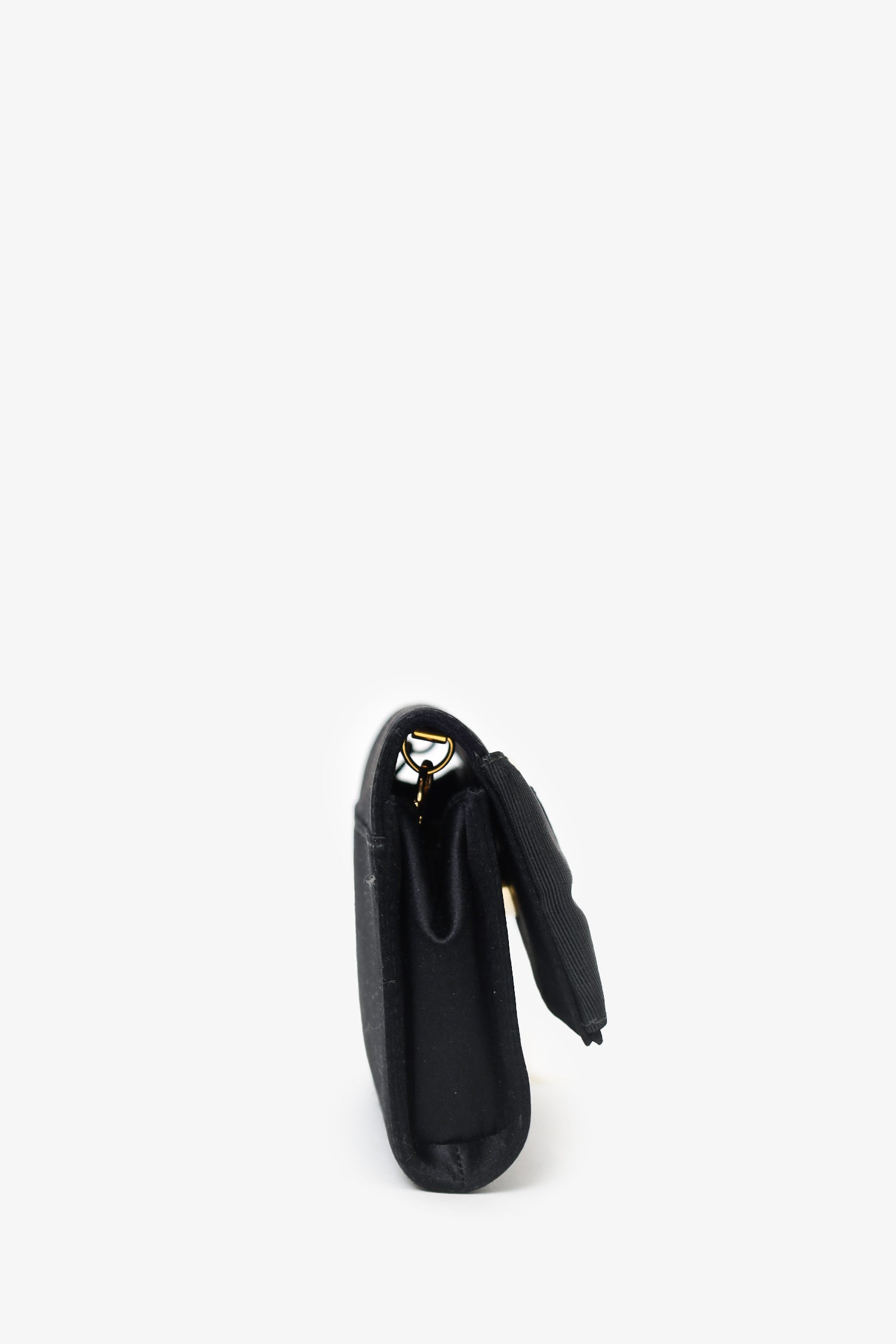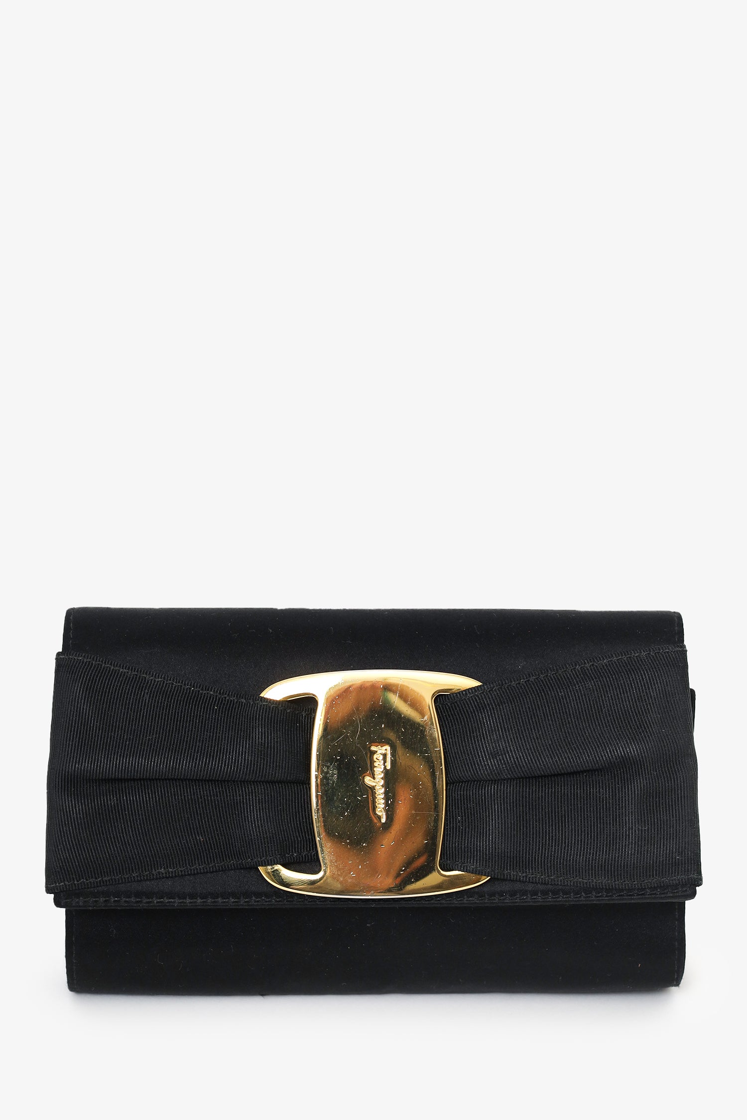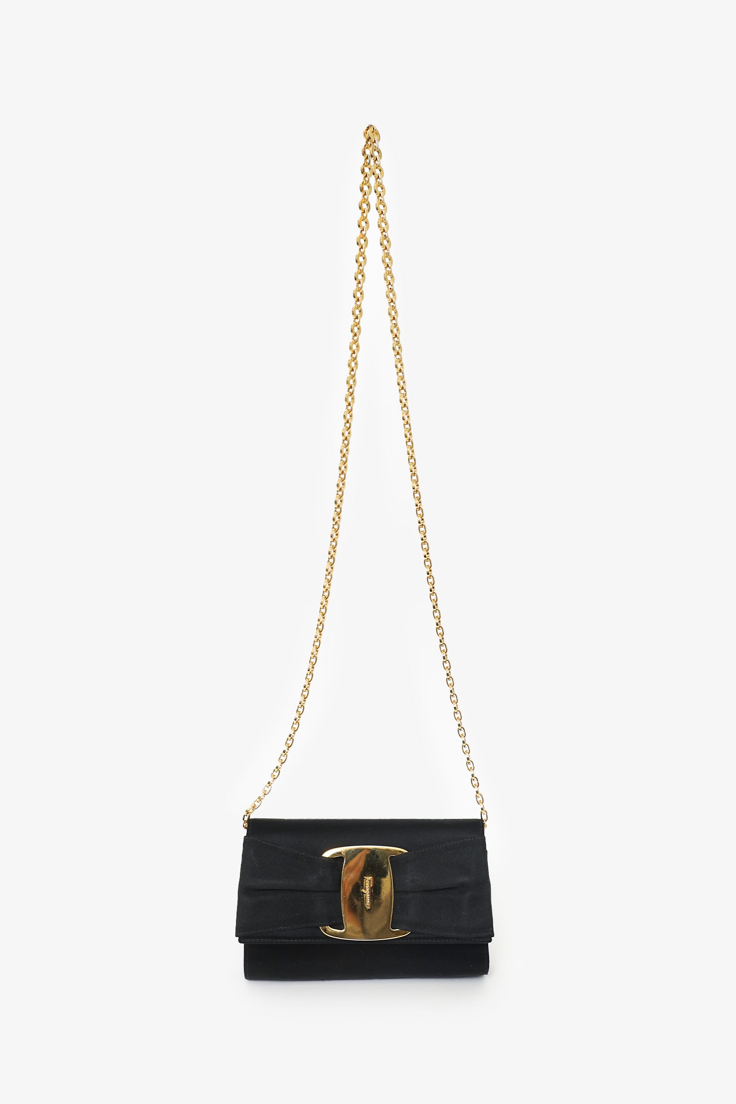 Refresh availabilitySalvatore Ferragamo Black Satin Bow Clutch With Chain. Front fold-over flap with magnetic snap closure. Removable chain crossbody strap. Lined interior. Gold-tone hardware. Tonal stitching.