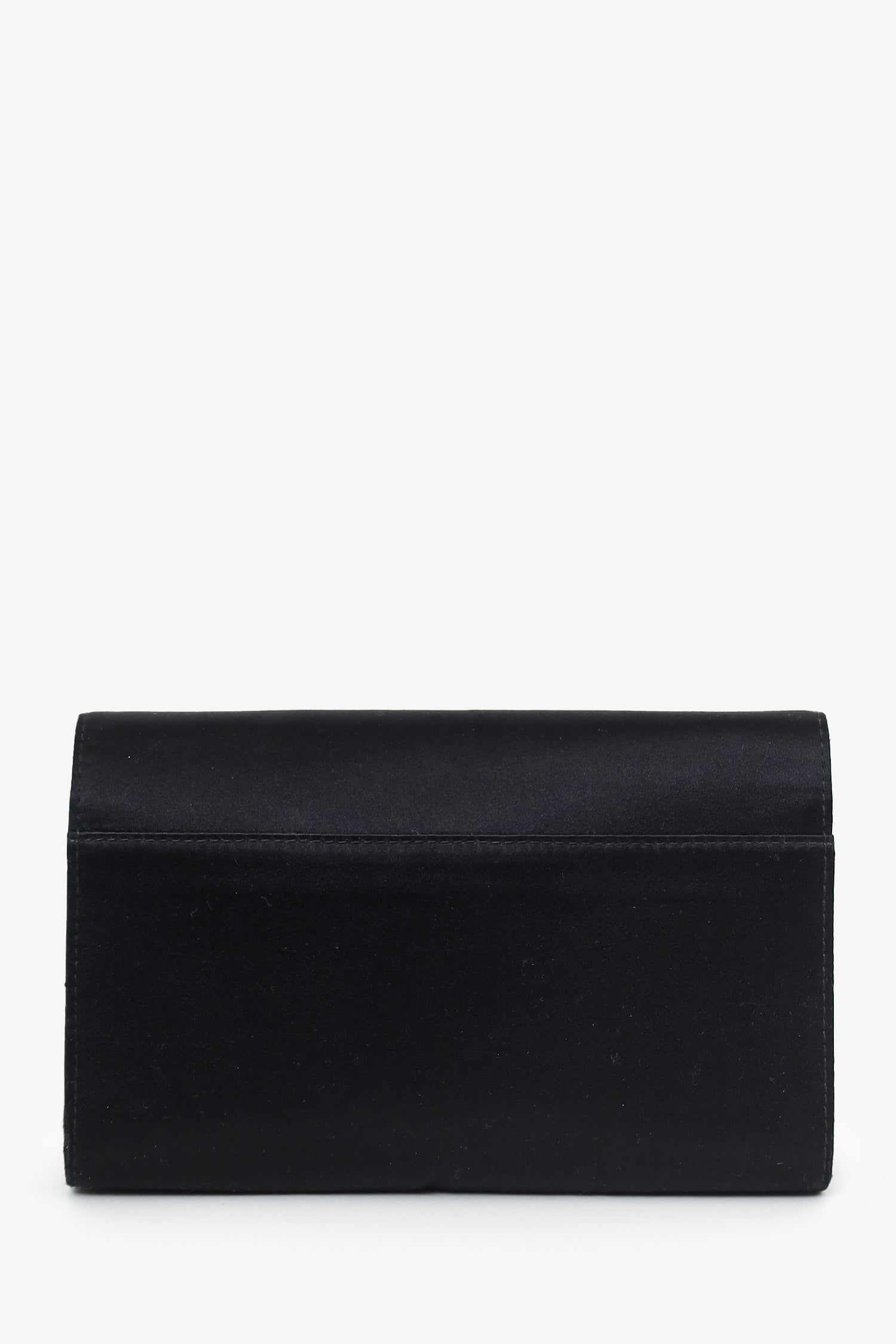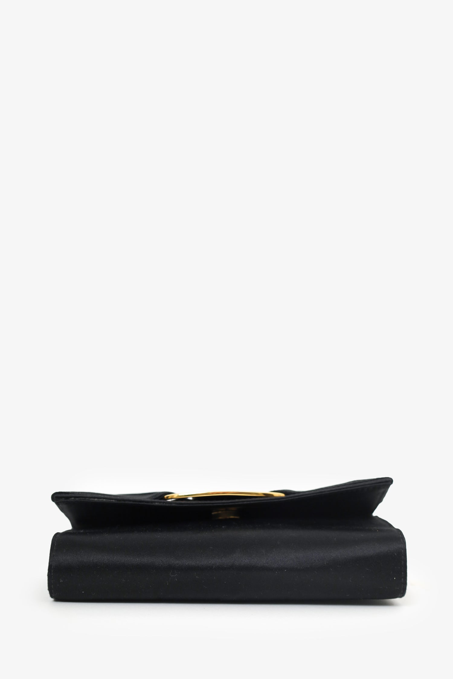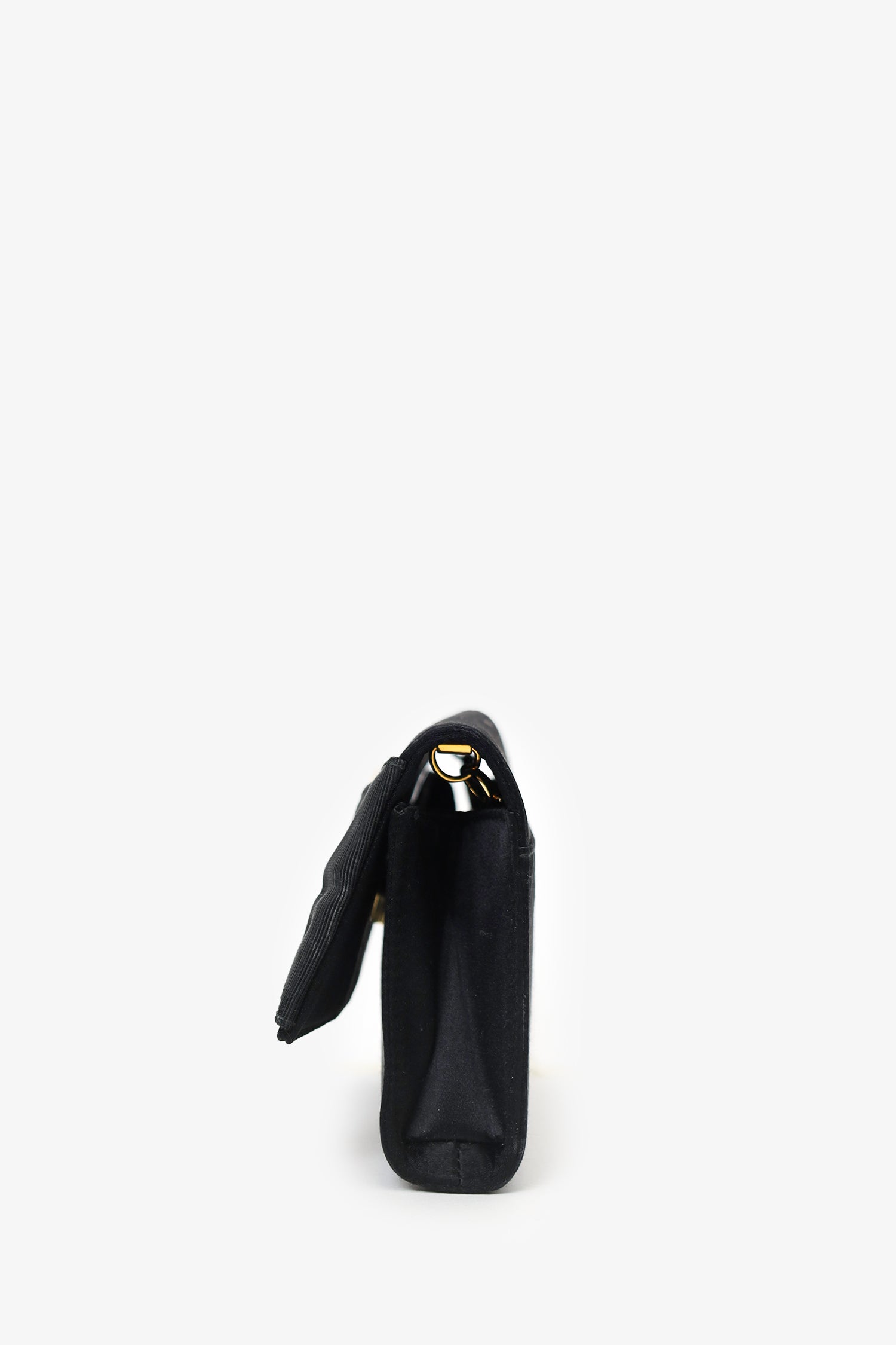 Refresh availabilitySalvatore Ferragamo Black Satin Bow Clutch With Chain. Front fold-over flap with magnetic snap closure. Removable chain crossbody strap. Lined interior. Gold-tone hardware. Tonal stitching.