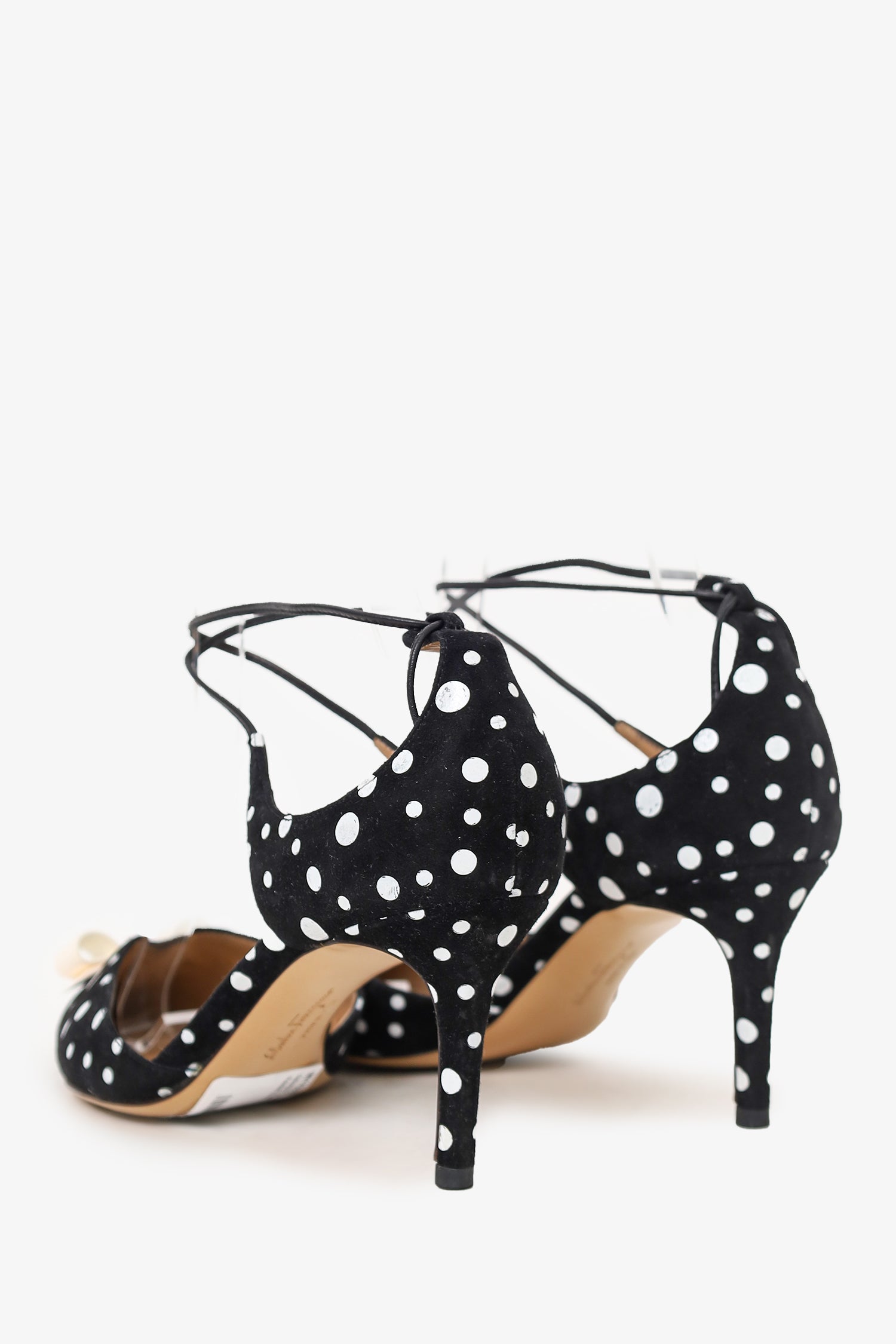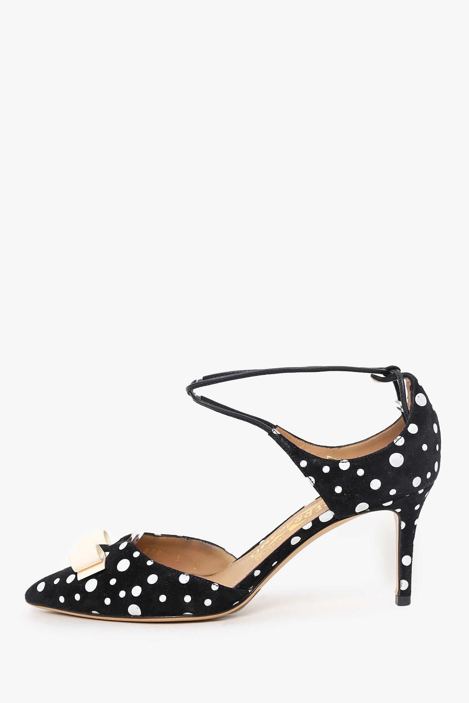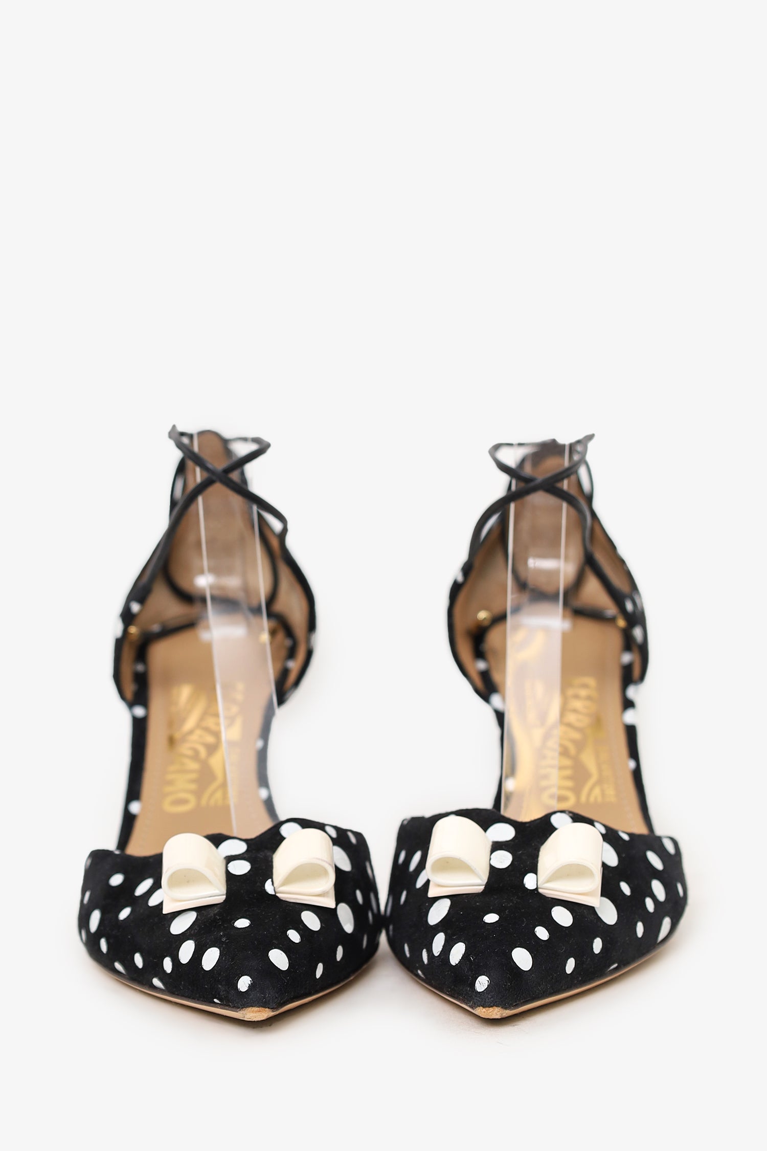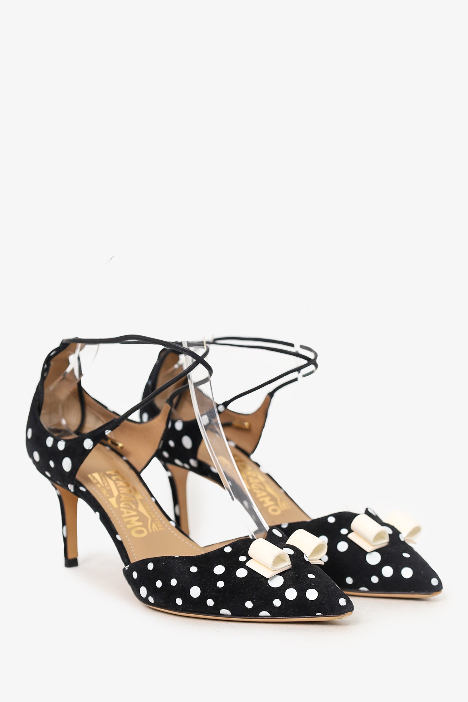 Refresh availabilitySalvatore Ferragamo Black/White Strappy Pointed Heels. Slip-on. Pointed-toe. Sling back ankle straps with tie-up closure. Bow details at toe. Silver-tone hardware. Tonal stitching.