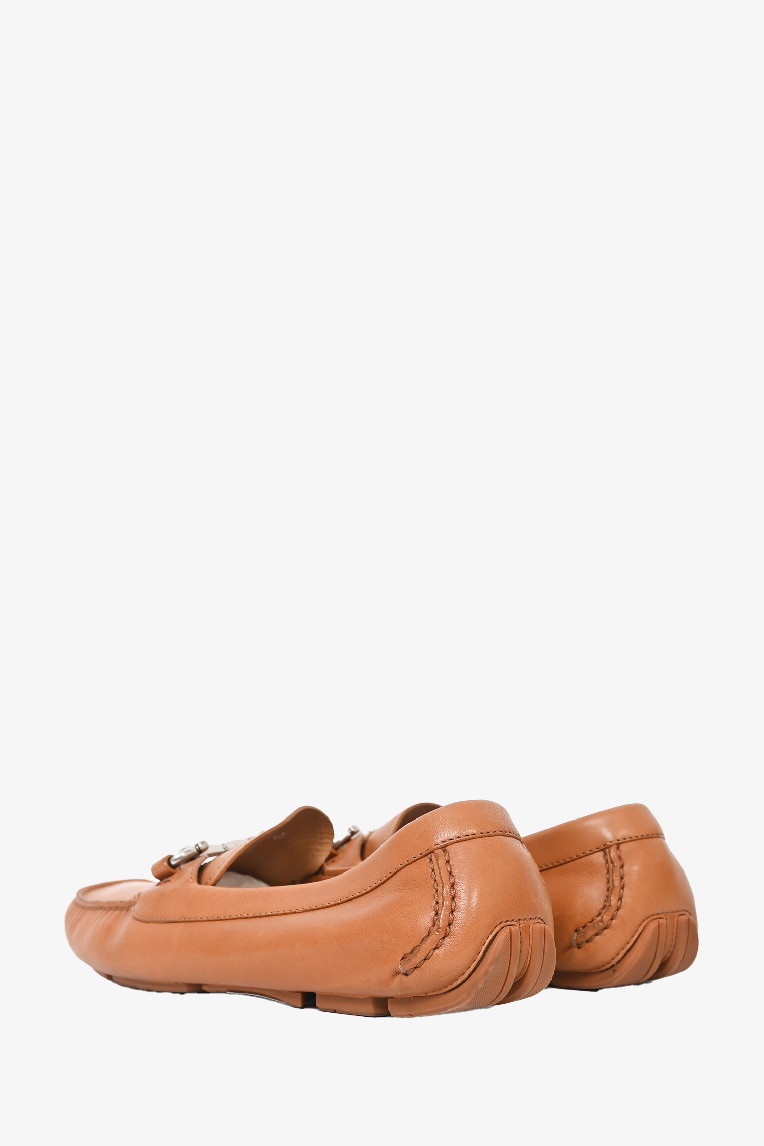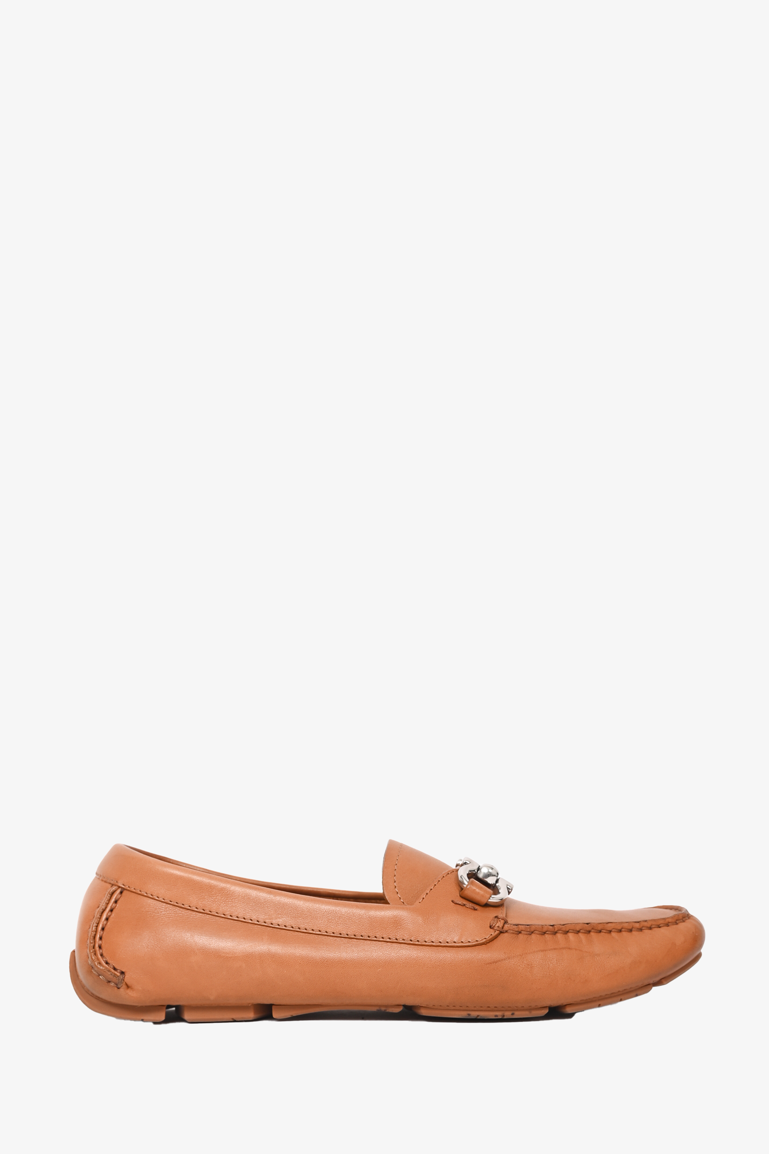 Refresh availabilitySalvatore Ferragamo Brown Leather Gancini Buckle Driving Shoes. Slip-on. Round toe. Rubber bottom soles. Silver-tone hardware. Tonal stitching.