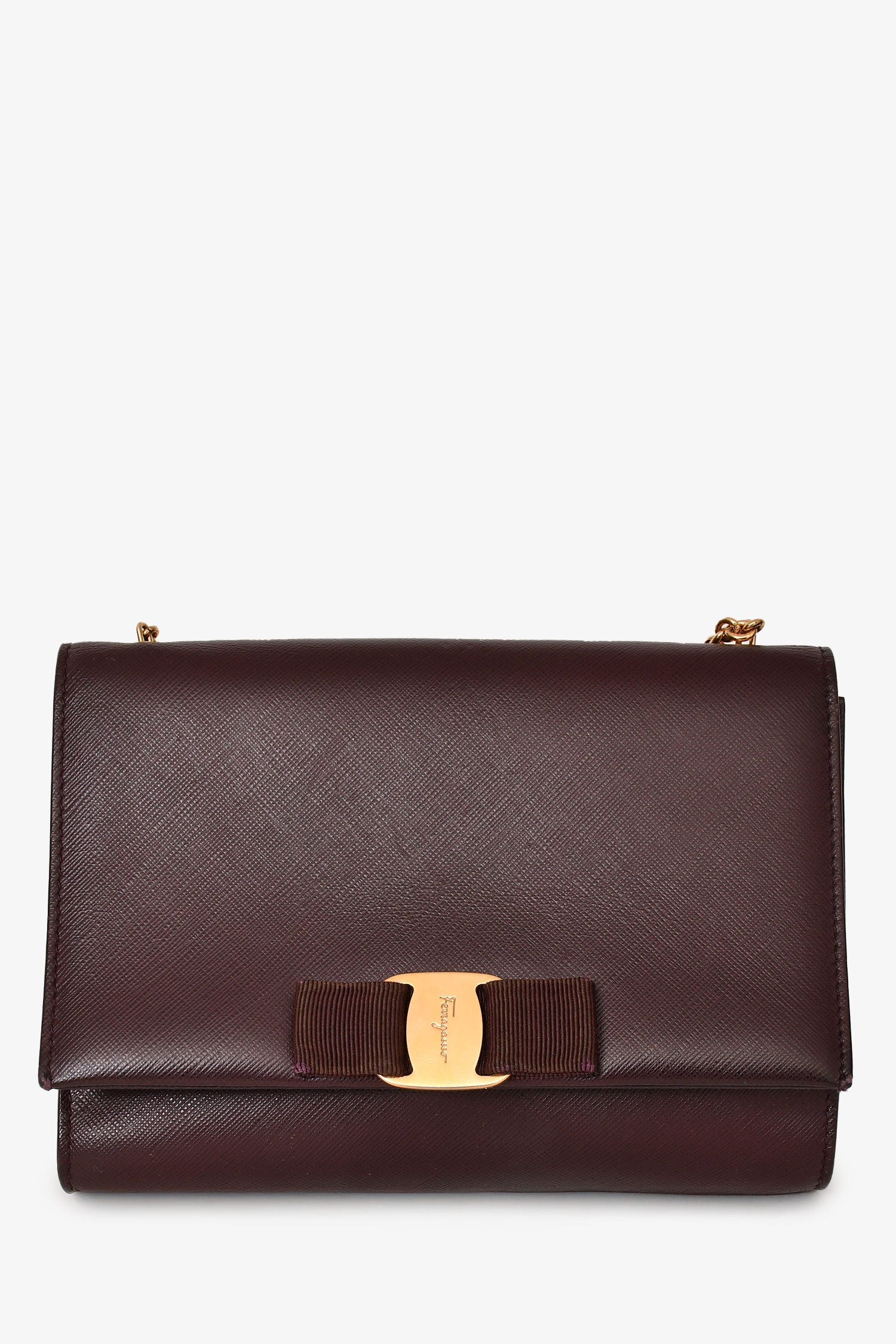 Refresh availabilitySalvatore Ferragamo Burgundy Leather Bow Crossbody. Front flap with bow and gold-tone logo plaque. Magnetic snap closure. Chain crossbody strap. Tonal stitching.