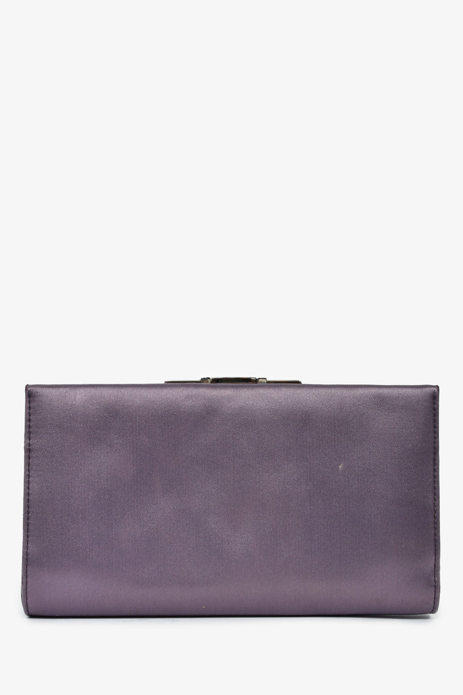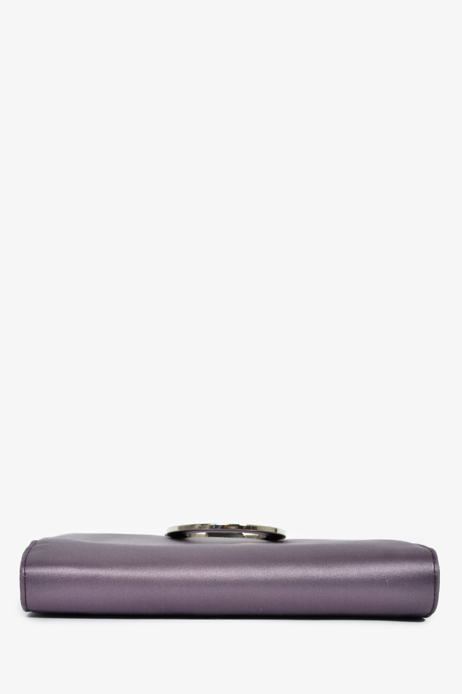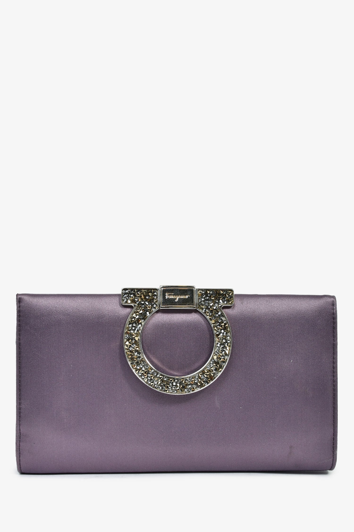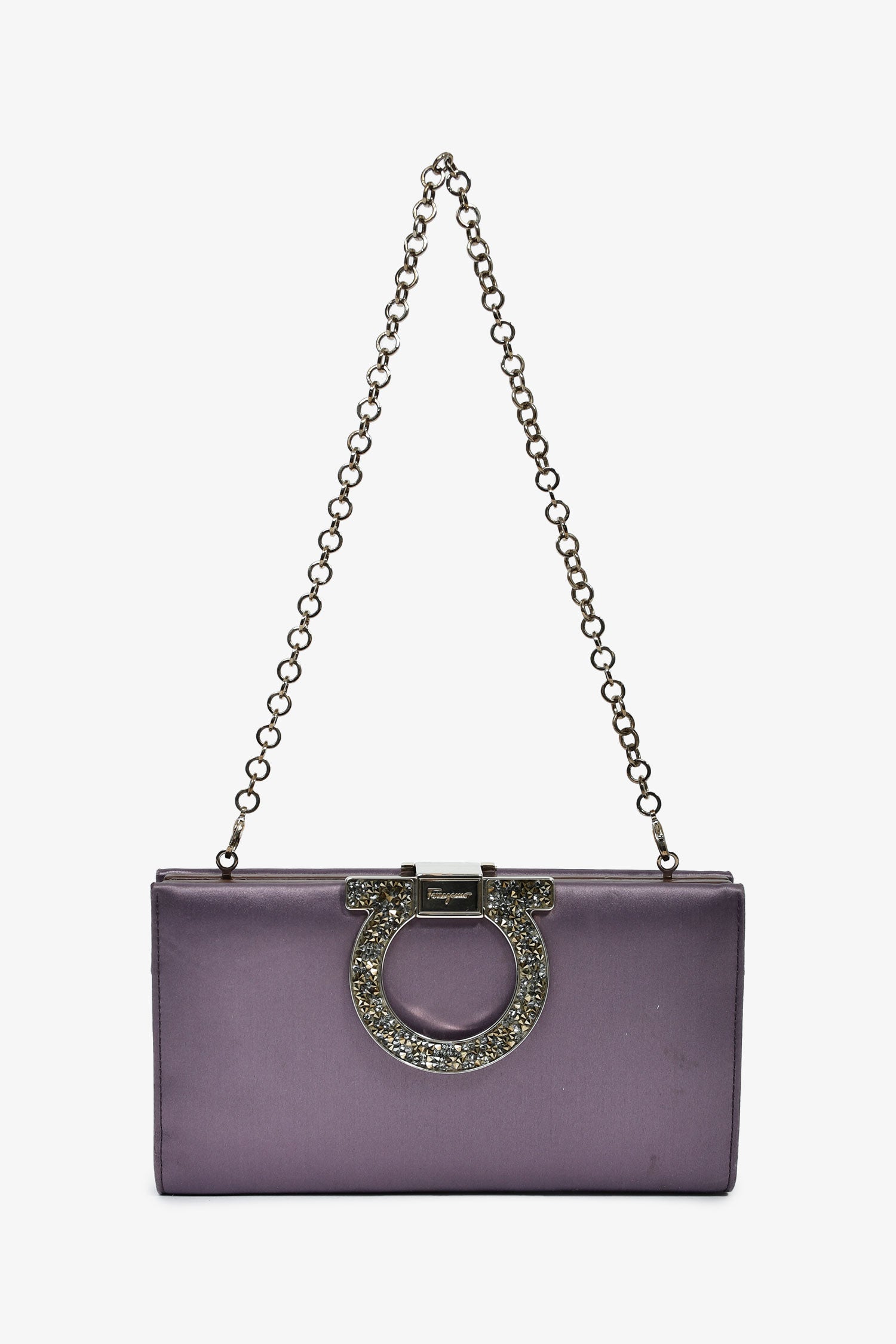 Refresh availabilitySalvatore Ferragamo Purple Satin Clutch with Chain. Top embellished flip-lock closure. Quilted textile interior lining. Single interior wall slip pocket. Non-adjustable detachable chain strap. Silver-tone hardware.