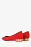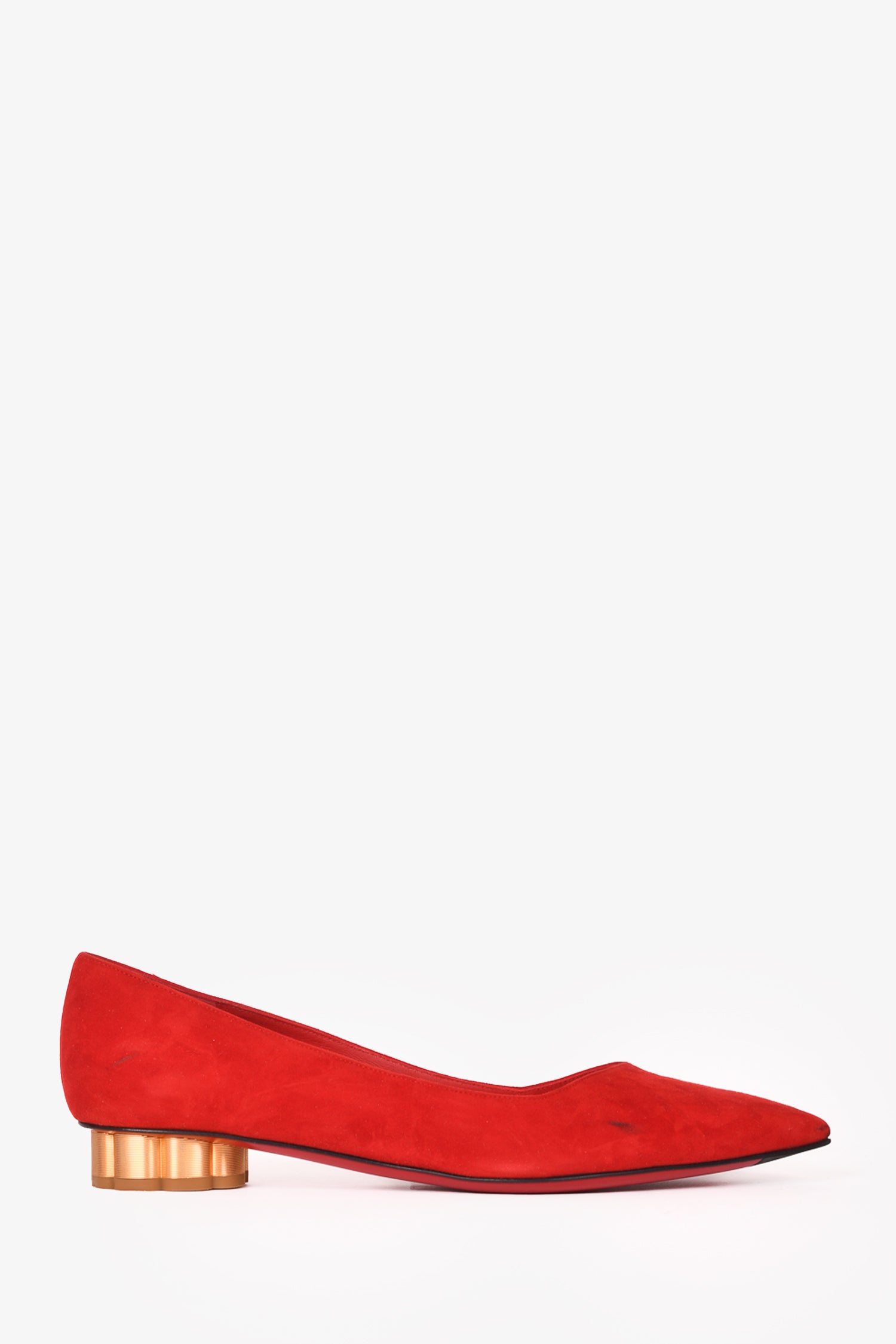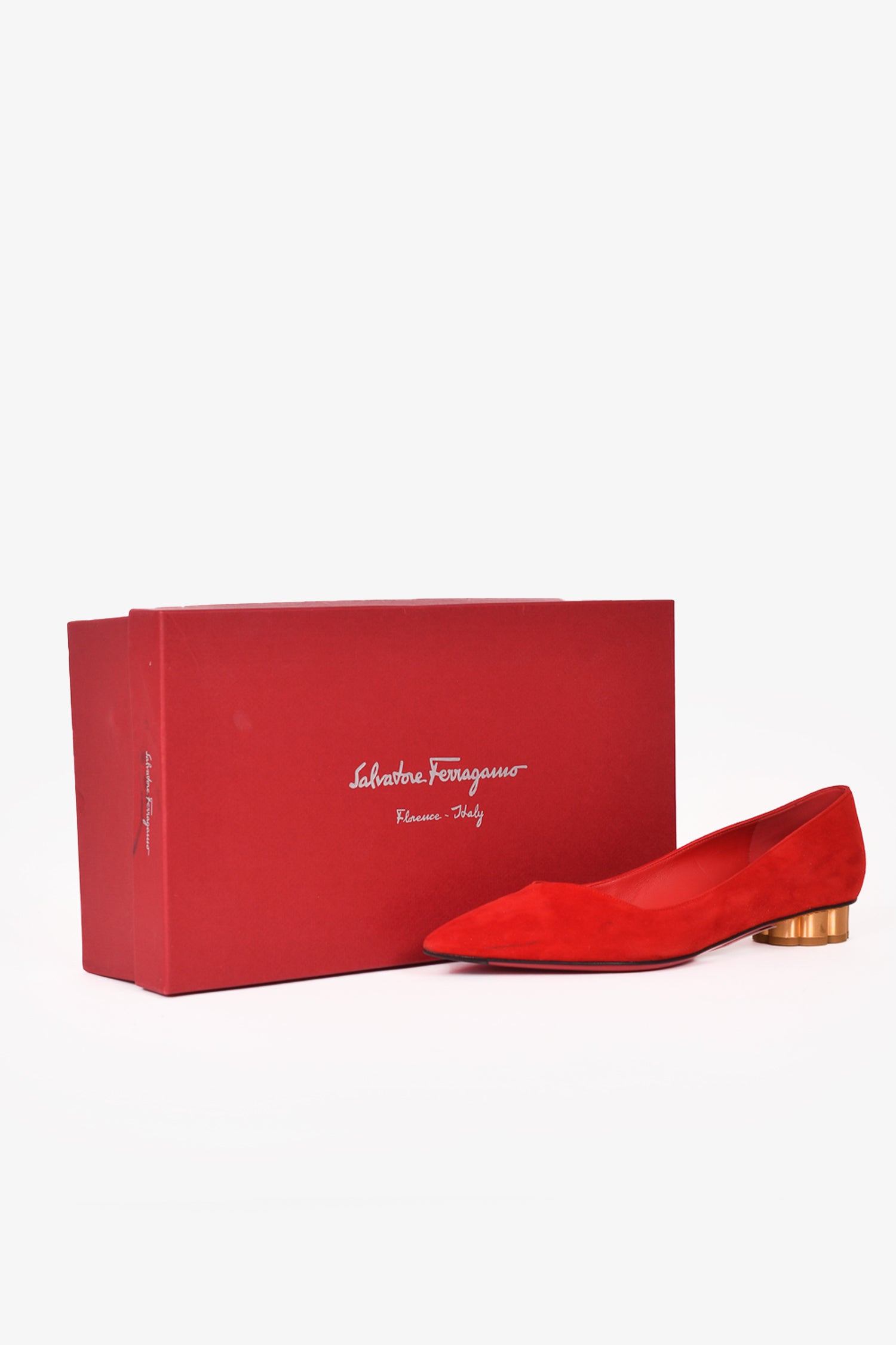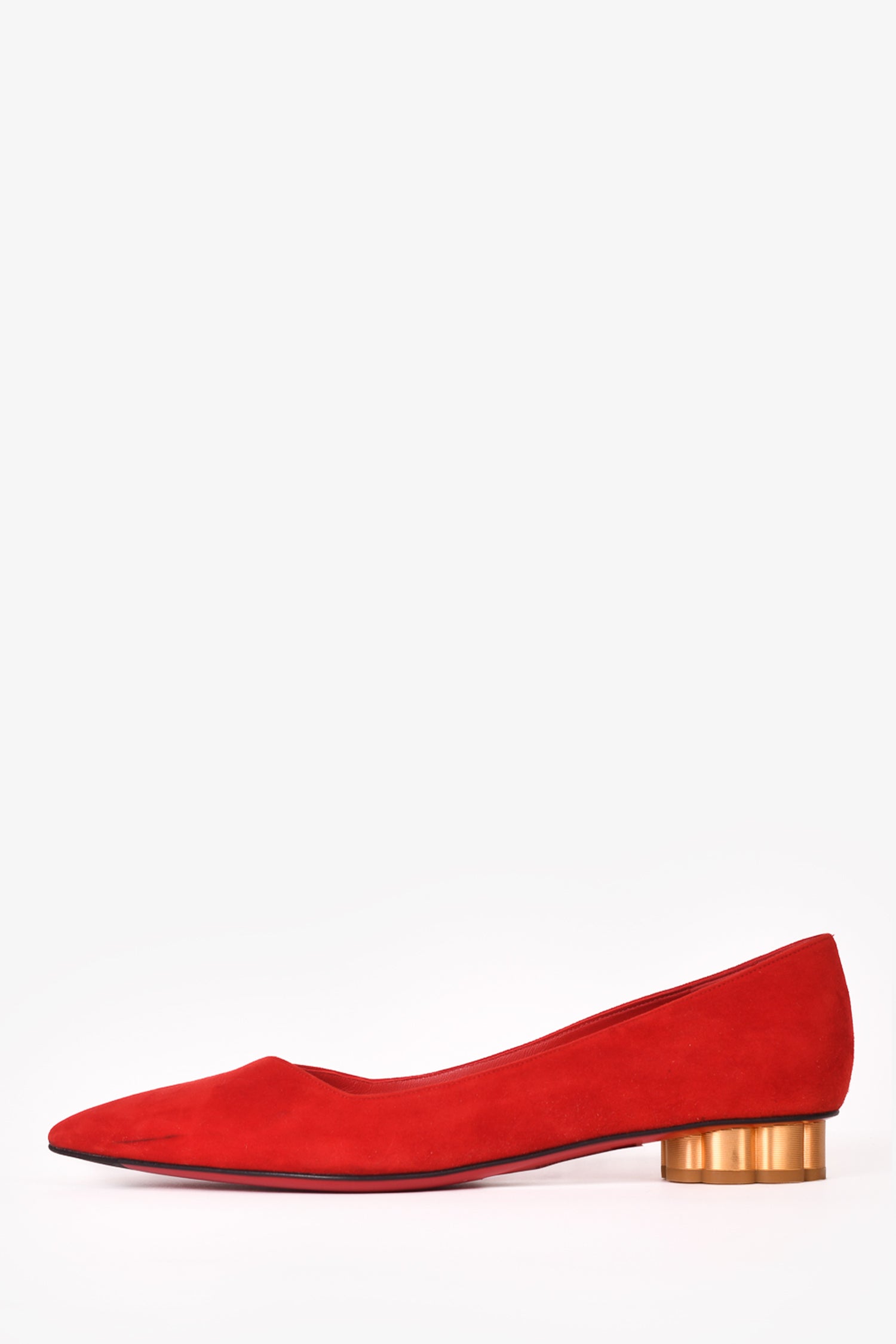 Refresh availabilitySalvatore Ferragamo Red Suede Leather Pointed Toe Flats. Slip-on. Contrasting gold heel. Tonal stitching.