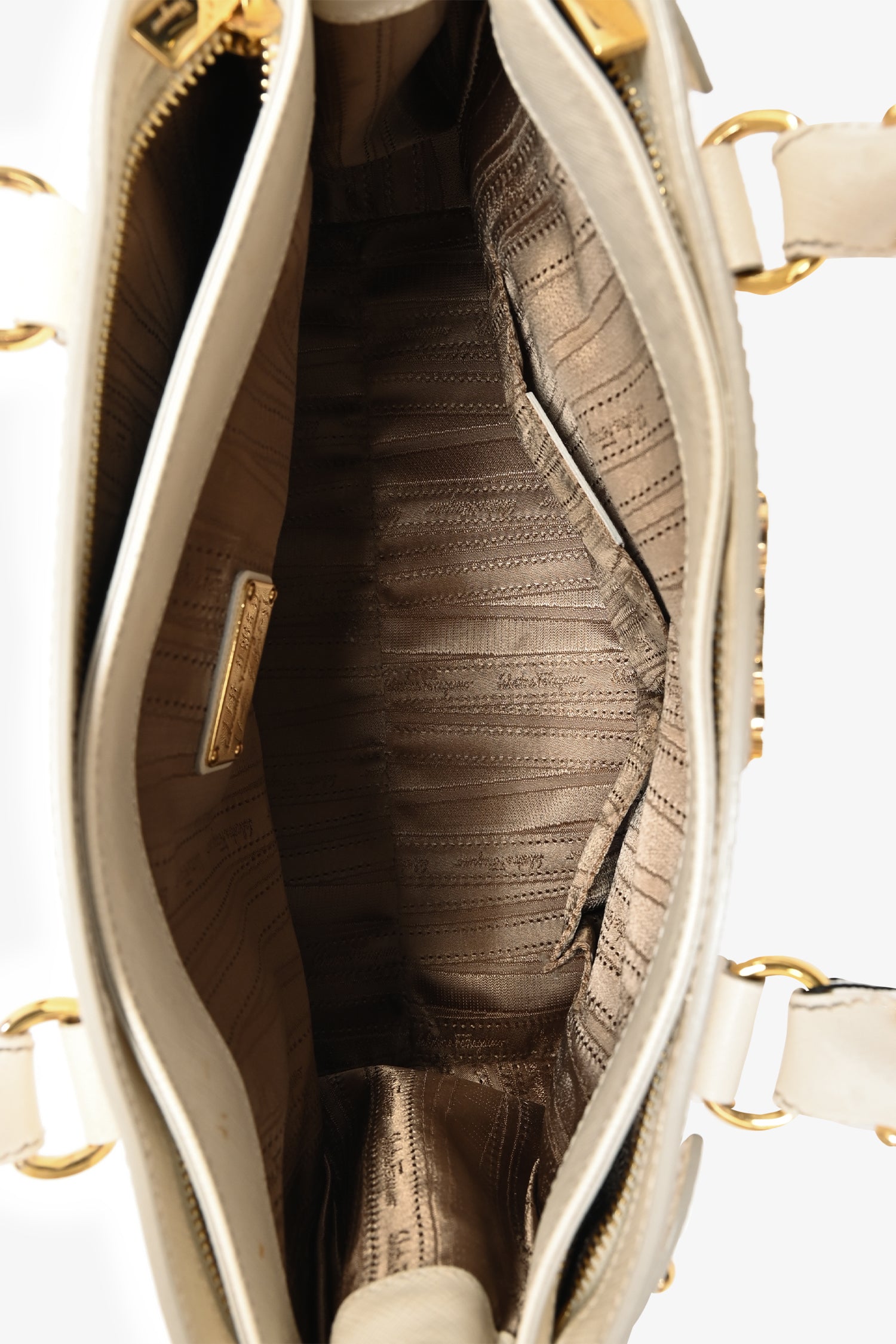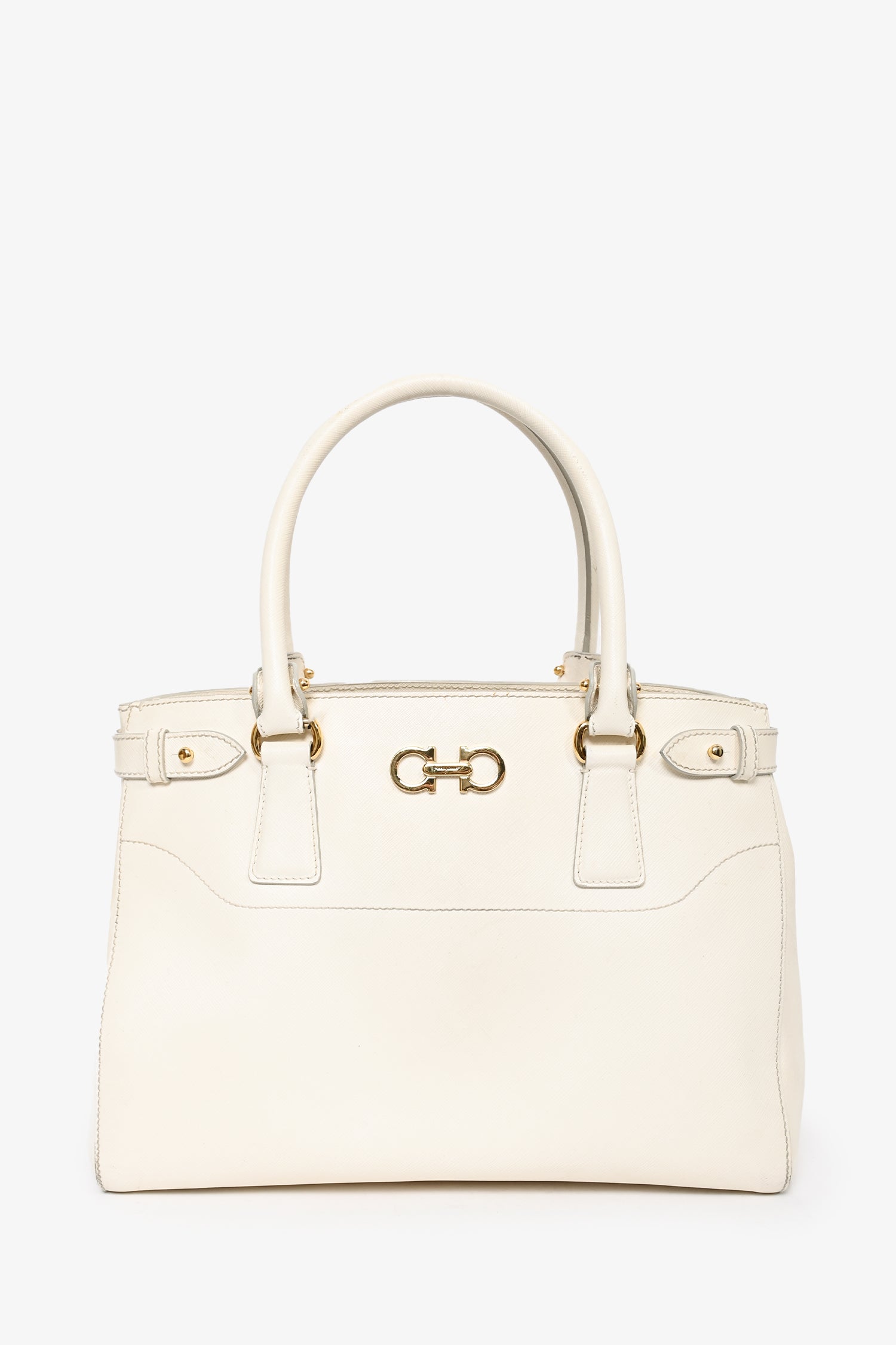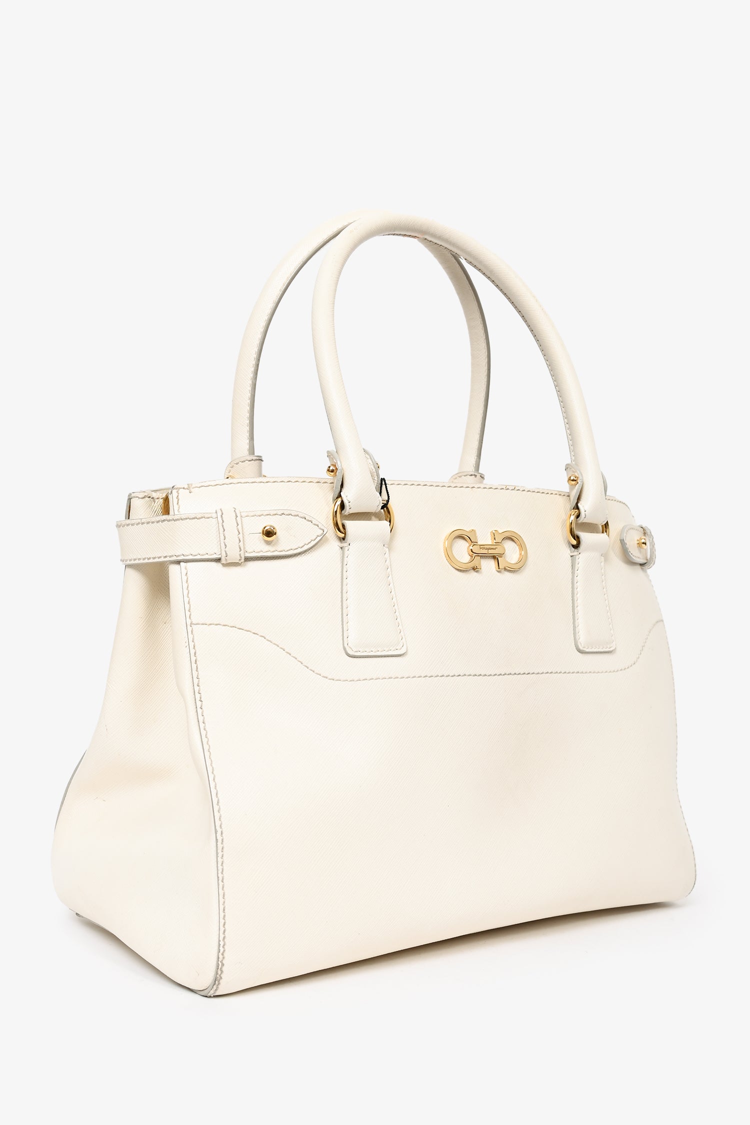 Salvatore Ferragamo White Leather Becky Top Handle with Strap. Dual rolled handles. 3 compartments; 2 zippered and 1 open. Light brown textile logo'd interior lining. 2 interior wall slip pockets. Removable and adjustable strap. Gold-tone hardware. Protective metal bottom. Tonal stitching.