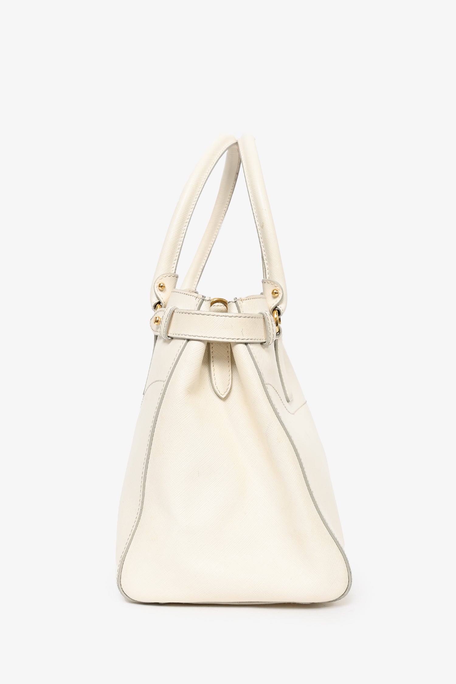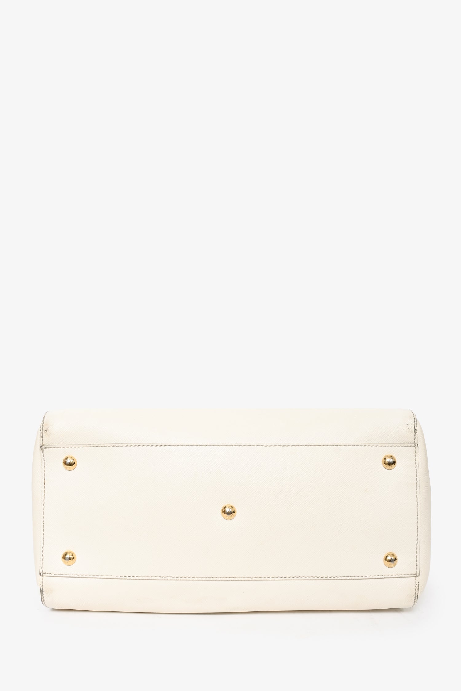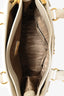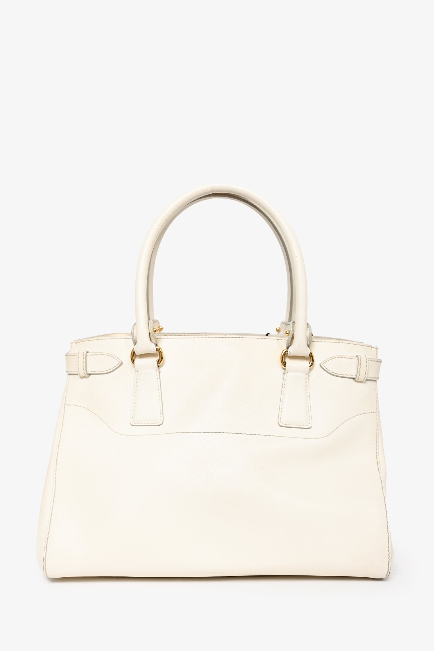 Salvatore Ferragamo White Leather Becky Top Handle with Strap. Dual rolled handles. 3 compartments; 2 zippered and 1 open. Light brown textile logo'd interior lining. 2 interior wall slip pockets. Removable and adjustable strap. Gold-tone hardware. Protective metal bottom. Tonal stitching.