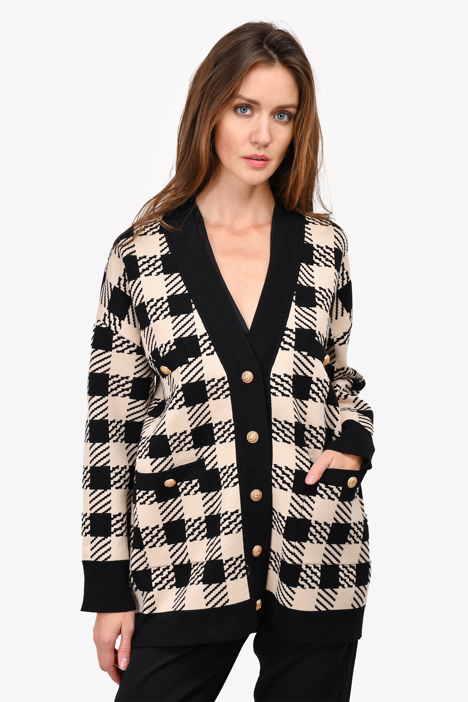 Refresh availabilitySandro Beige/Black Houndstooth Oversized Cardigan With Gold Buttons. Front button-up closure. Gold-tone hardware. Two front pockets.