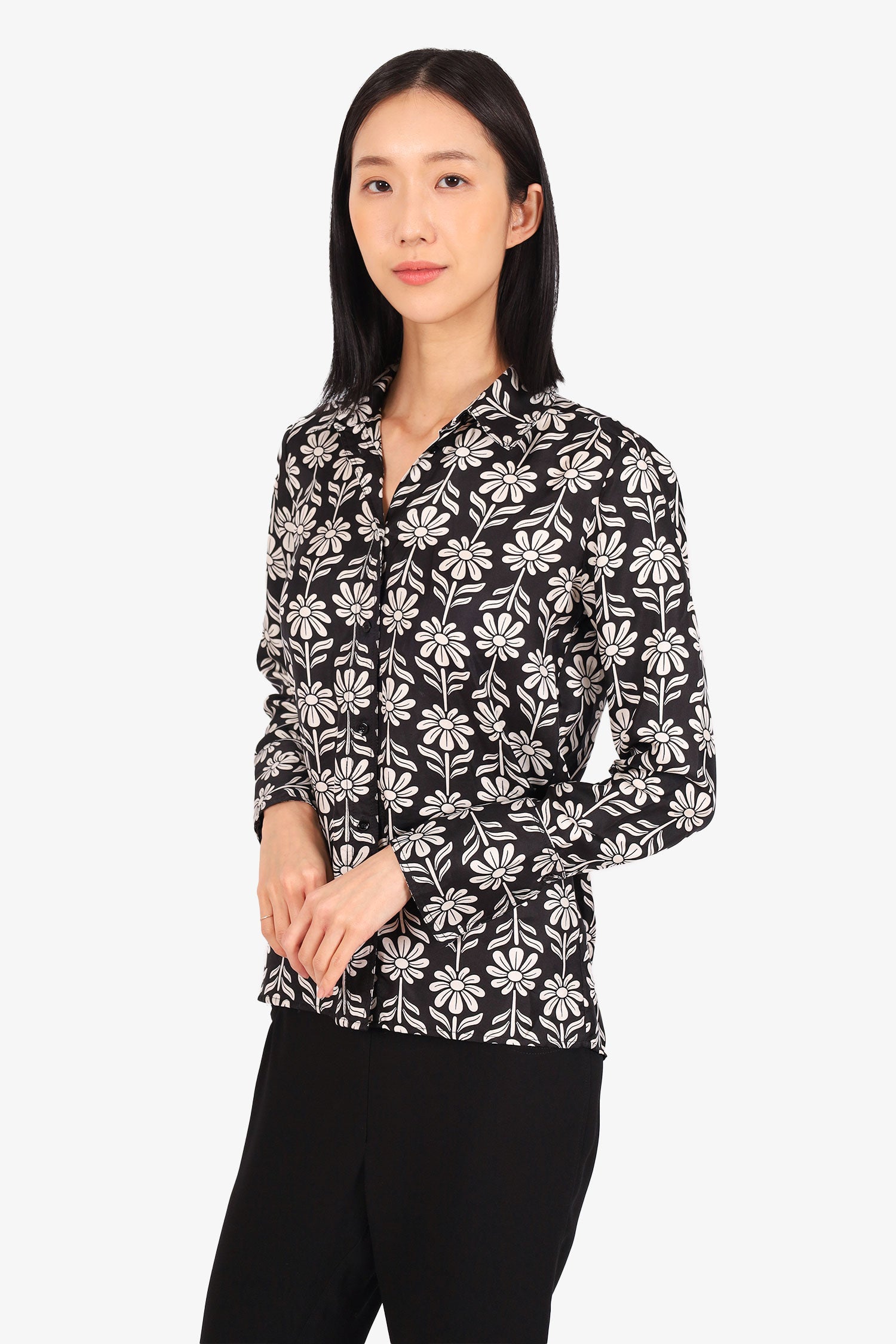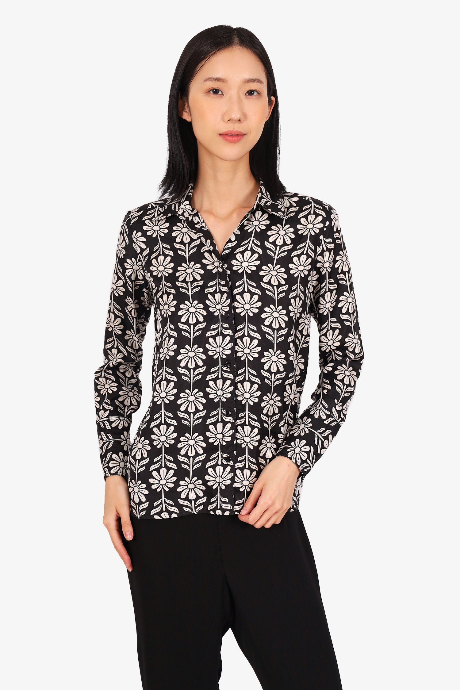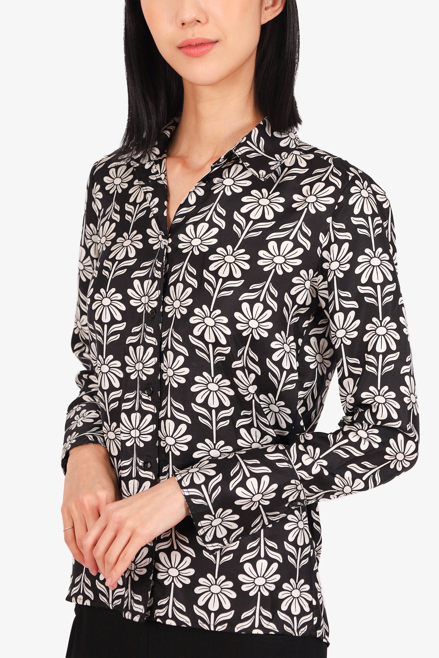 Refresh availabilitySandro Black/White Floral Print Button Up Blouse. Collared neckline. Front button-up closure. Button-up sleeve cuff closure. Unlined. Tonal stitching.