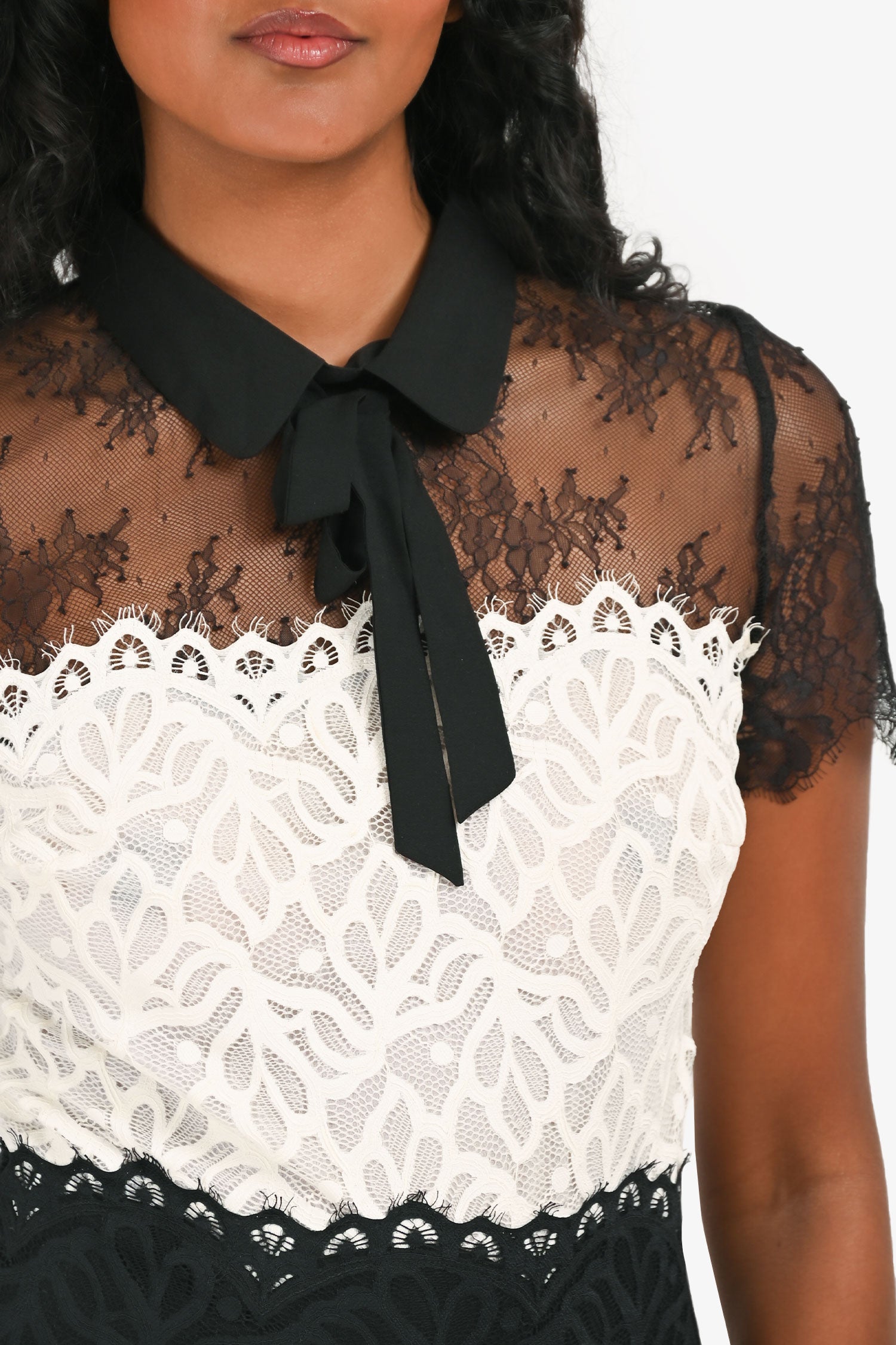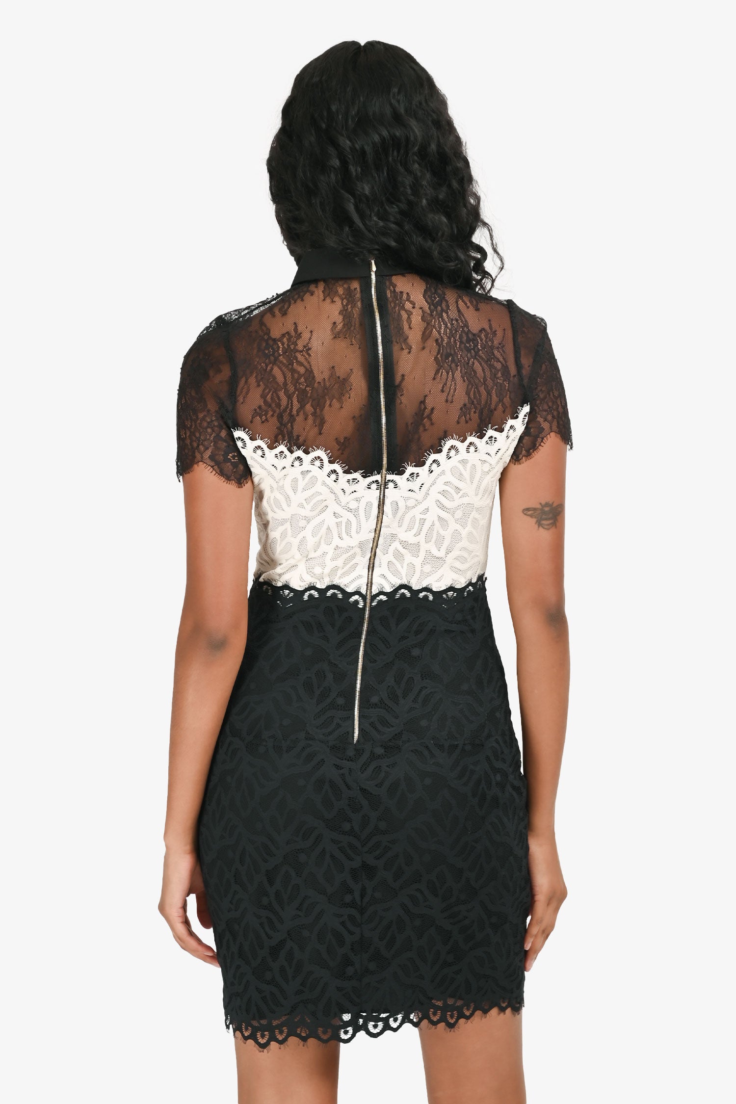 Refresh availabilitySandro Black/White Lace Collared Bow Dress. Lined. Lace panelling. Back zipper. Tonal stitching.