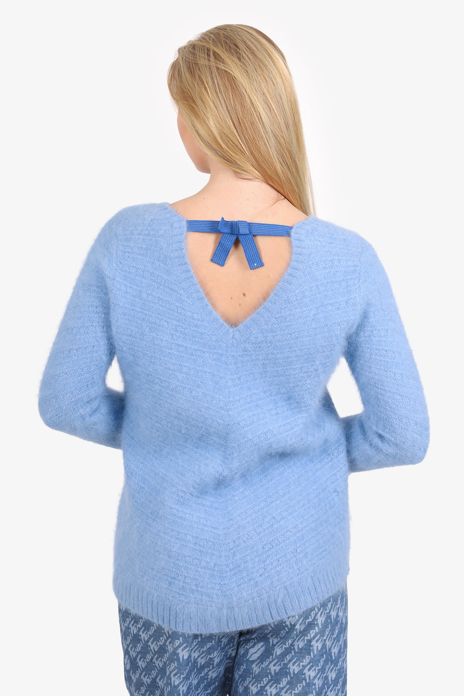 Refresh availabilitySandro Blue Angora V-Neck Sweater. Pull-on. Rear bow detail. Tonal stitching.