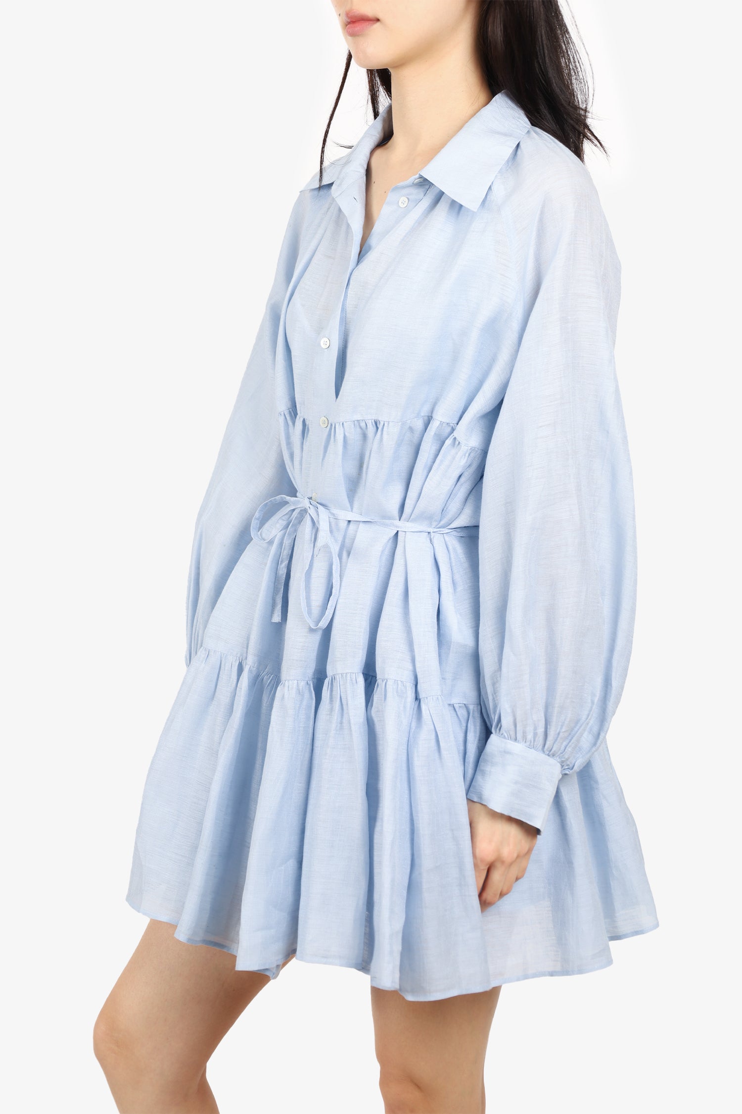 Refresh availabilitySandro Blue Tiered Button-Up Mini Dress with Slip. Front button-up closure. Collared neckline. Waist tie. Lined. Tonal stitching.