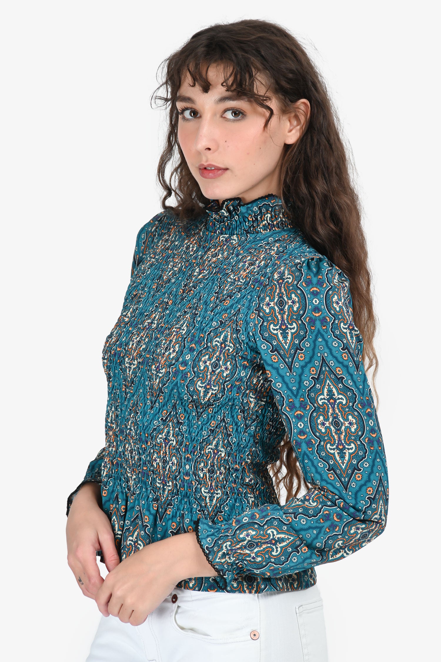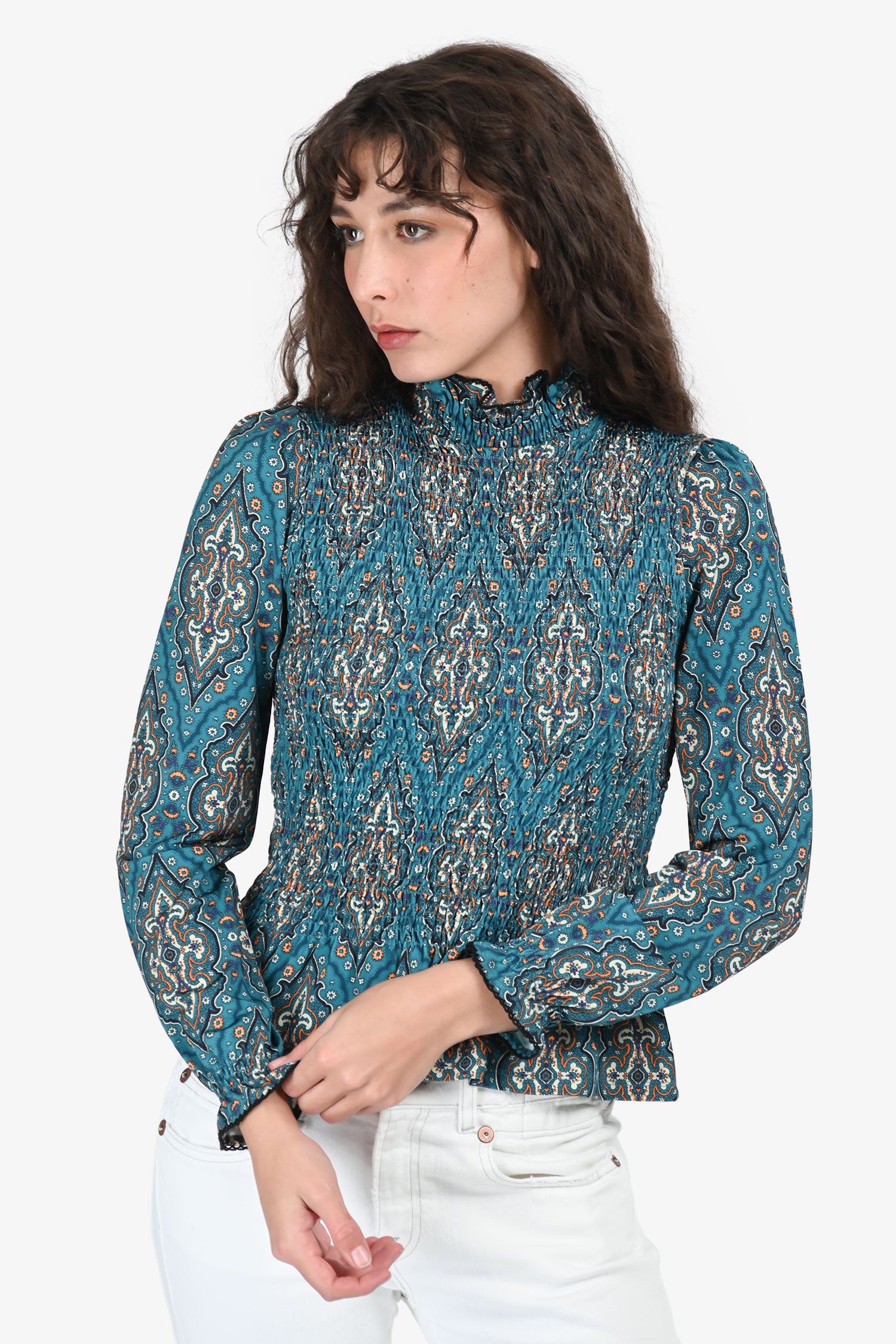 Refresh availabilitySandro Blue Paisley Ruched Top. Pull-on. Raised, ruched collar. Tonal stitching.