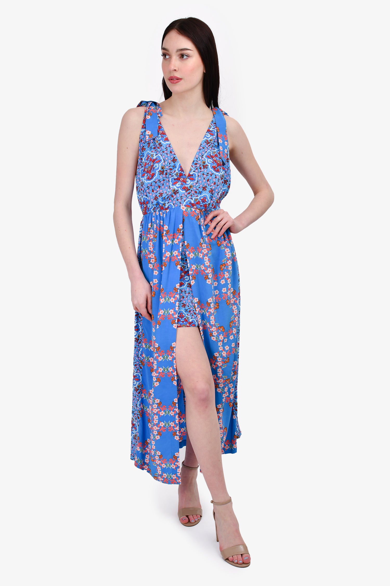 Refresh availabilitySandro Blue/Pink Floral Print Maxi Dress. Rear zip closure. V-neck. Tie-up straps. Tonal stitching.