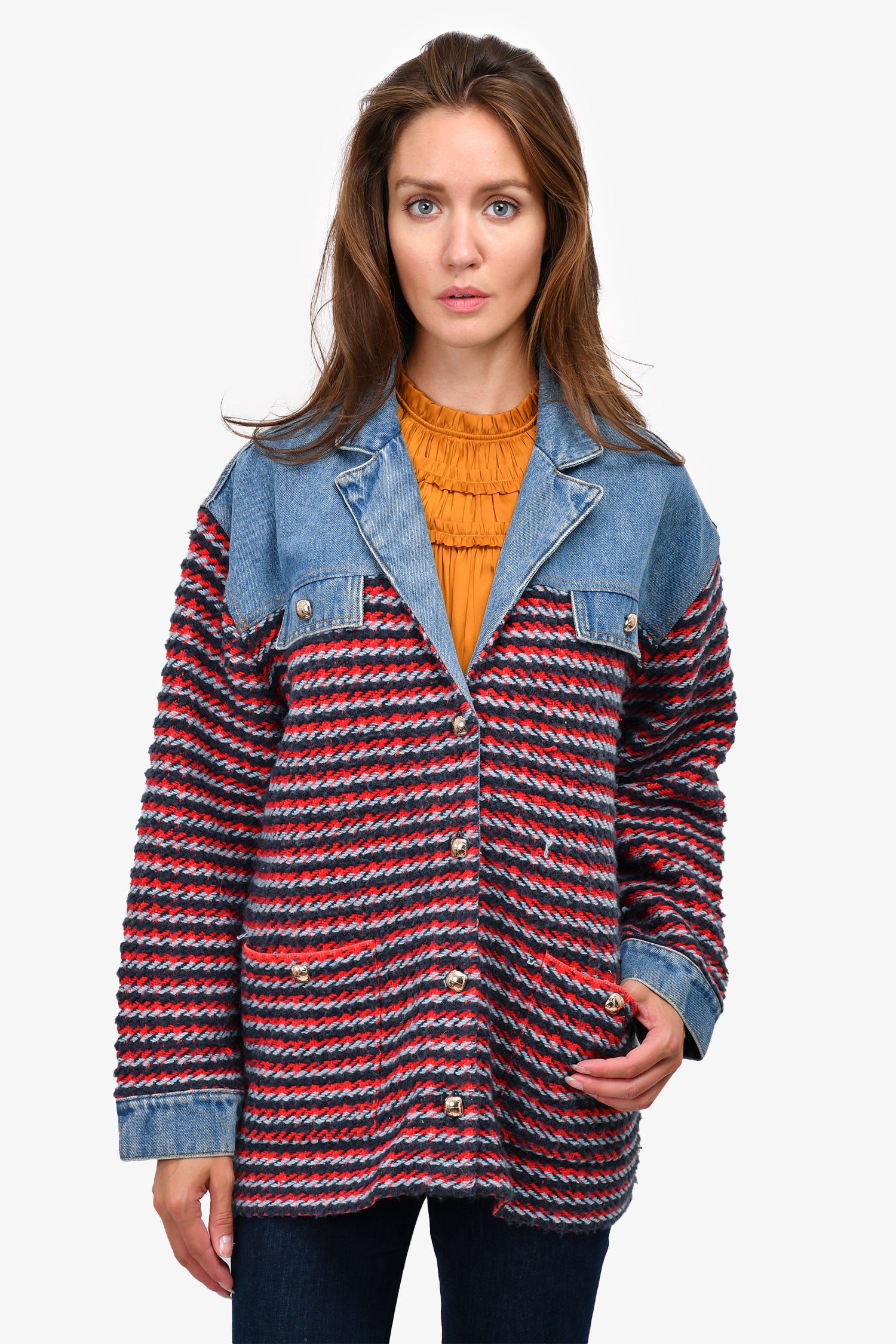 Refresh availabilitySandro Blue/Red Denim Striped Knit Detailed Jacket. Front button up closure. Tonal stitching.