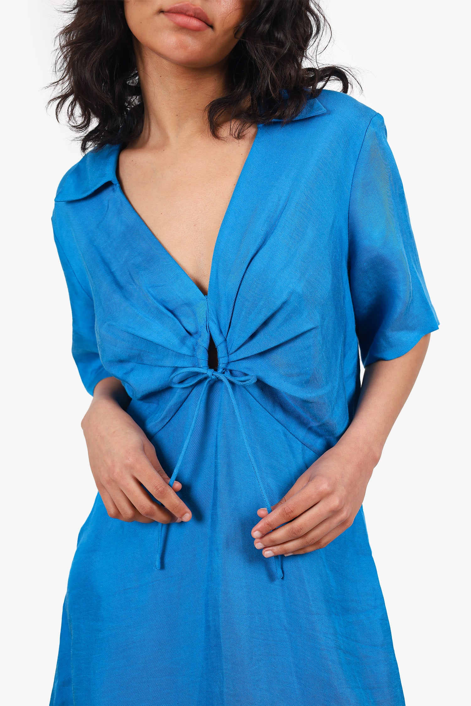 Refresh availabilitySandro Blue V-Neck Key-Hole Midi Dress. Pull-on. Collared v-neckline. Front keyhole with tie-up closure. Tonal stitching.